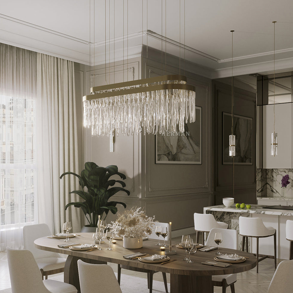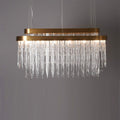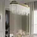The myth is shaped into a luxury lighting suspension and presented in every handmade crystal glass. The rectangular gold-plated brass levels conceive an exclusive pattern of lighting refraction and create fantastical shades on their surroundings. Designed to brighten a contemporary space with the most elegant presence.