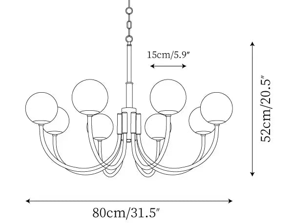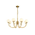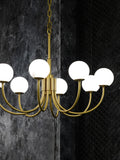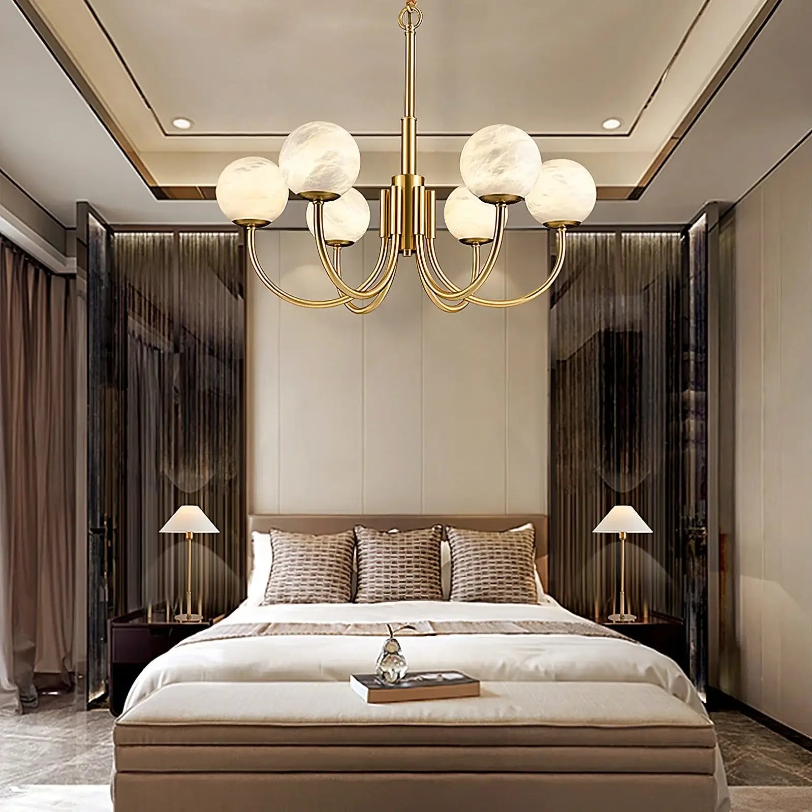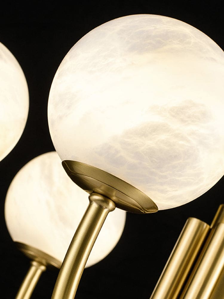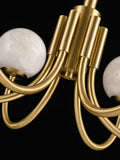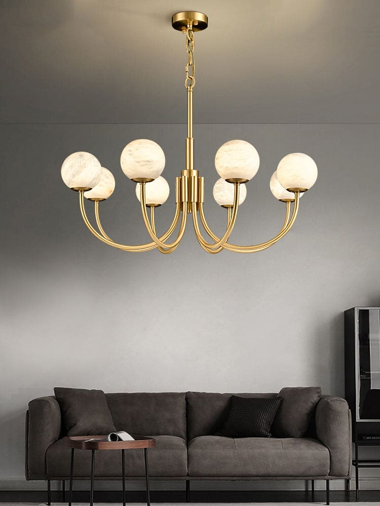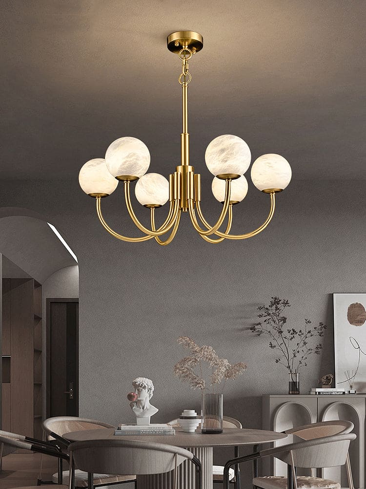 Make a statement with your lighting. Our Brass Alabaster Round Chandelier is crafted from solid brass and features elegantly curved arms and modern globe shades. Its combination of craftsmanship and design creates a warm and balanced glow. This chandelier is more than just a light fixture - it's a striking work of art that adds radiance and equilibrium to any space.