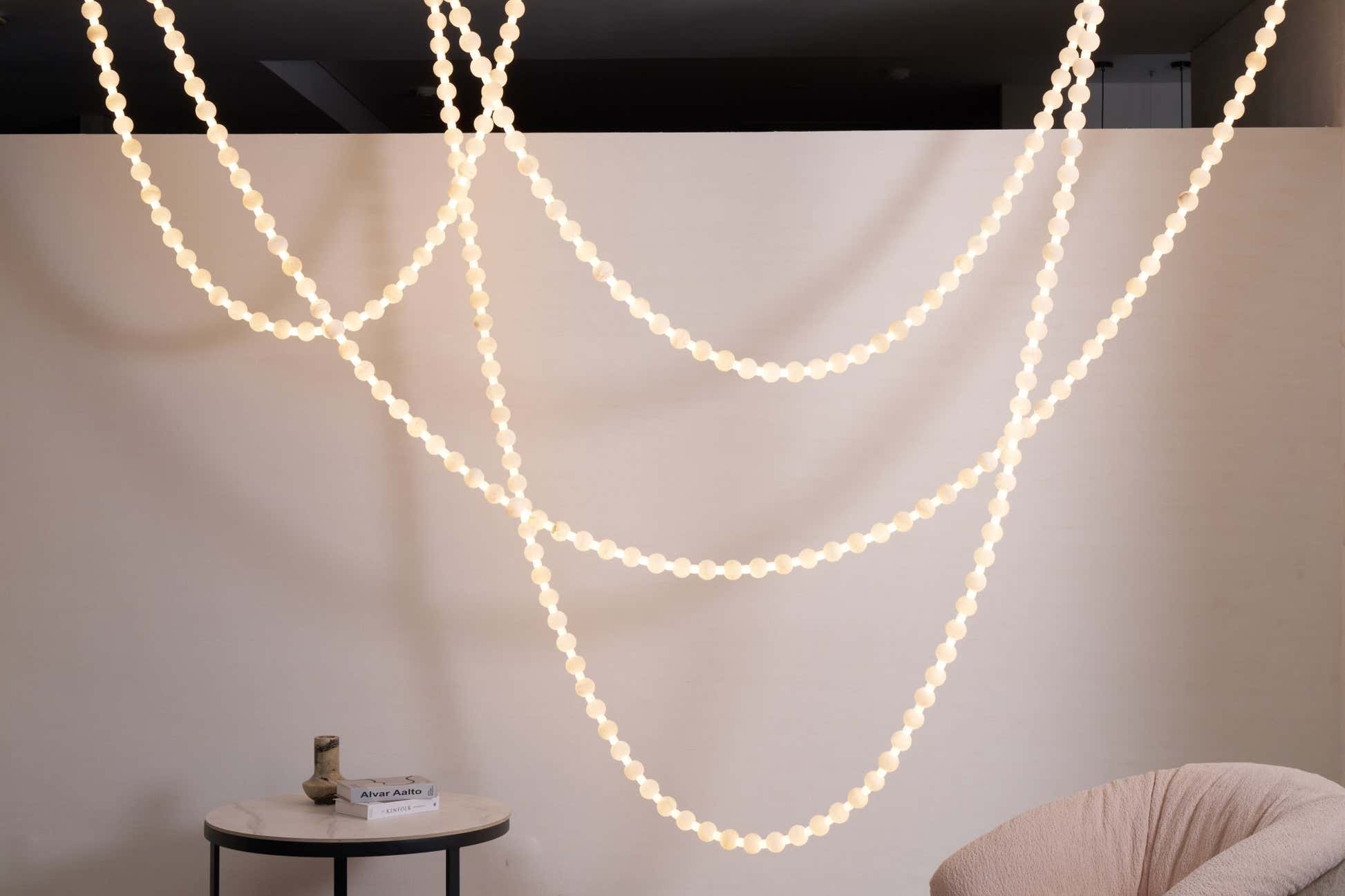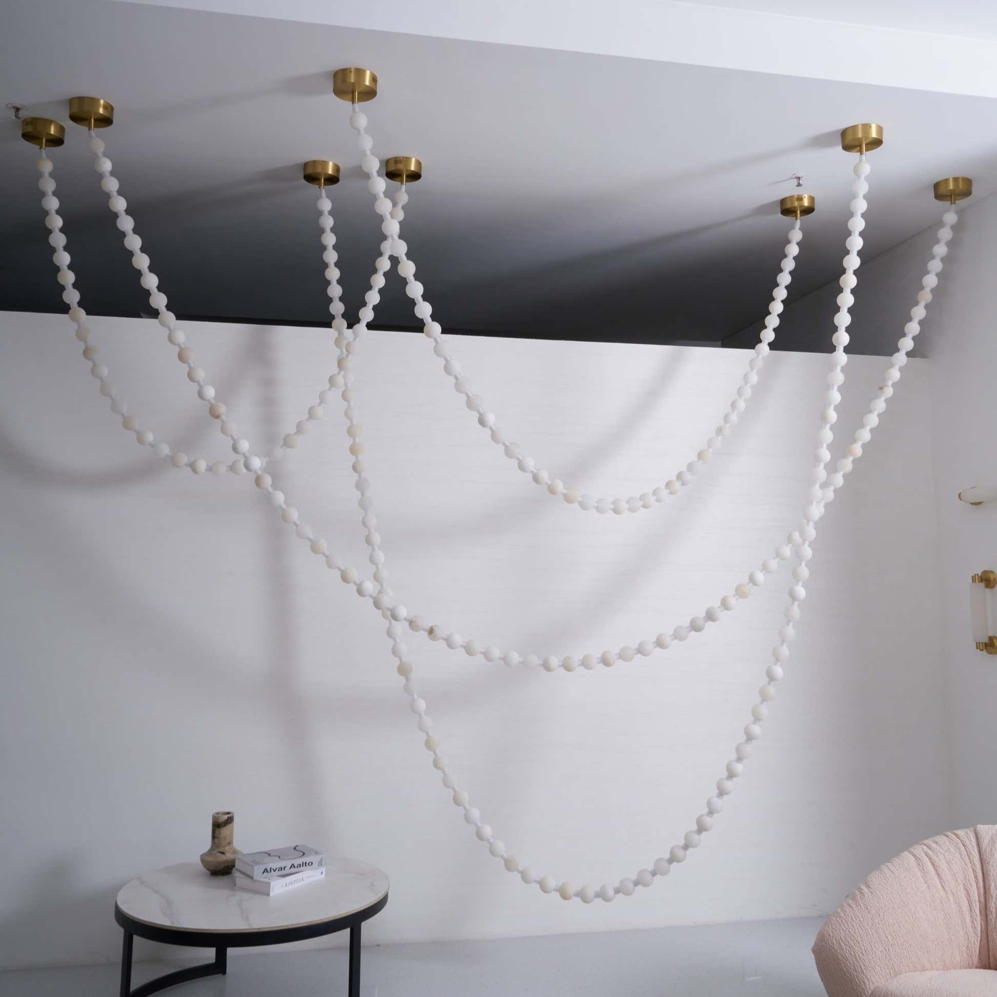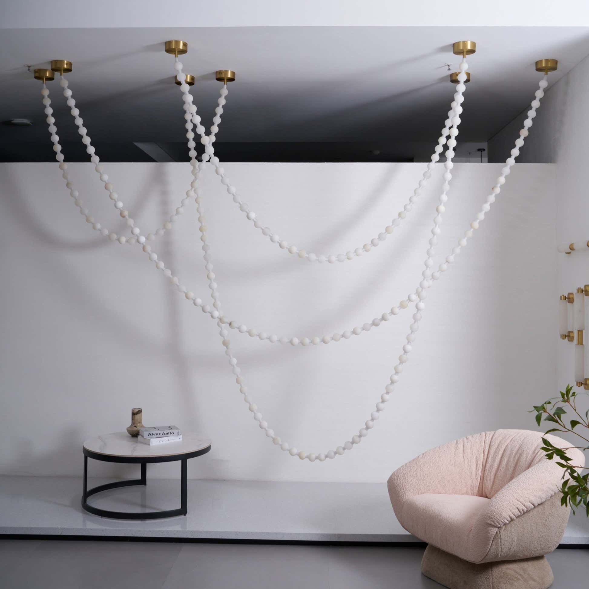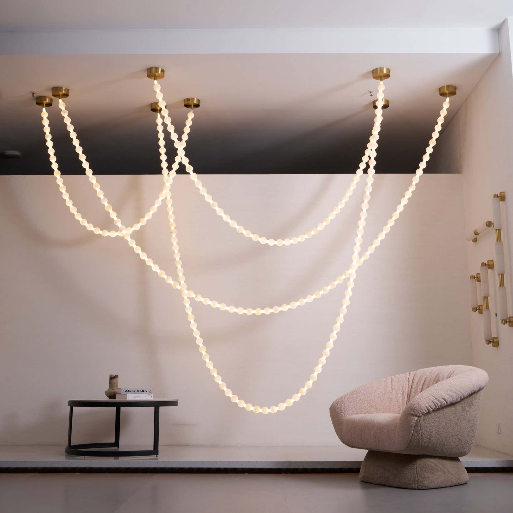 The Alabaster Pearl Necklace Chandelier by Hermanlamps is a breathtaking fusion of sculptural design and refined elegance. Featuring cascading strands of alabaster-like beads, this chandelier mimics the flowing beauty of a pearl necklace draped effortlessly across the ceiling. Each glowing orb casts a warm, diffused light, creating a soft, ambient atmosphere while making a striking visual statement. Anchored by minimalist brass mounts, the flexible arrangement allows for artistic customization in layout and shape. Ideal for luxurious living rooms, grand foyers, or curated retail spaces, this piece embodies Hermanlamps’s dedication to poetic form and timeless craftsmanship.
