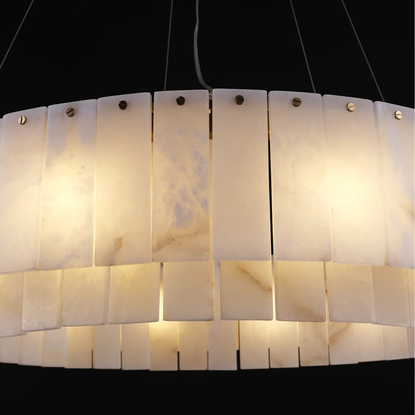 This alabaster chandelier is crafted from natural marble imported from Spain, where intricate patterns evolve over time, resulting in a distinctive and beautiful design. Each marble chandelier boasts a unique pattern, carefully selected and polished for durability. With strong light transmission and a non-glare effect, it emanates a gentle, bright light, creating an ambiance of subtle radiance.