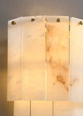 A striking blend of natural luxury and contemporary design, this marble wall lamp casts a warm, diffused glow through its cascading layers of translucent stone. Each alabaster panel showcases organic veining, ensuring a unique, one-of-a-kind look. Suspended from a sleek black metal frame with copper accents, this semi-flush mount fixture is ideal for low to mid-height ceilings, adding an elegant focal point to dining rooms, living spaces, or entryways.