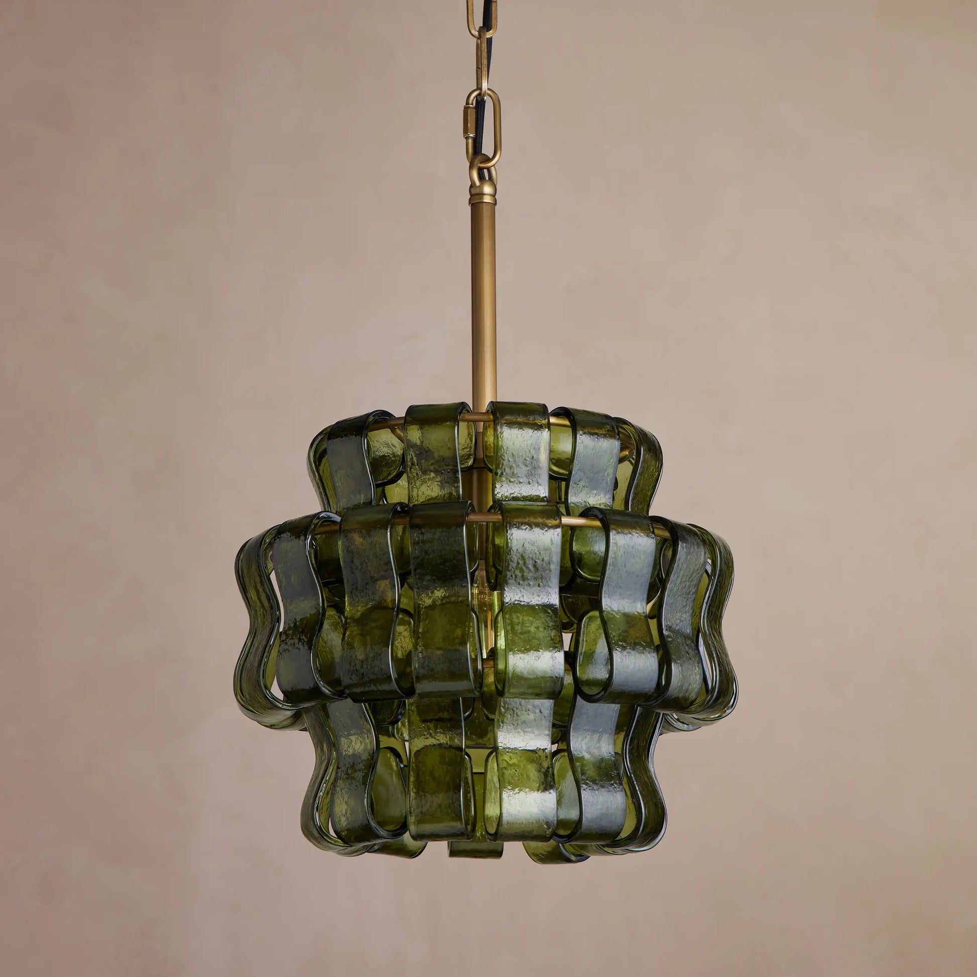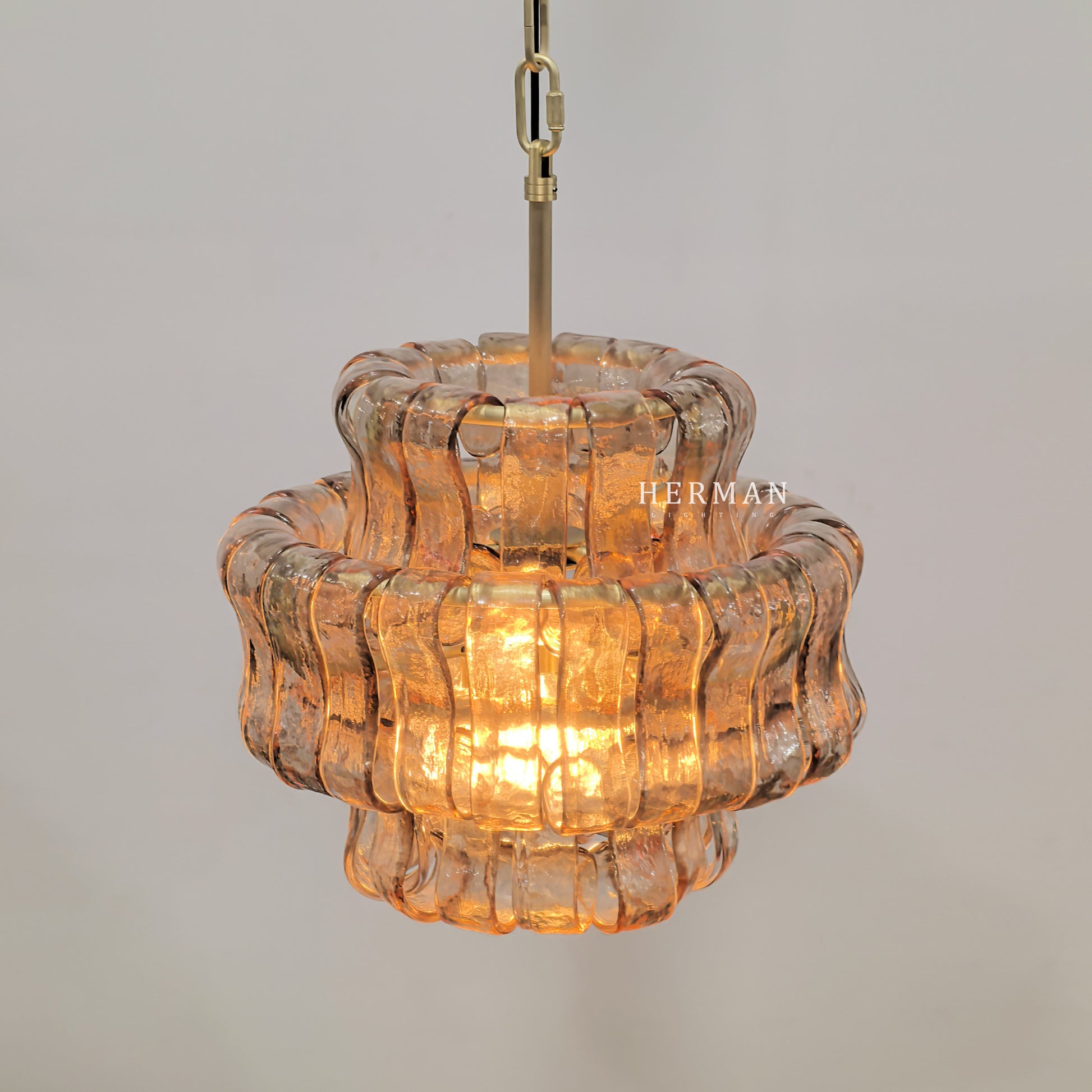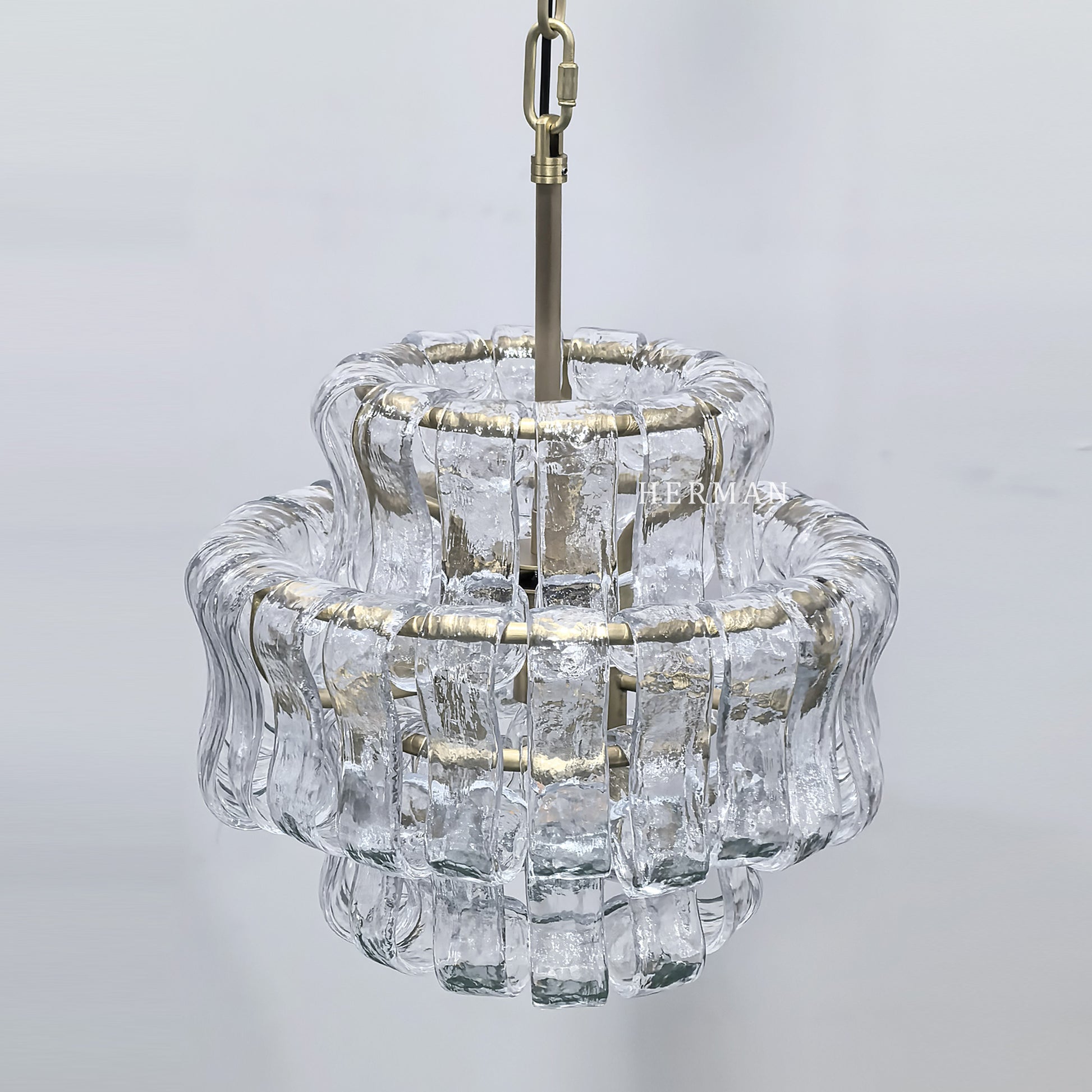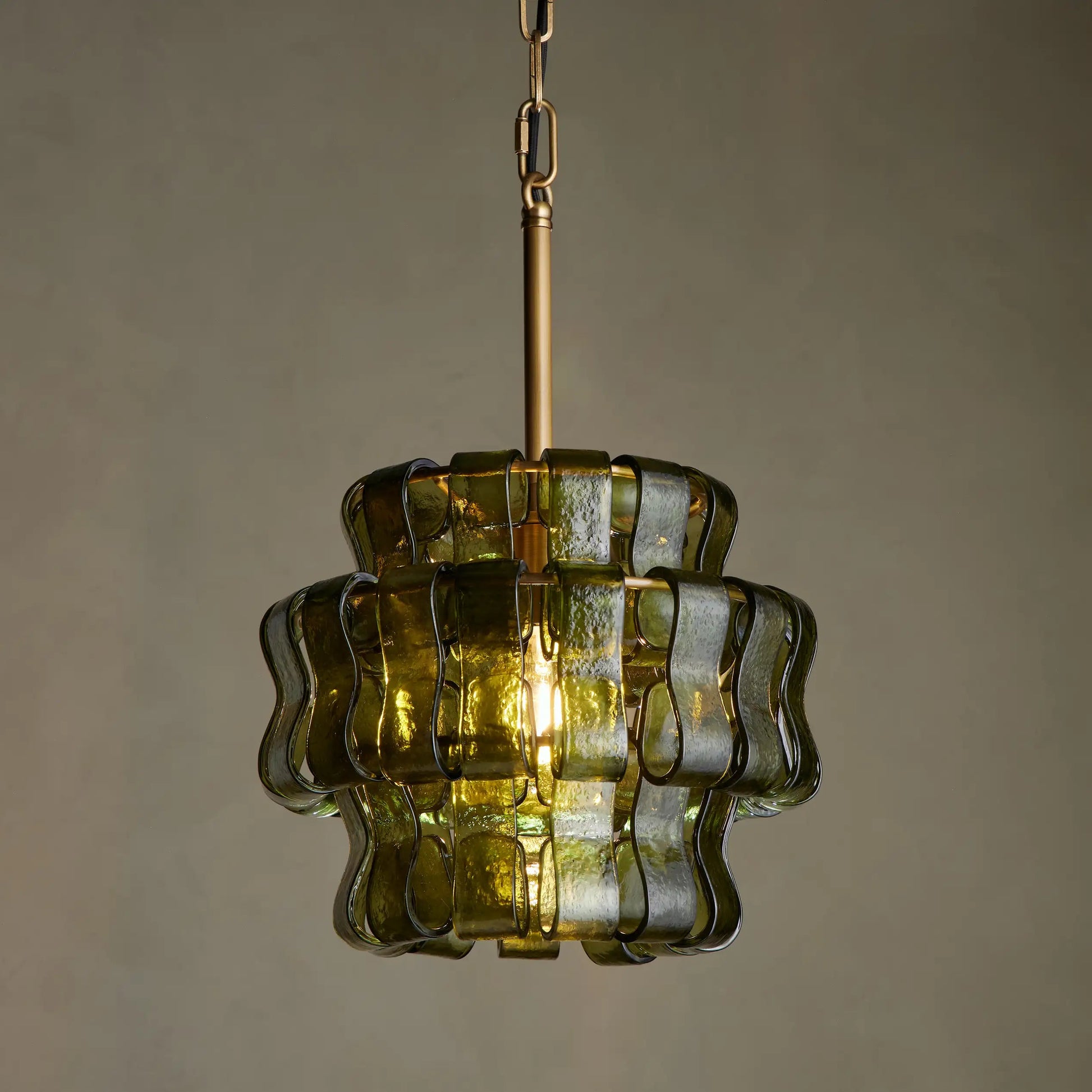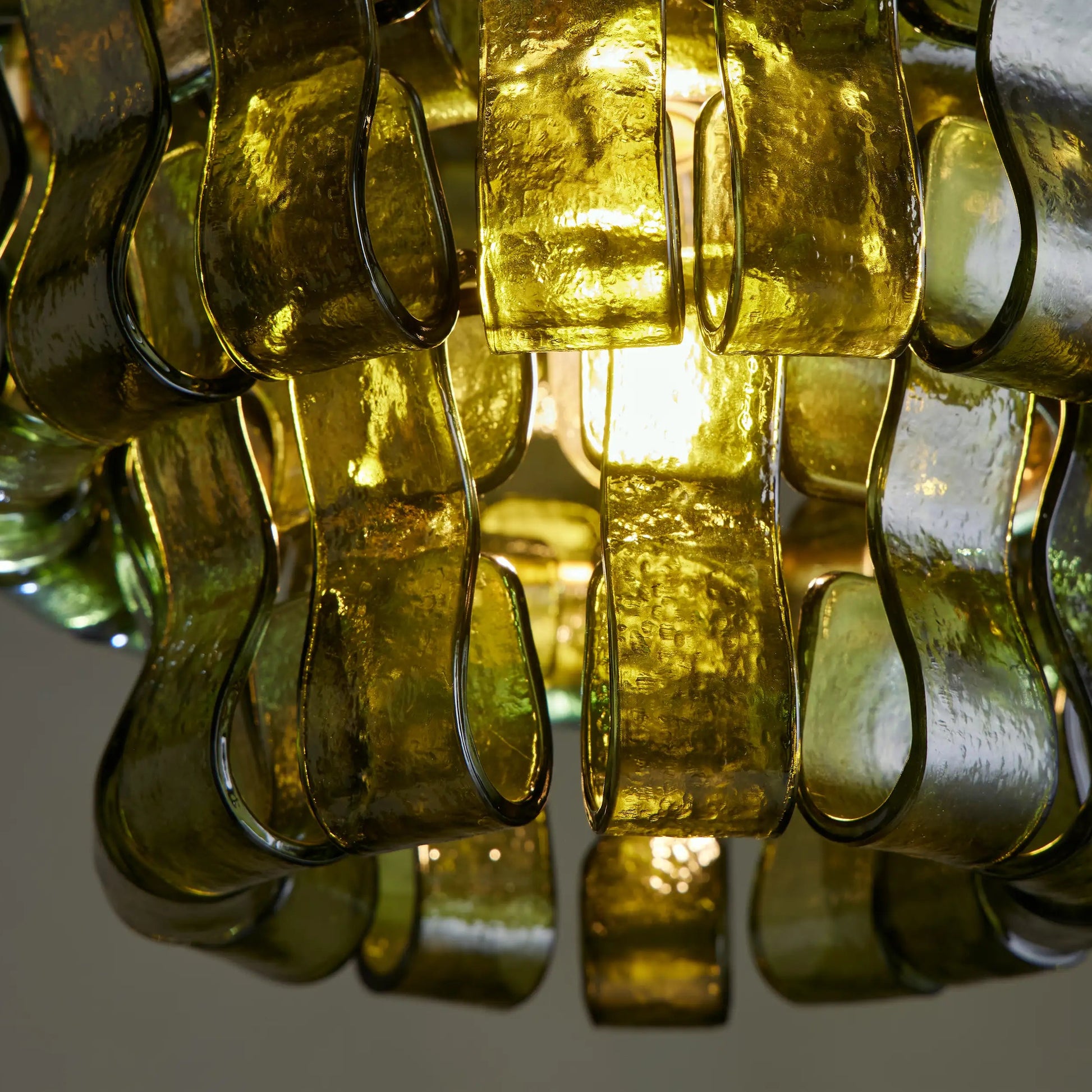 Inspired by the famous Italian decorative glass, the Amor chandelier artfully diffuses light through curved textured glass pieces. It features an electroplated brass finish to elegantly illuminate any room.