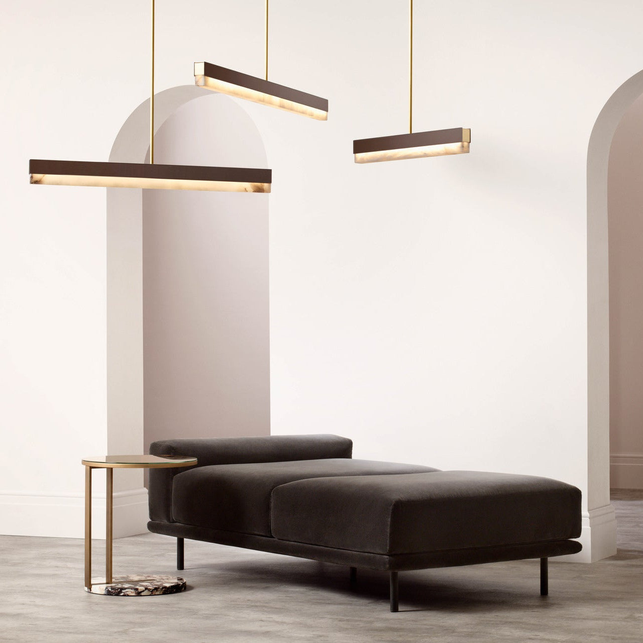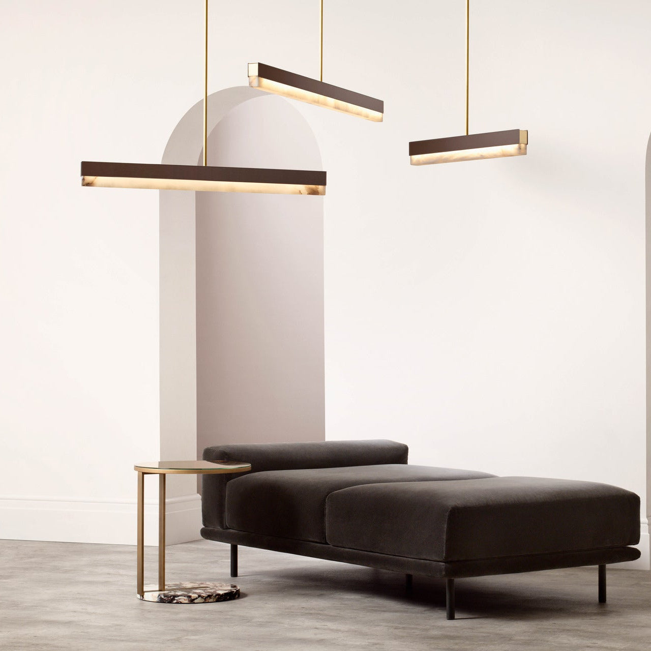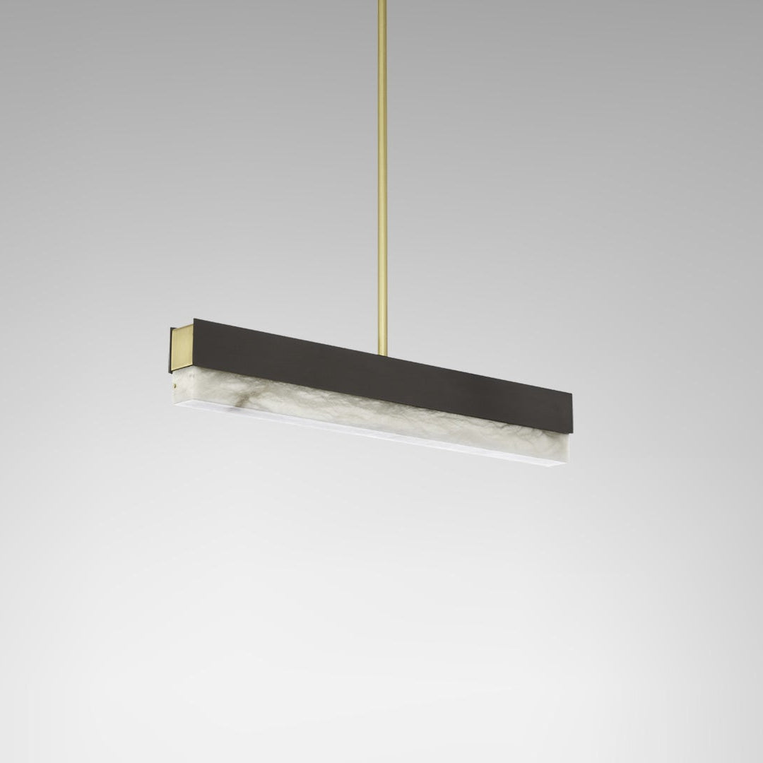 An architectural beam of light fused with premium materials such as bronze, satin brass and honed alabaster creates an elegant pendant which can be used singularly or as a composition creating endless possibilities to personalise a space.