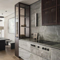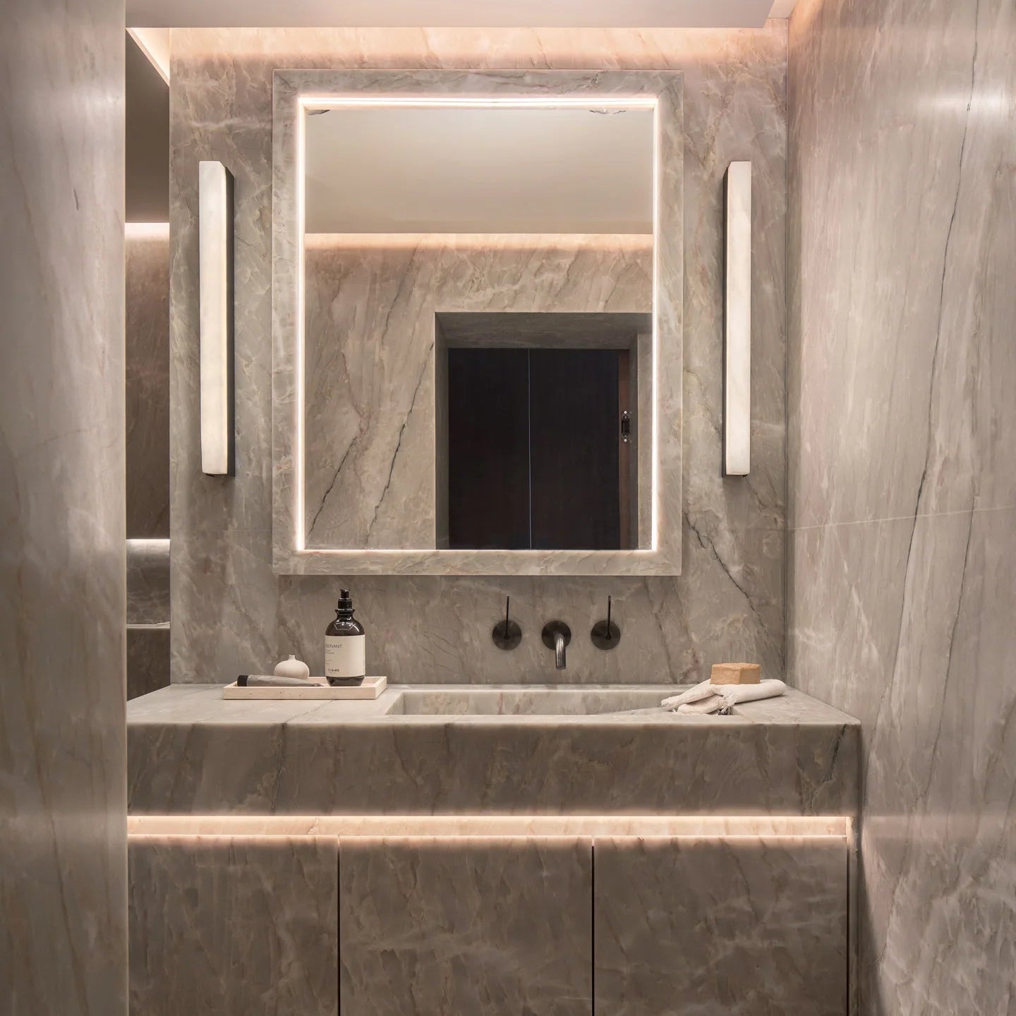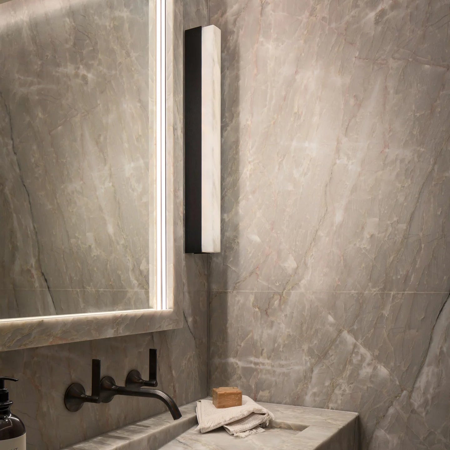 An architectural beam of light fused with premium materials such as bronze, satin brass and honed alabaster creates an elegant pendant which can be used singularly or as a composition creating endless possibilities to personalise a space