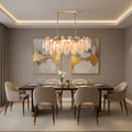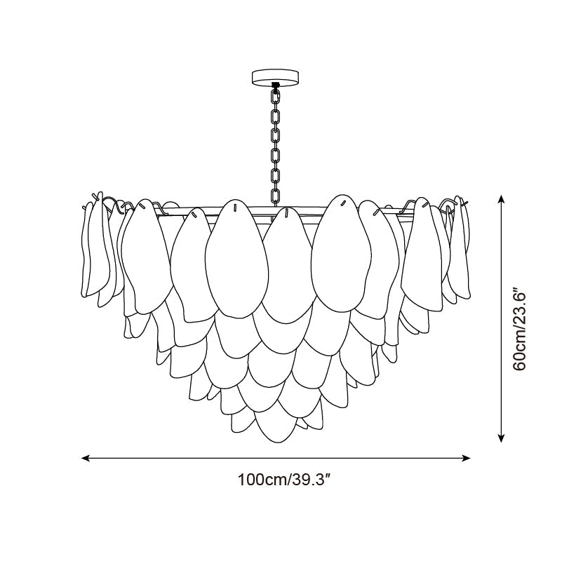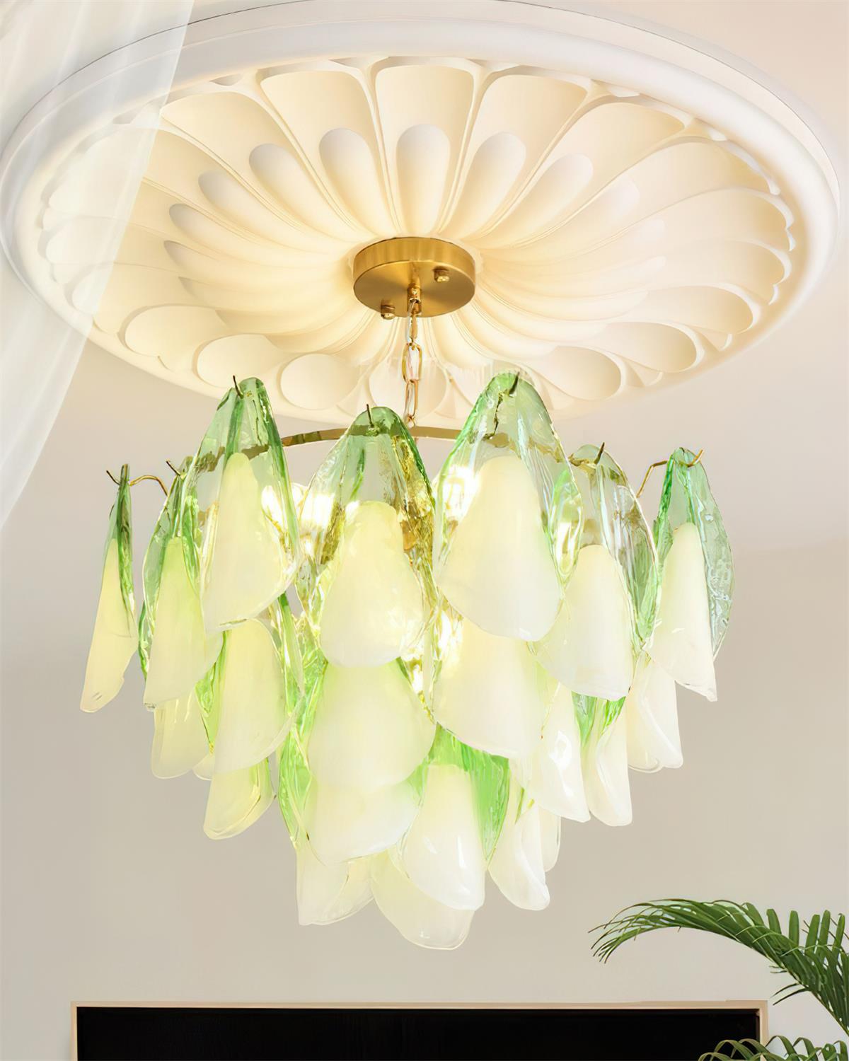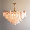 The Caia Murano Glass Chandelier celebrates the poetic rhythm of nature through cascading glass petals tinted in delicate shades of green, blush, and cream. Each hand-shaped piece captures the soft translucency of blooming flora, suspended from a sleek brass frame that adds a refined contrast. With its luminous layering and fluid form, this chandelier creates an ethereal presence, ideal for transforming dining rooms, lounges, or artistic interiors into spaces of warmth, movement, and modern botanical elegance.
