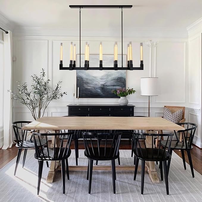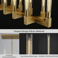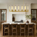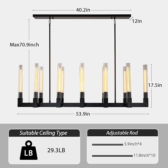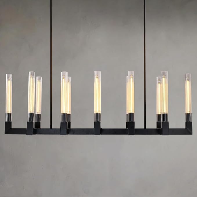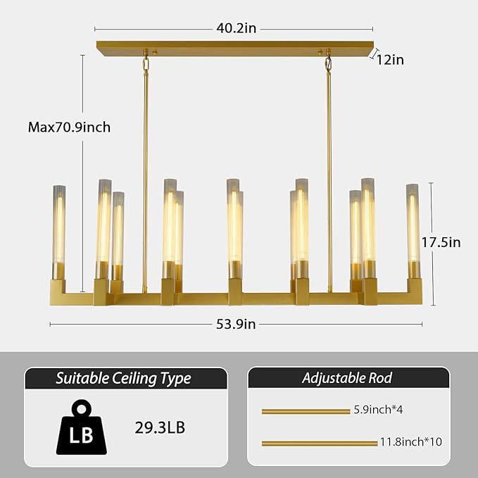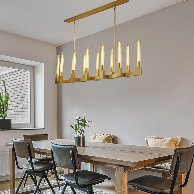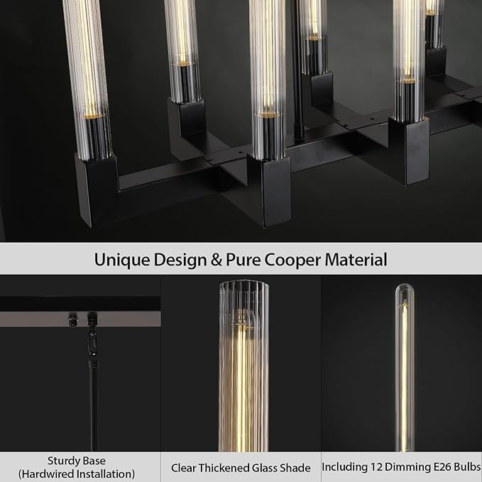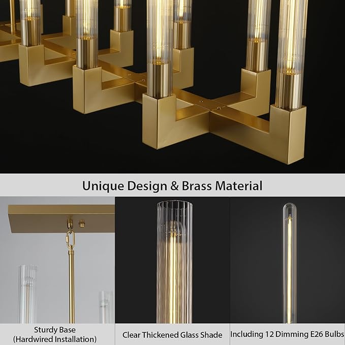 This 54 inch modern dining room chandelier pendant light is made of brass, exquisite and durable, high quality pure copper finish ensures long-lasting luster, rust-resistant and corrosion-resistant; it features a clear striped glass tube shade and includes 12*E26 compatible bulbs, which can be used with a dimmer to achieve the dimming function, and softly diffuse the light to create a cozy home atmosphere.