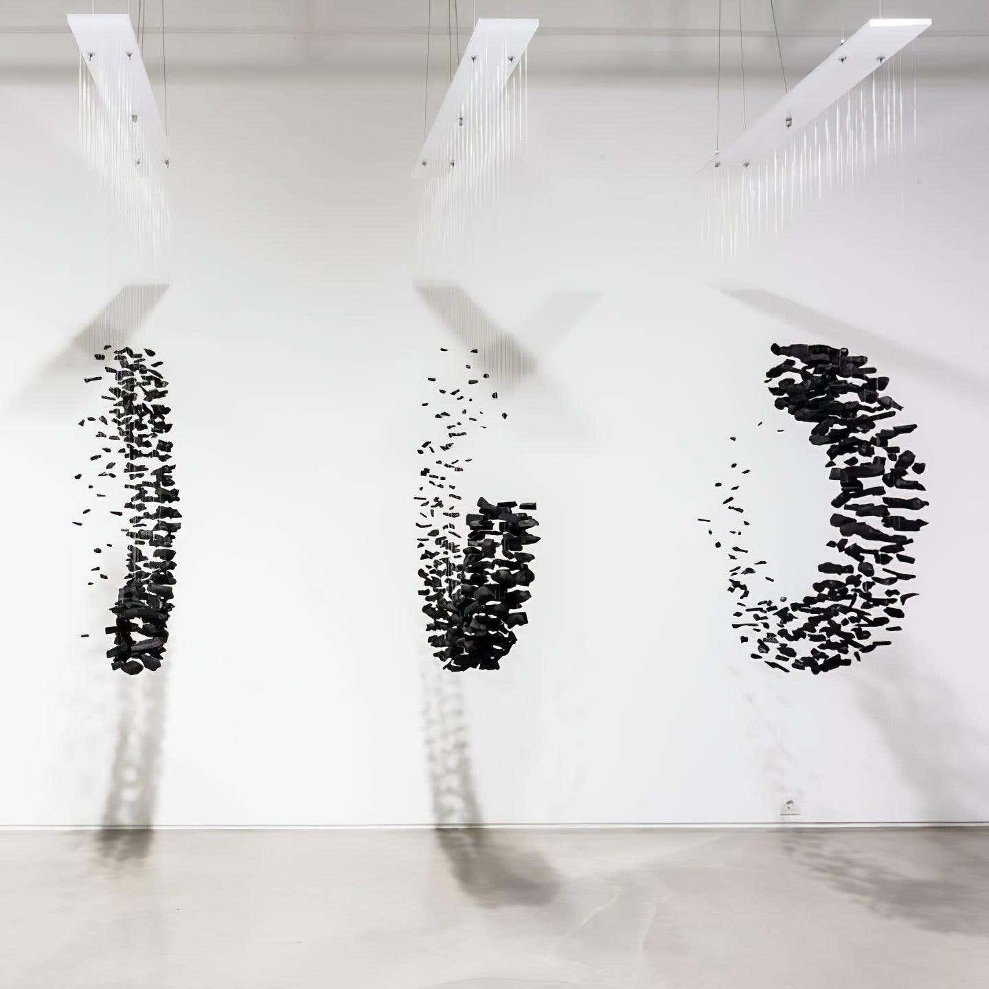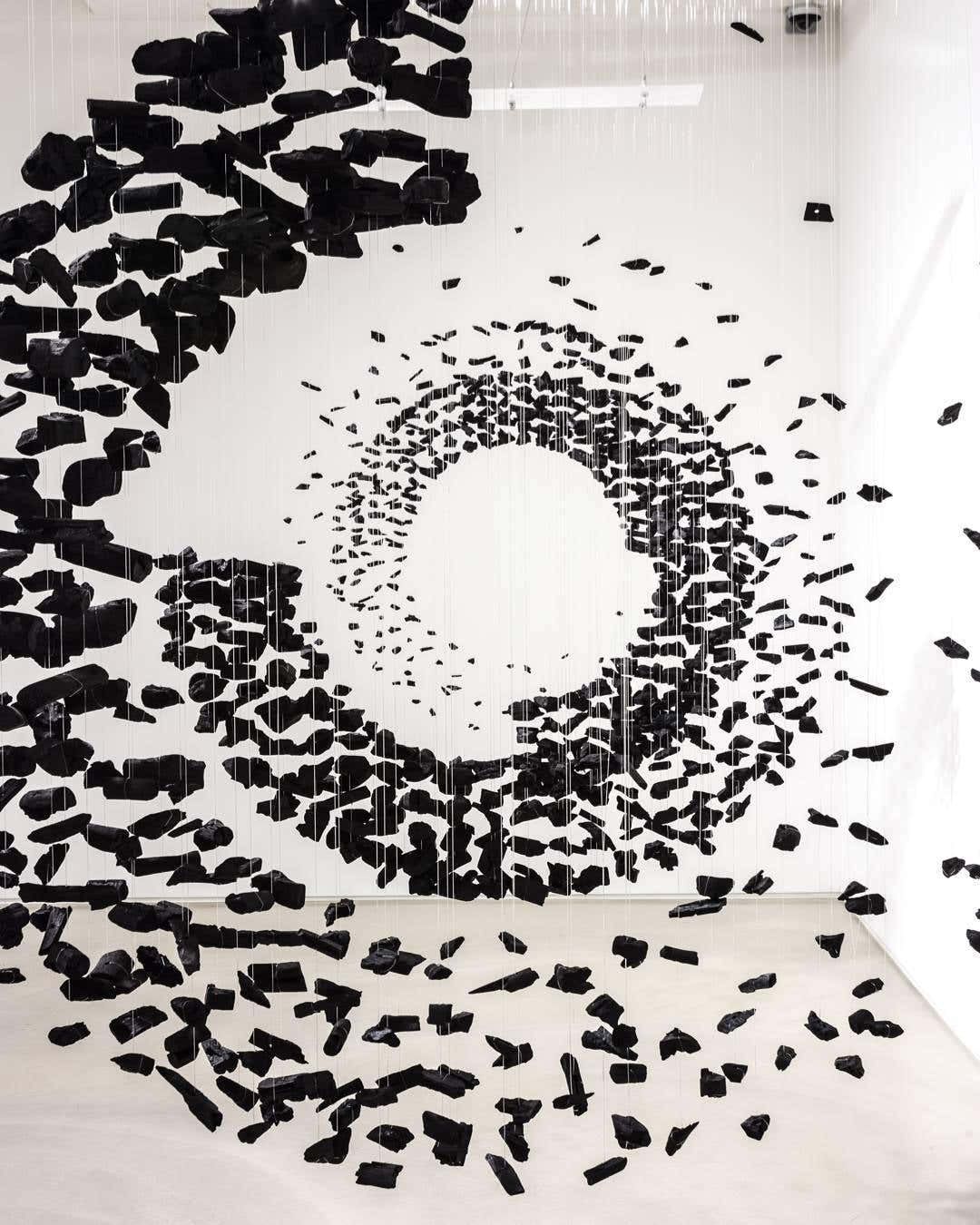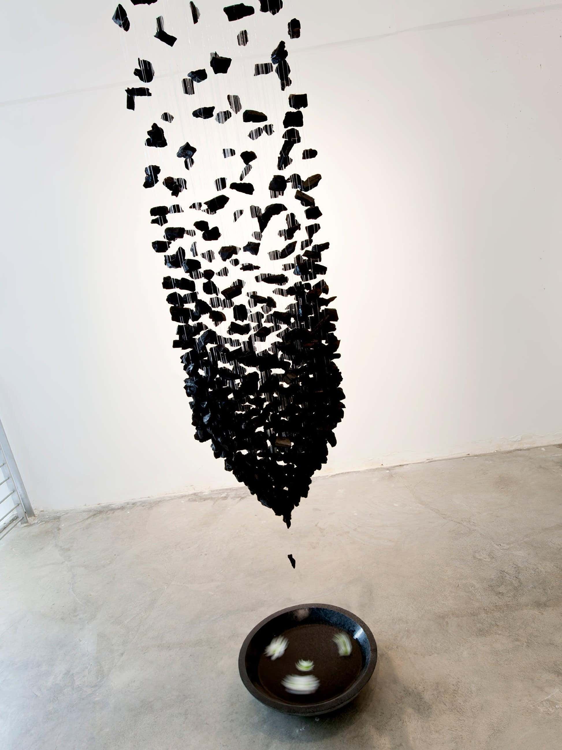 Beginning with one piece of charcoal, a line is formed and an area is filled, expressing the idea that everything in the universe interconnects. The use of charcoal, which simultaneously creates and destroys, implies that all of existence is condensed in a single point. The meaning is plain and unmistakable.