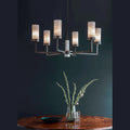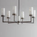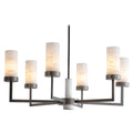 An elegant chandelier featuring shades hewn from solid alabaster. The soft opalescent alabaster shades are offset by the clean contemporary lines of the hand-grained metalwork. When lit, the alabaster shades offer a stunning diffused light and display a fascinating natural marbled texture.