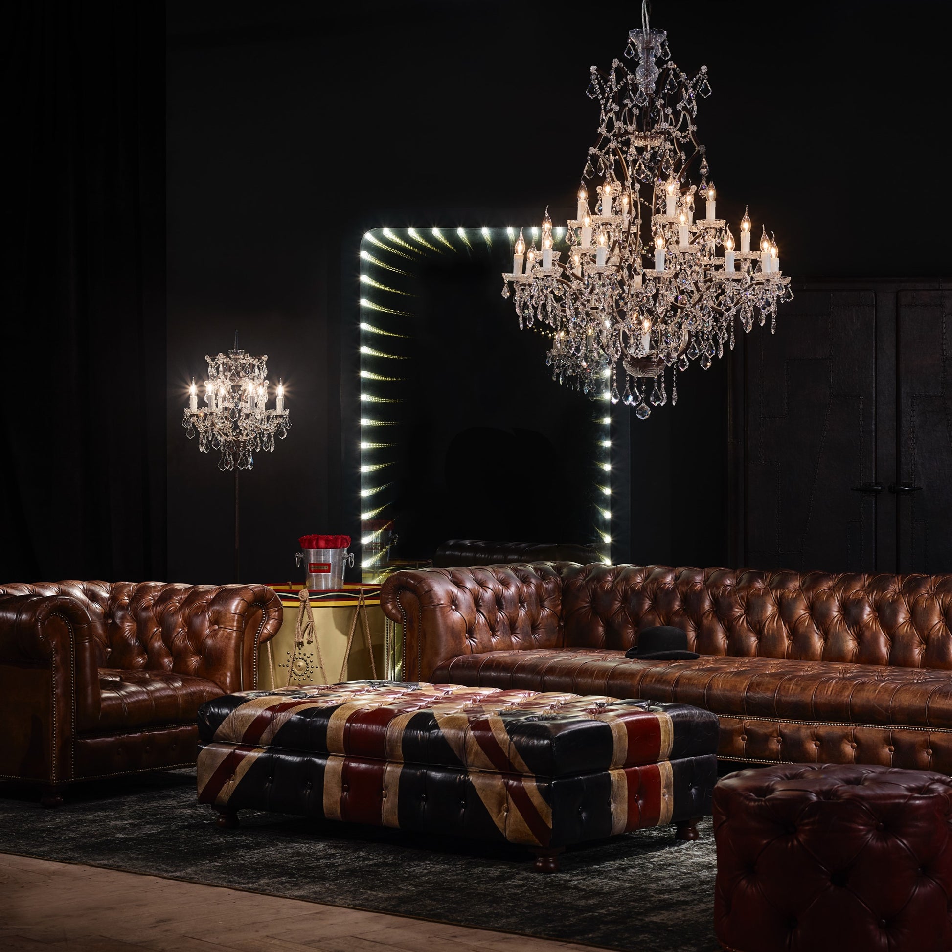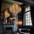 The Crystal Chandelier pays homage to the grandeur of the late Georgian era, reimagined through modern craftsmanship. Meticulously handcrafted, it showcases iconic design elements such as a bold crystal baluster centerpiece, precision-cut glass prisms, candle-style lights, and elegant bobeche dishes—once used to catch dripping wax.