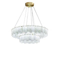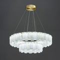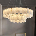 Layers of luminous alabaster panels form a cascading ring of soft, diffused light in this modern chandelier. Suspended by delicate wires from a brushed brass canopy, the natural veining in each stone piece adds a unique, organic touch. The warm glow enhances dining rooms, living spaces, or grand entryways, blending seamlessly with contemporary, Art Deco, or minimalist interiors. A striking balance of elegance and refinement, this chandelier transforms any space into a statement of sophistication.