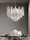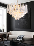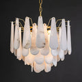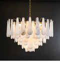 A striking fusion of organic beauty and modern elegance, this alabaster pendant chandelier features cascading teardrop-shaped stone pieces, each naturally veined and softly translucent. Suspended from a refined iron frame in a warm metallic finish, the layered alabaster diffuses light with a gentle, ambient glow, creating a sophisticated focal point in any interior.