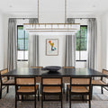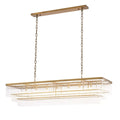 Chandelier East has more than a hint of Art Deco decadence. This rectangular 3-tier chandelier with antique brass finish exudes the vibrant atmosphere of the roaring 1920s. Several levels of clear glass rods emanate a captivating illumination. Ideally suited to modern interiors and 1920s and 1930s décors.