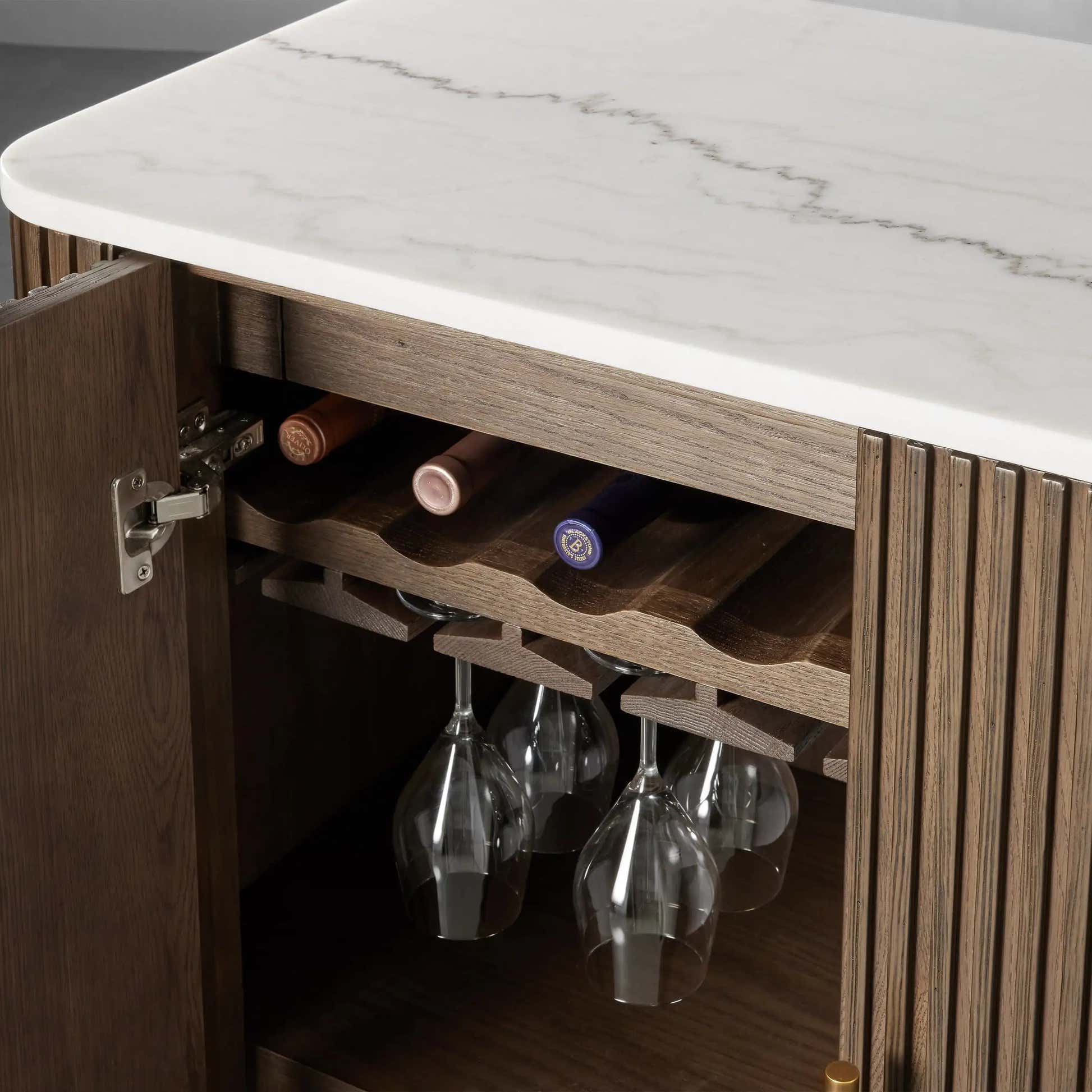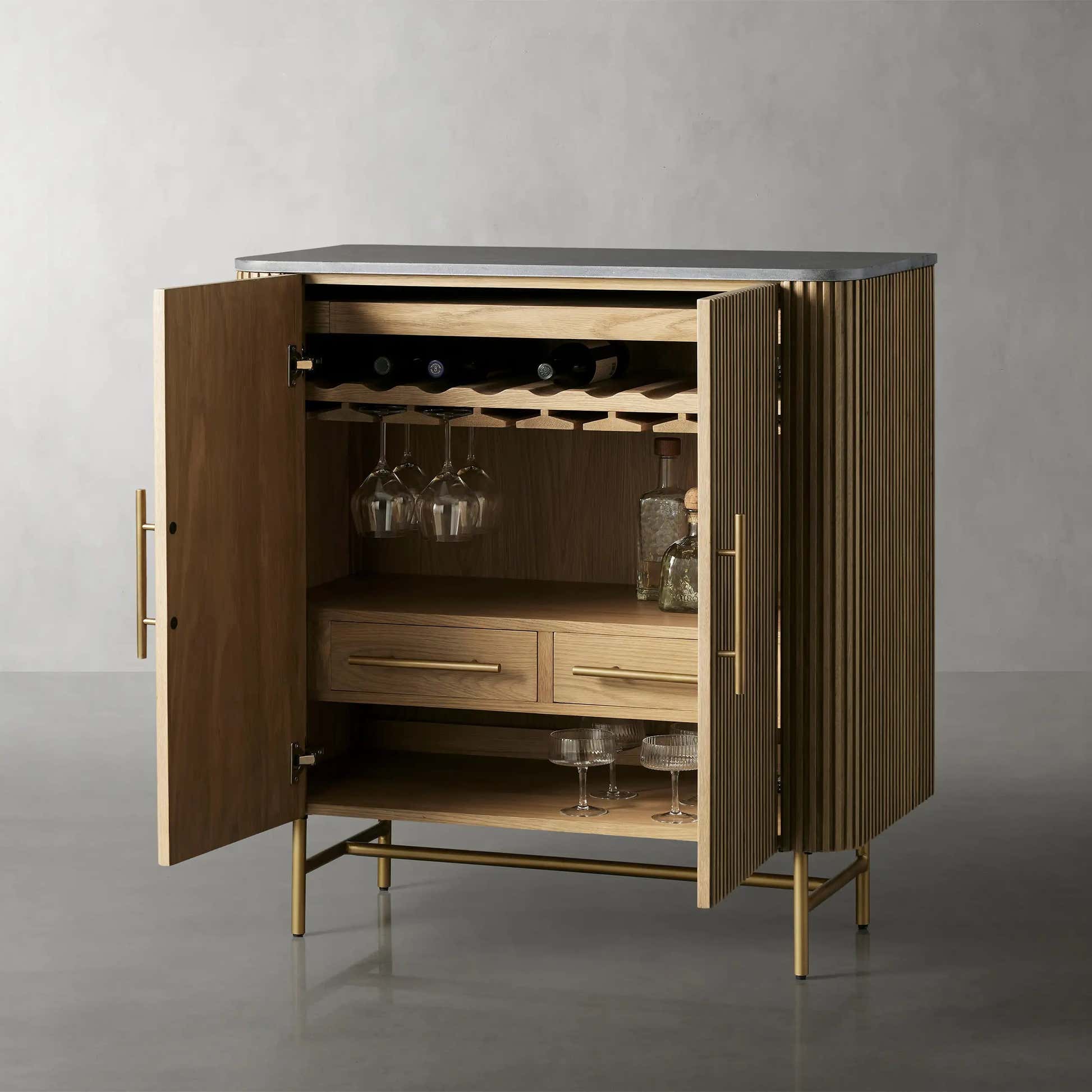 - The bar cabinet includes built-in storage for wine bottles and stemware, along with a shelf and two interior drawers to keep your entertaining essentials neatly organized.
