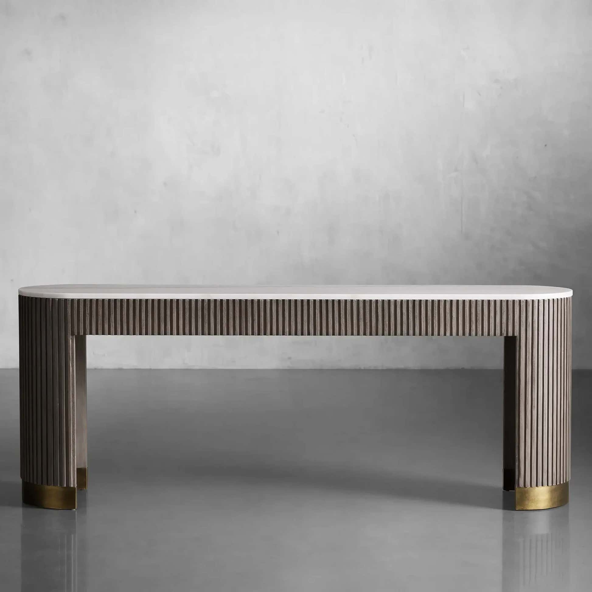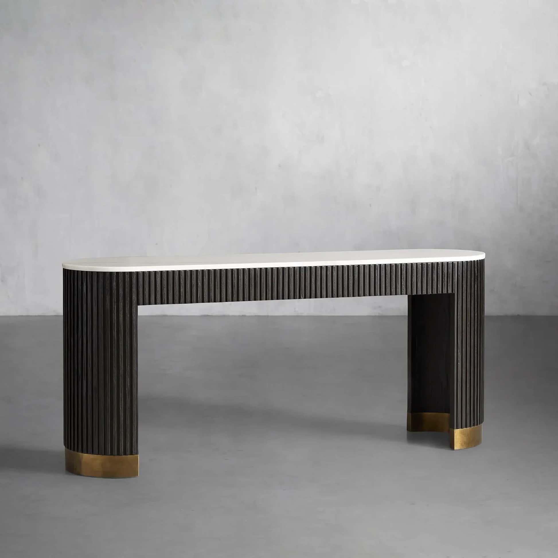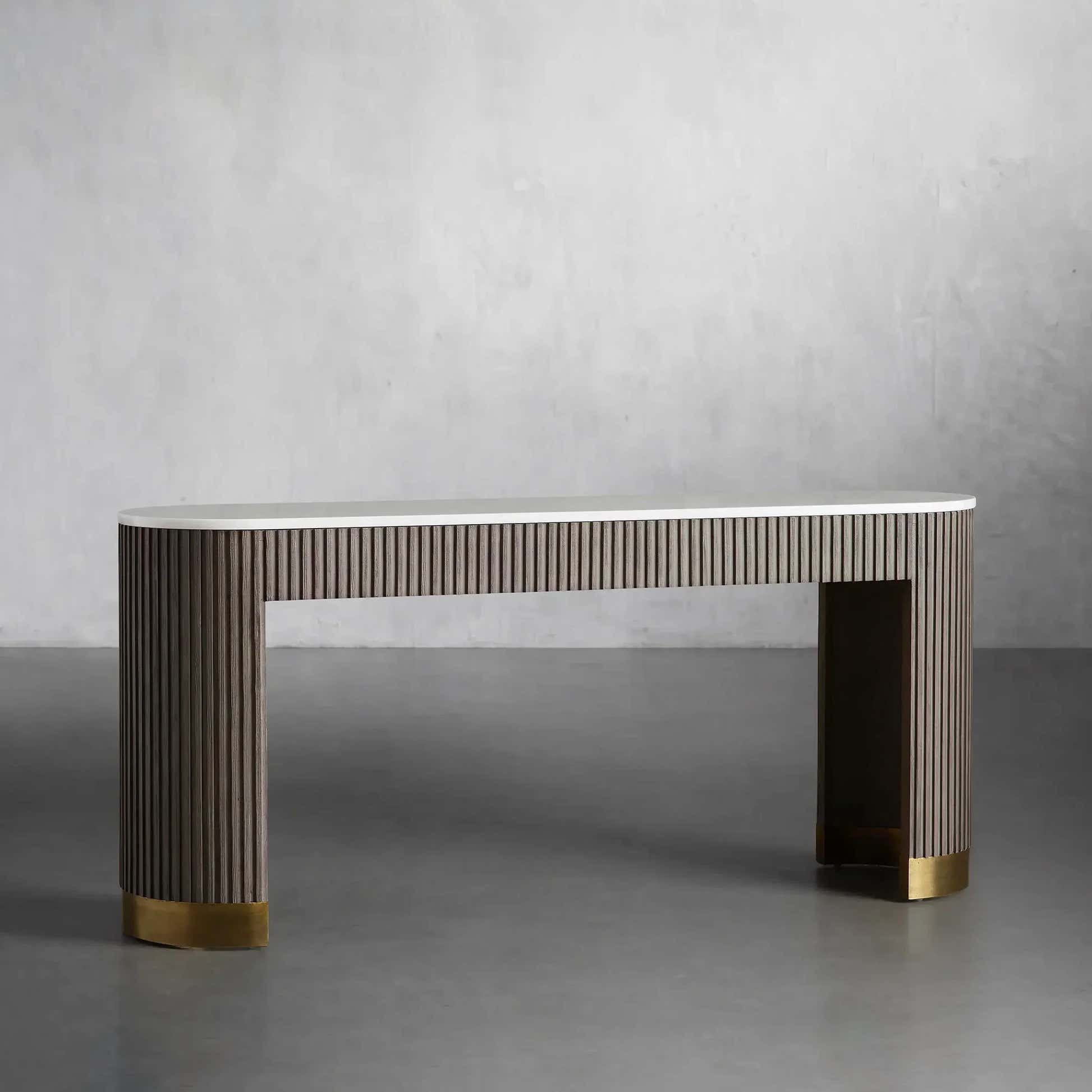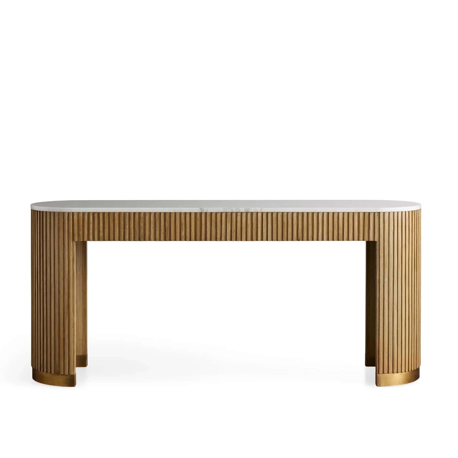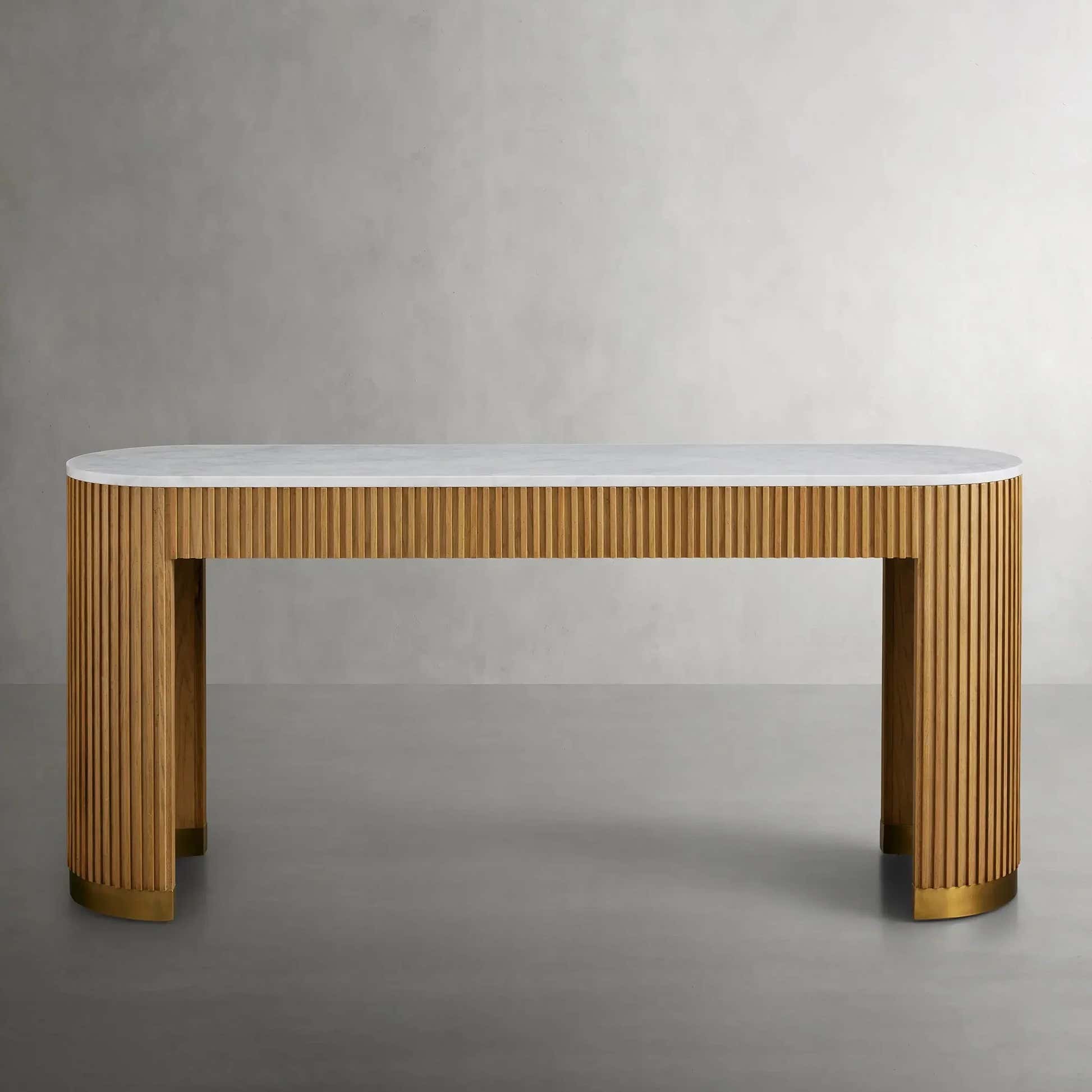 The Arden Console Table embodies the refined mixed-material aesthetic of the Arden Collection, offering a sleek profile with rich natural textures. Crafted from hand-finished Finnish pine or white oak, the streamlined frame is accented with reeded oak detailing and grounded by a brass-finished plinth base. A stone top—available in Carrara, Bluestone, or White Marble—adds a luxurious contrast. Perfect for entryways, living rooms, or behind a sofa, the Arden Console Table brings a sculptural elegance that feels both grounded and sophisticated.