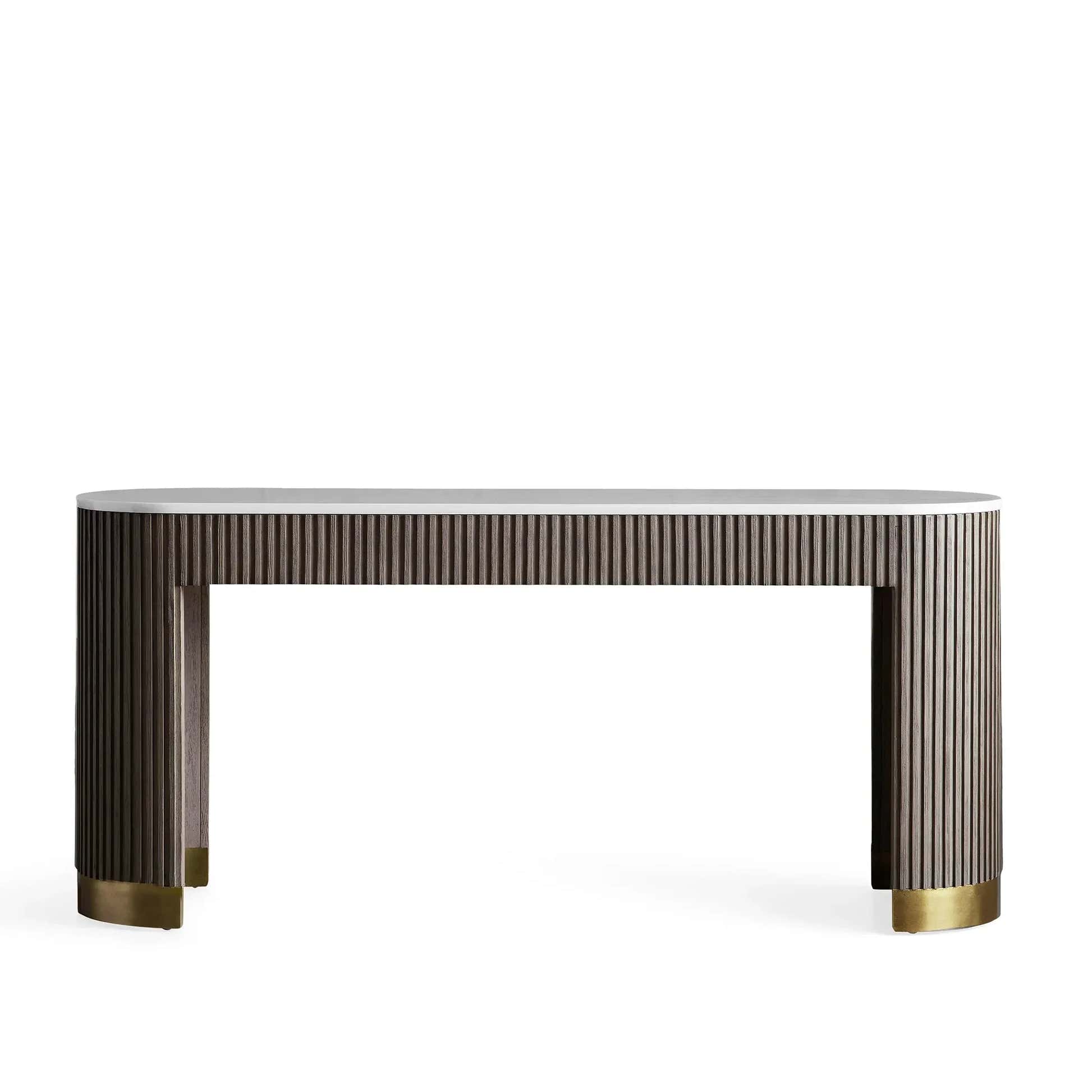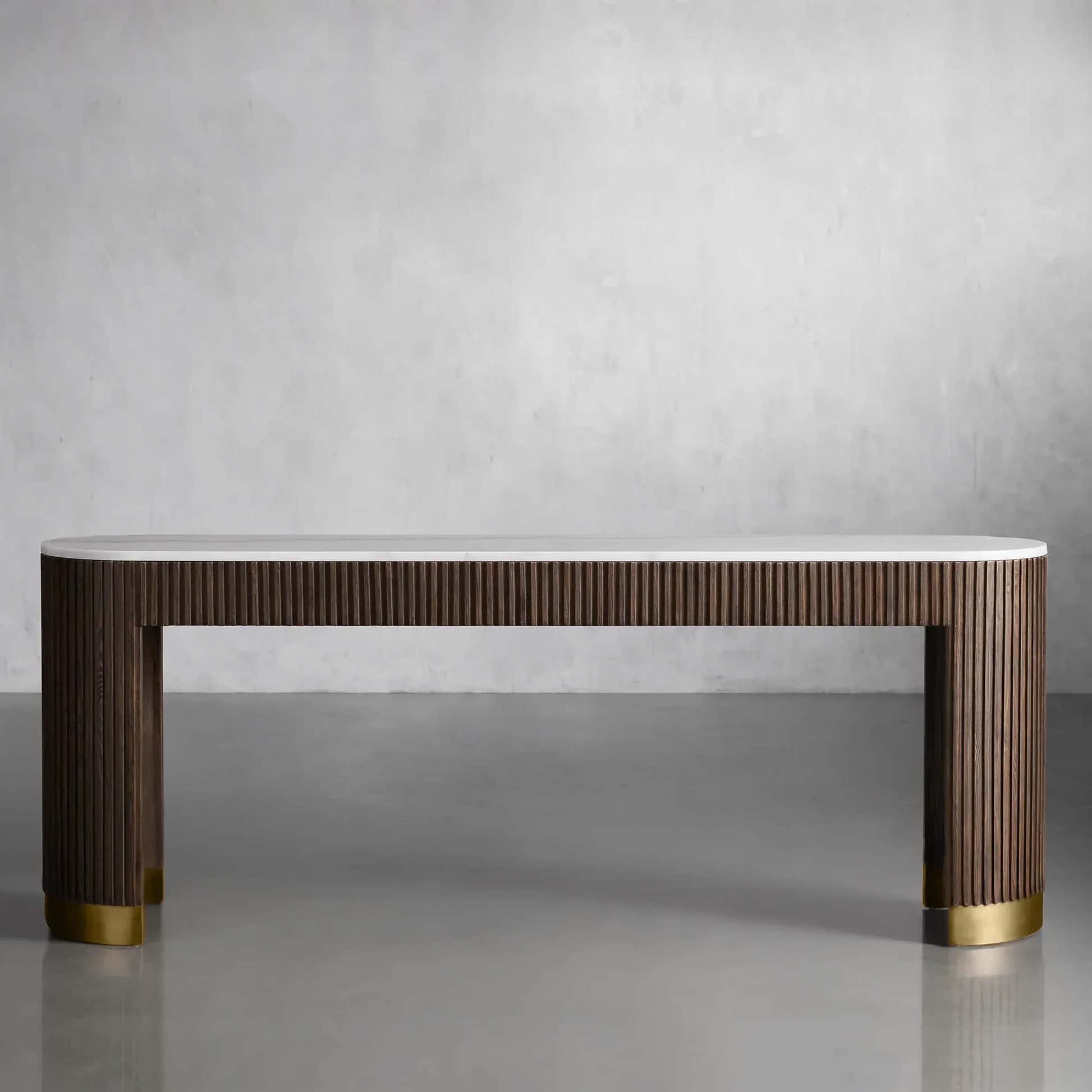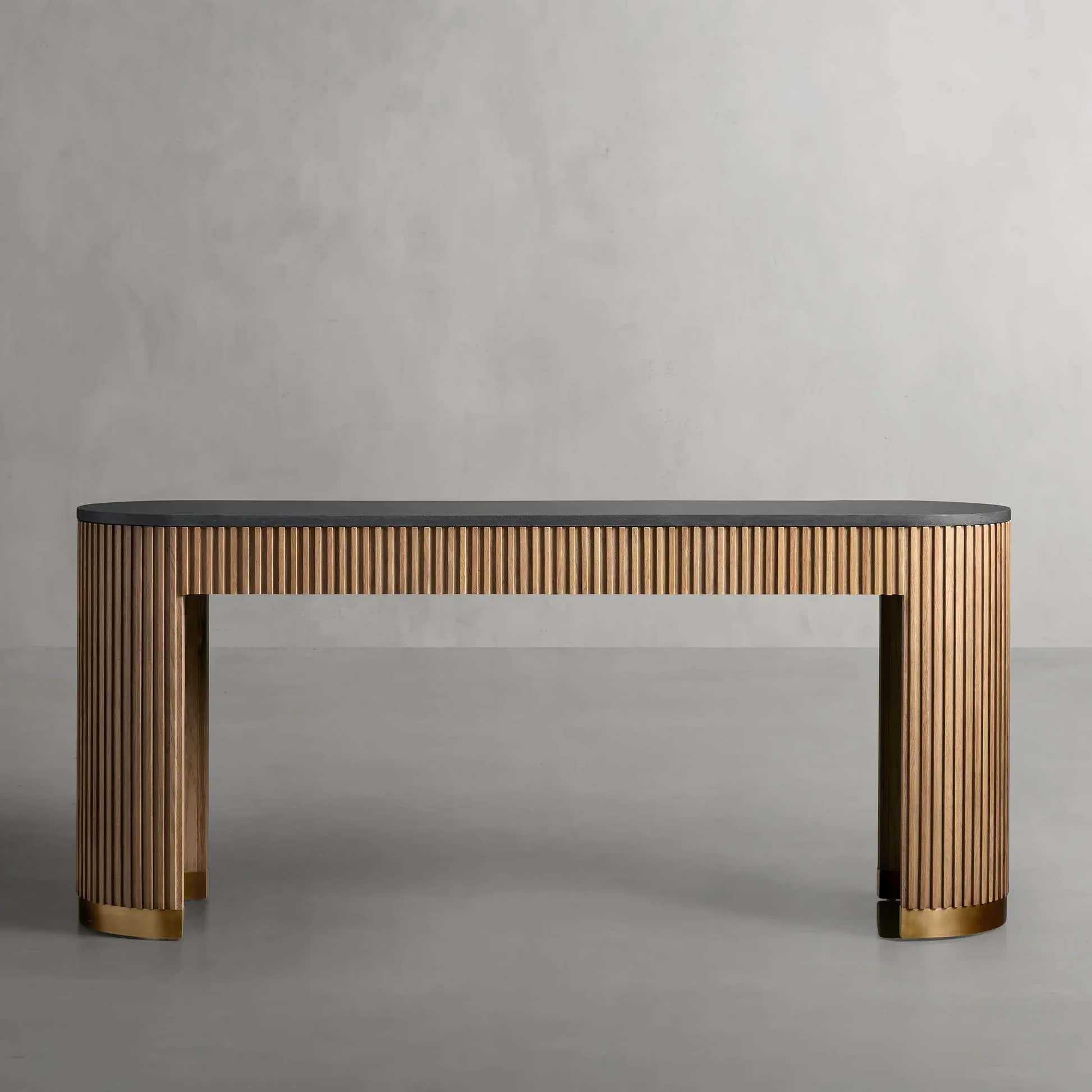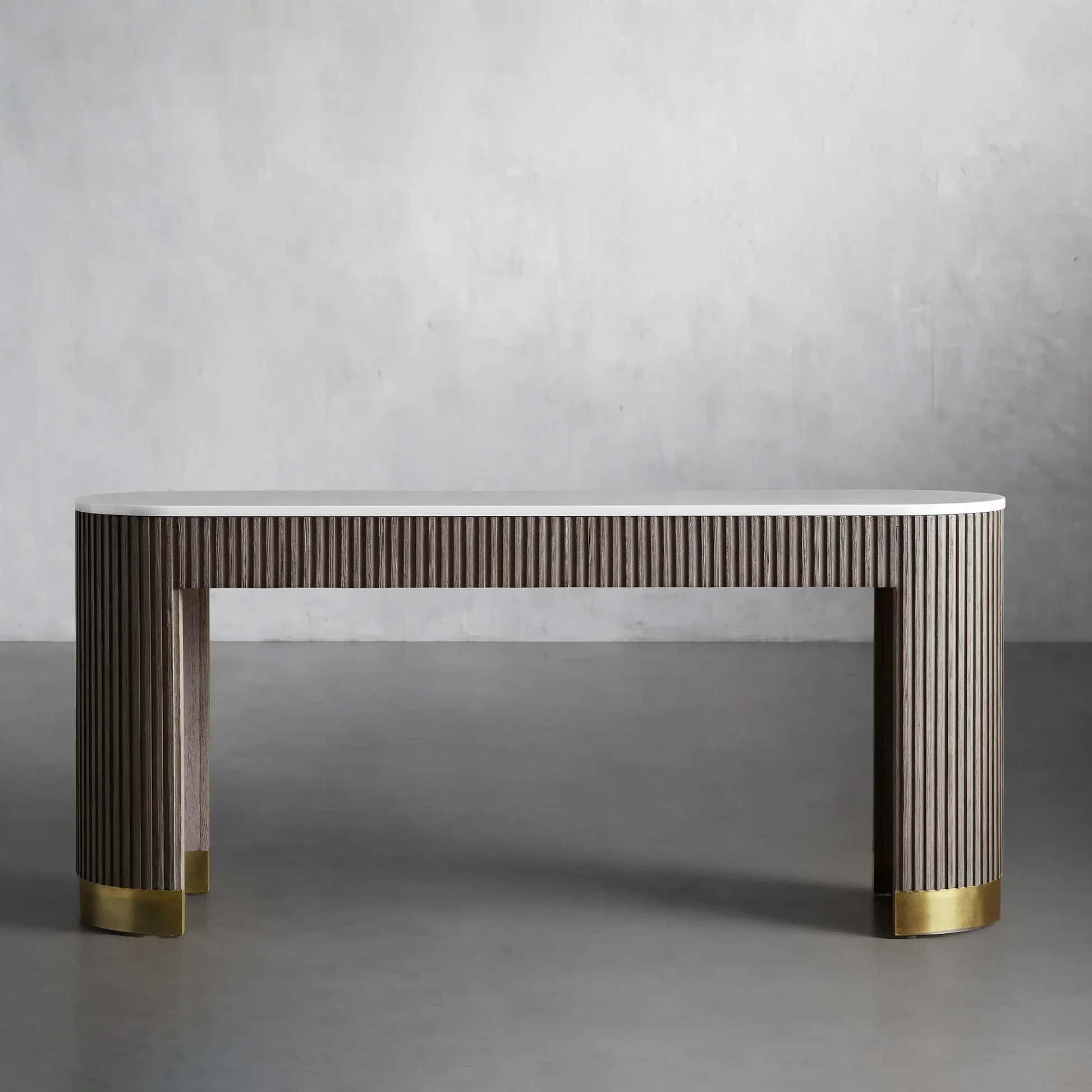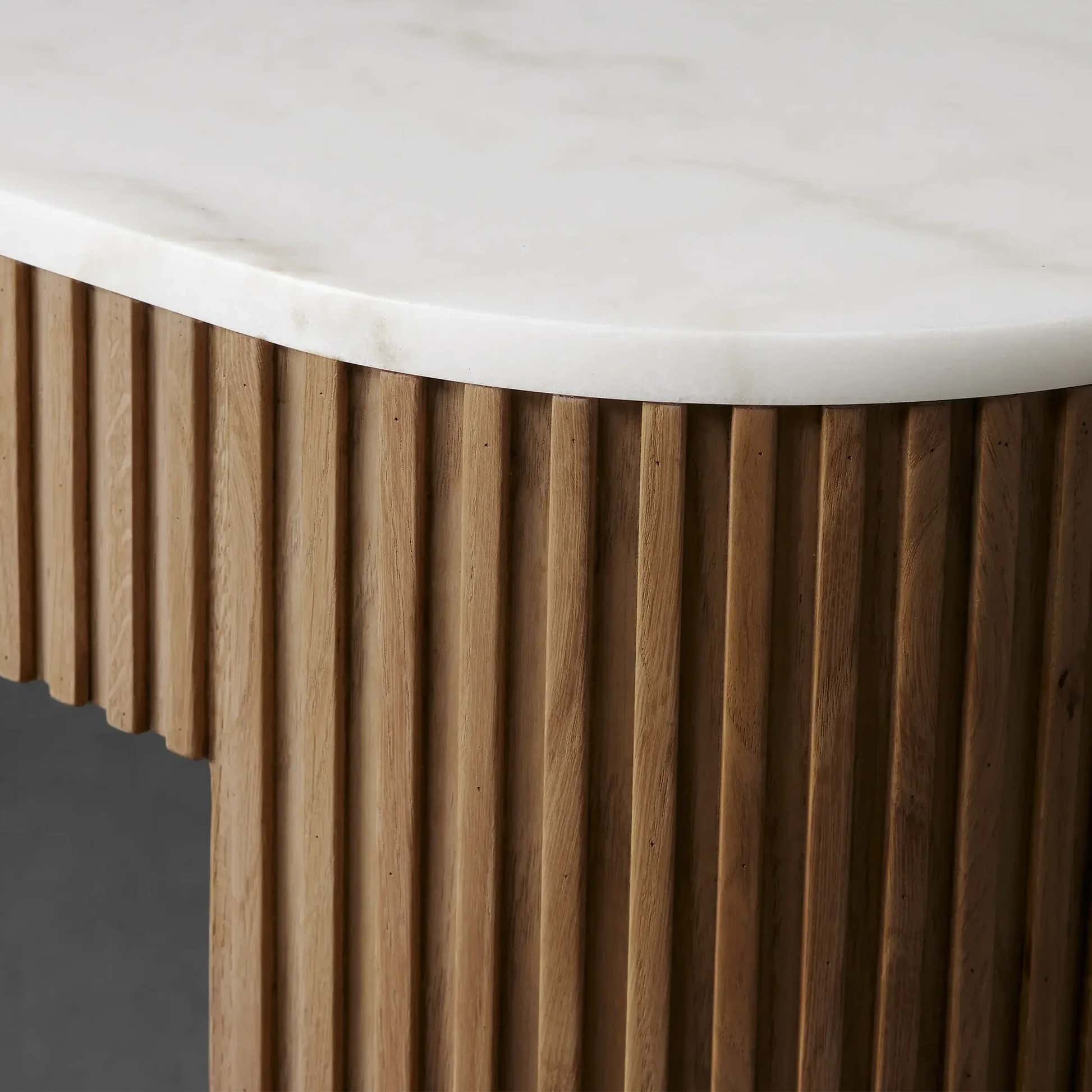 The Arden Console Table embodies the refined mixed-material aesthetic of the Arden Collection, offering a sleek profile with rich natural textures. Crafted from hand-finished Finnish pine or white oak, the streamlined frame is accented with reeded oak detailing and grounded by a brass-finished plinth base. A stone top—available in Carrara, Bluestone, or White Marble—adds a luxurious contrast. Perfect for entryways, living rooms, or behind a sofa, the Arden Console Table brings a sculptural elegance that feels both grounded and sophisticated.