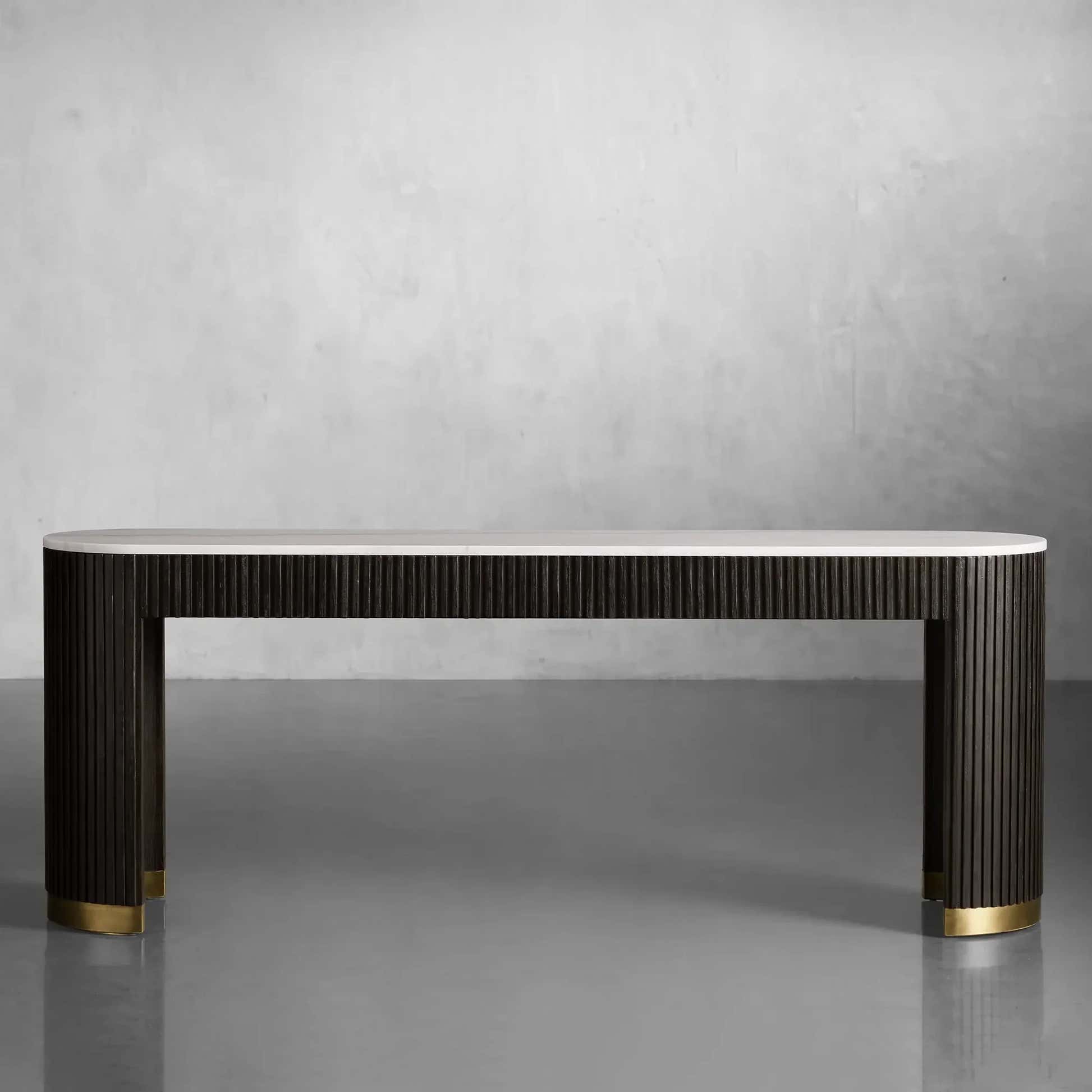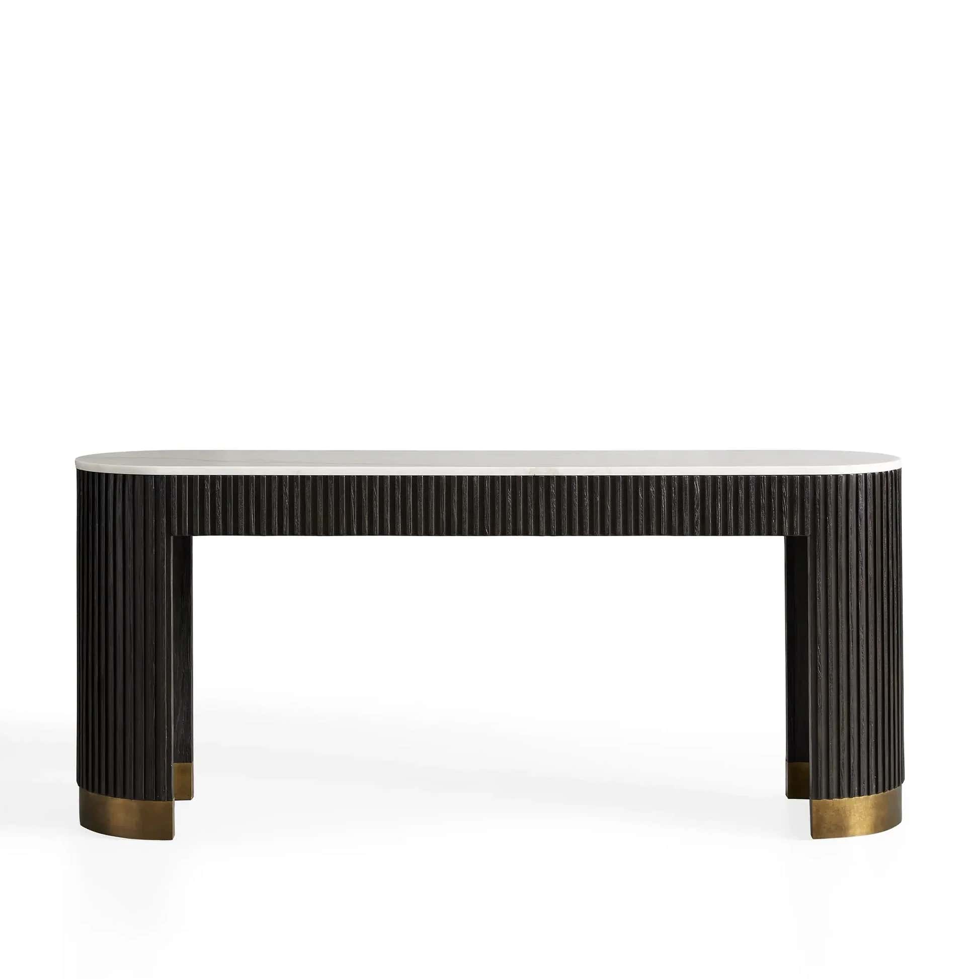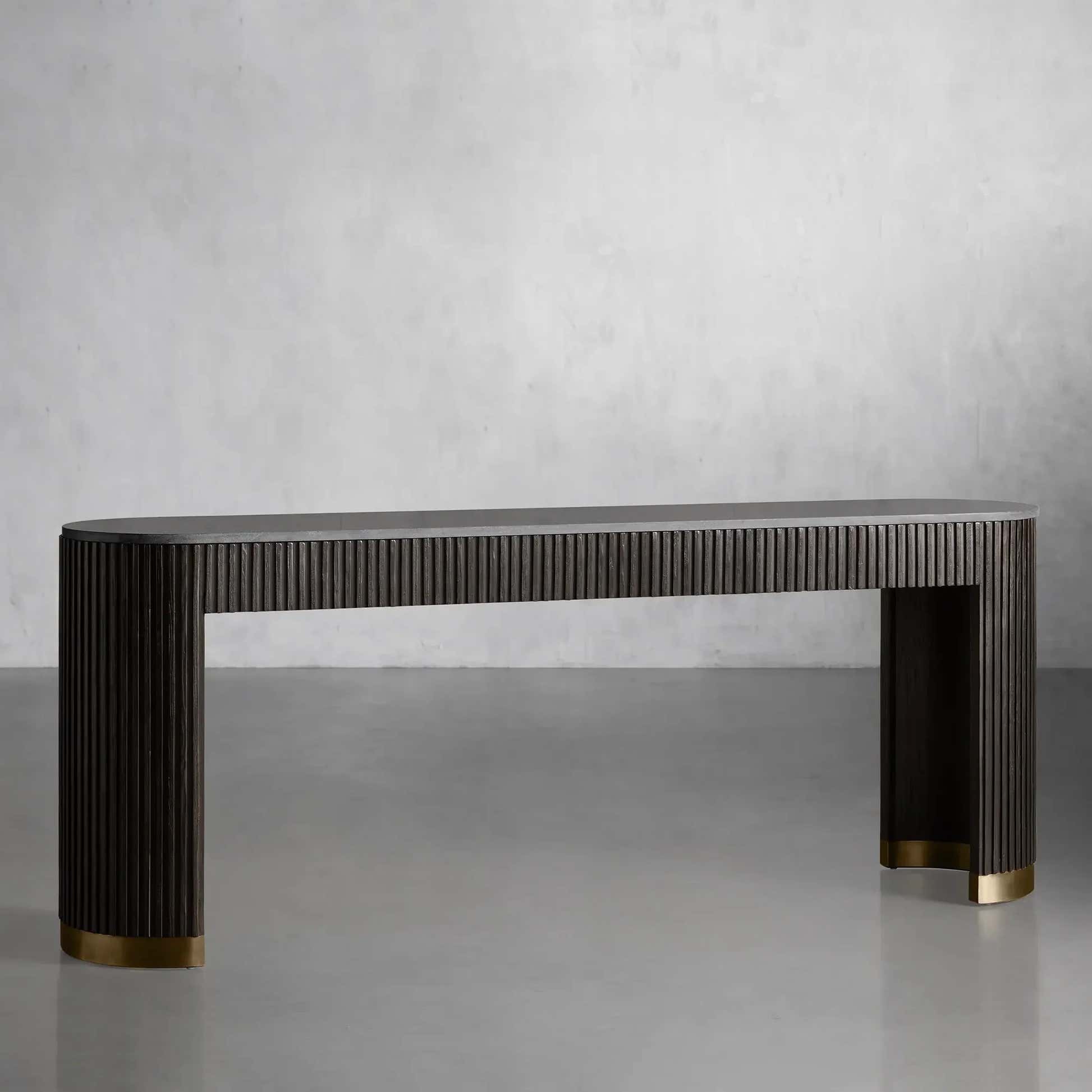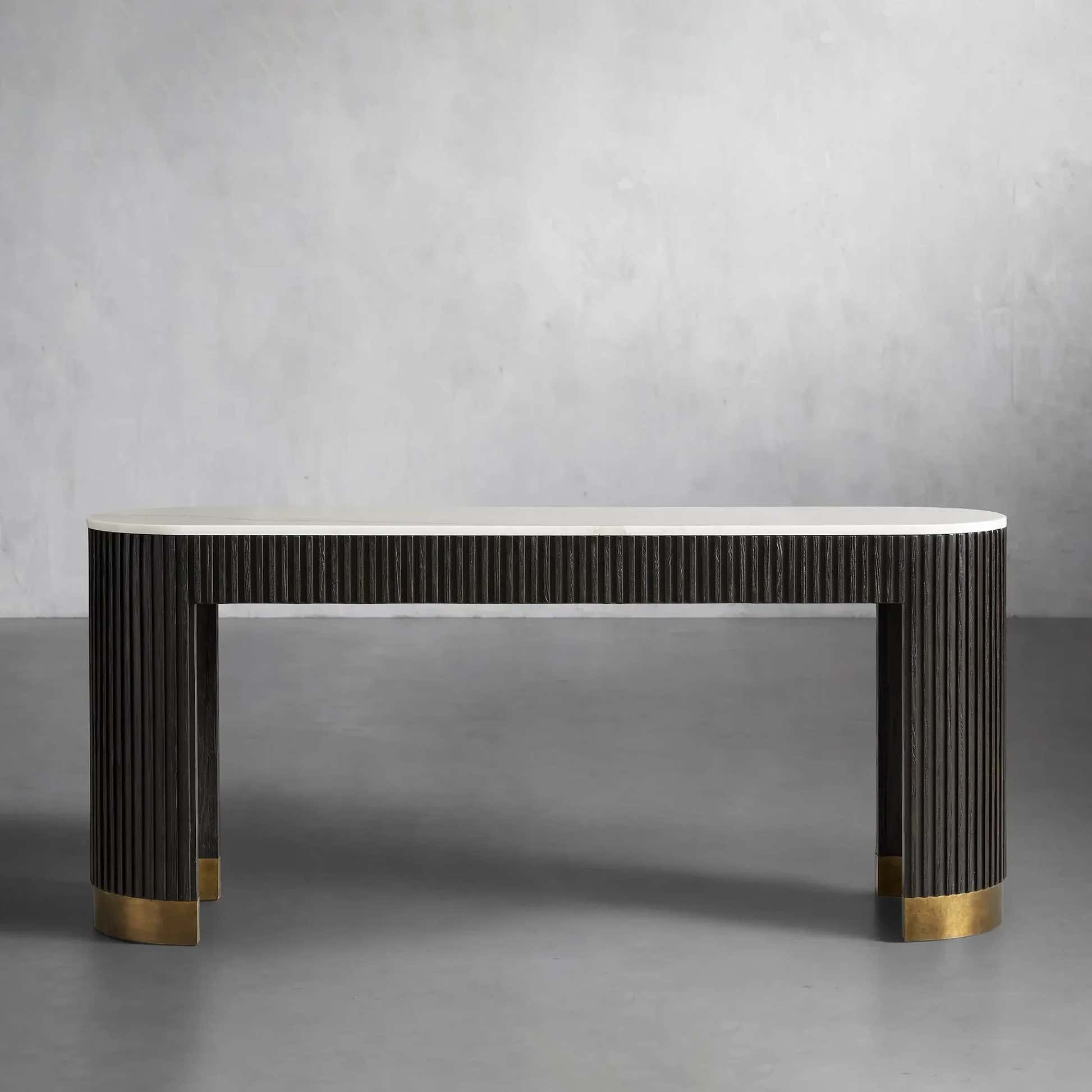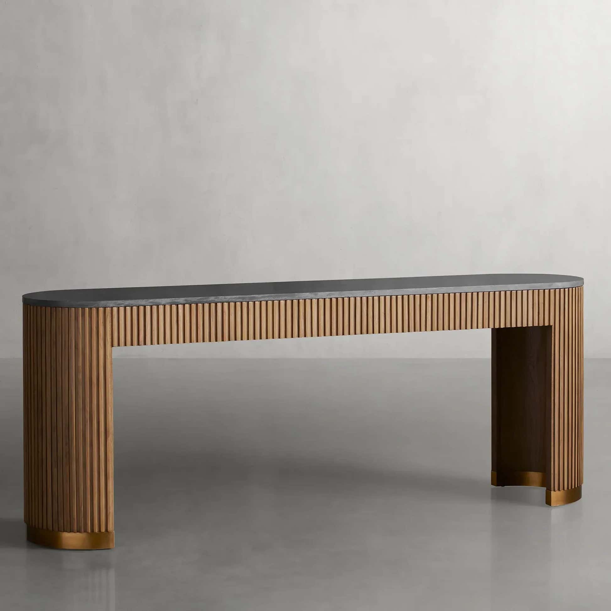 The Arden Console Table embodies the refined mixed-material aesthetic of the Arden Collection, offering a sleek profile with rich natural textures. Crafted from hand-finished Finnish pine or white oak, the streamlined frame is accented with reeded oak detailing and grounded by a brass-finished plinth base. A stone top—available in Carrara, Bluestone, or White Marble—adds a luxurious contrast. Perfect for entryways, living rooms, or behind a sofa, the Arden Console Table brings a sculptural elegance that feels both grounded and sophisticated.