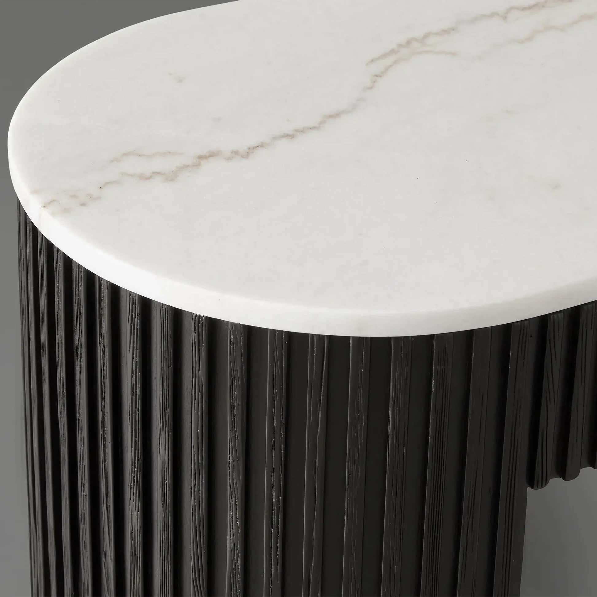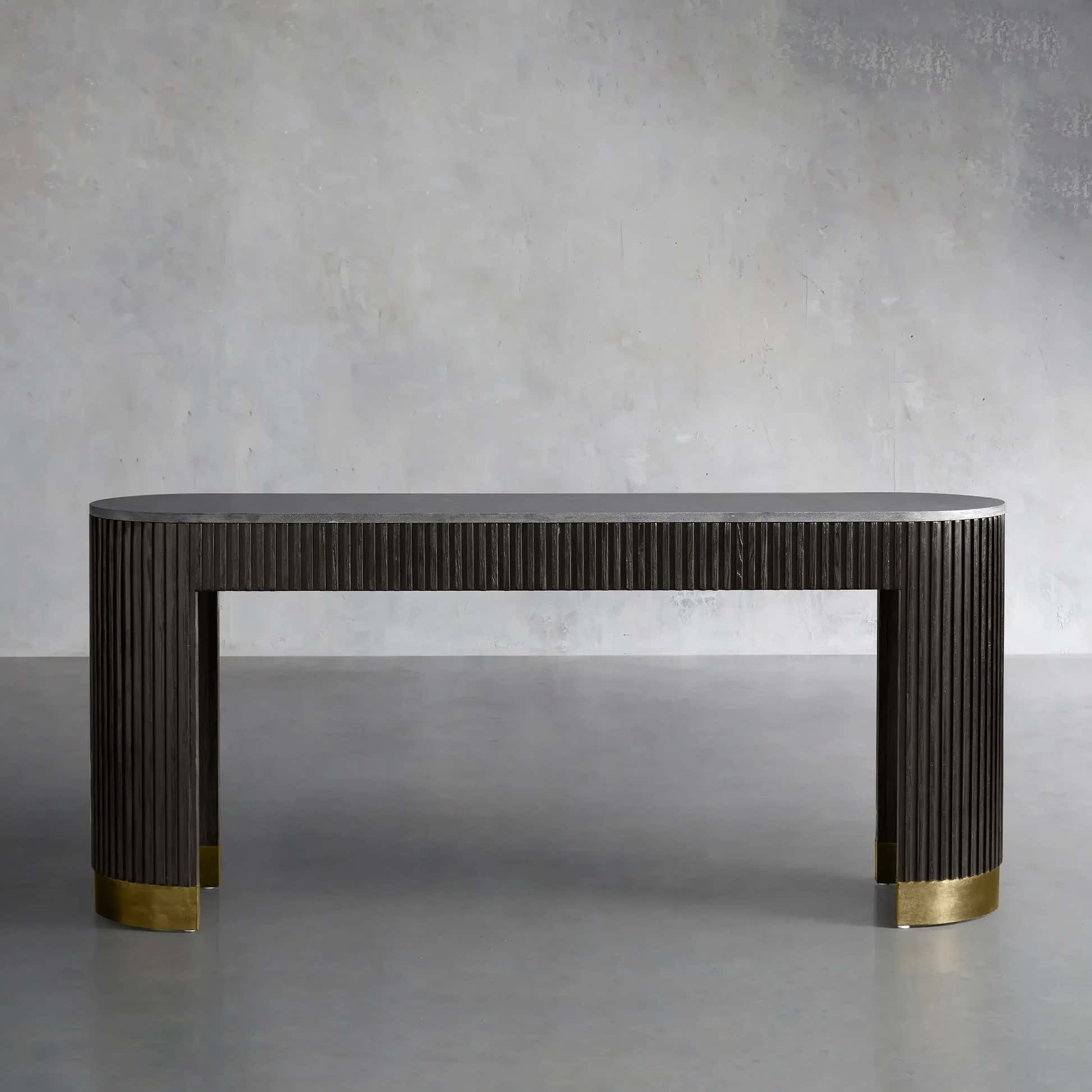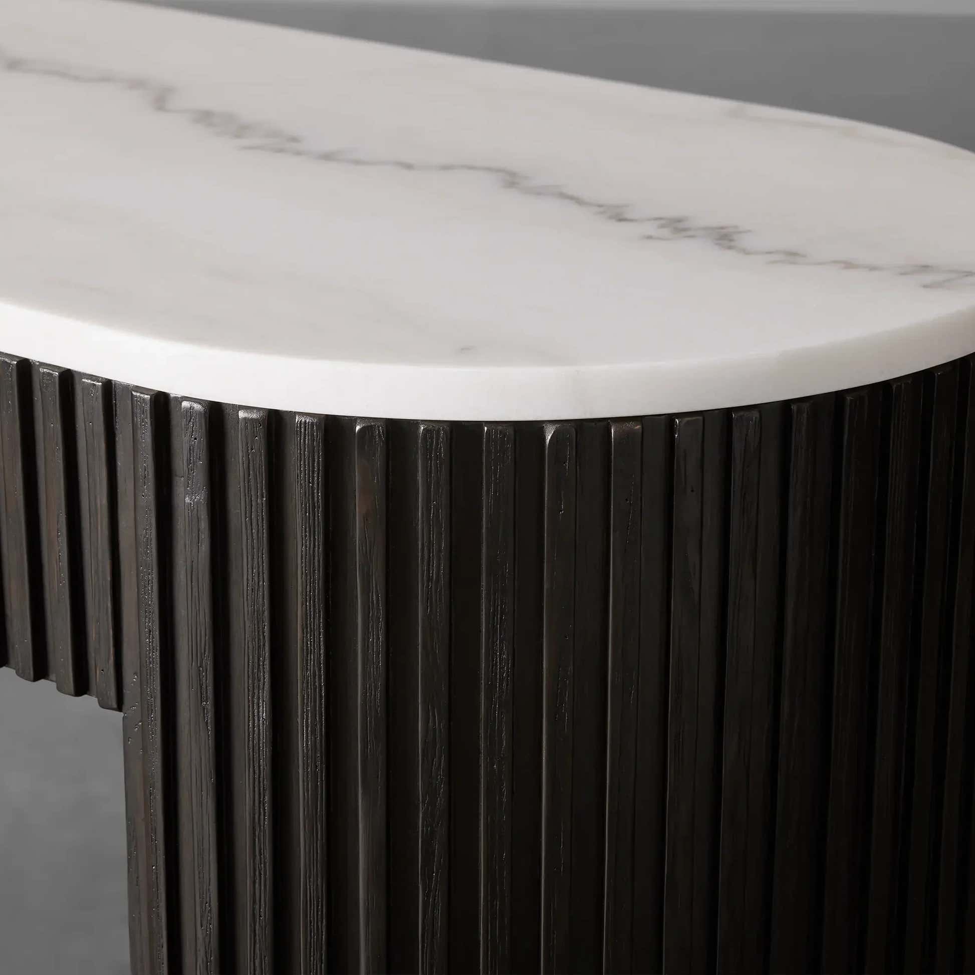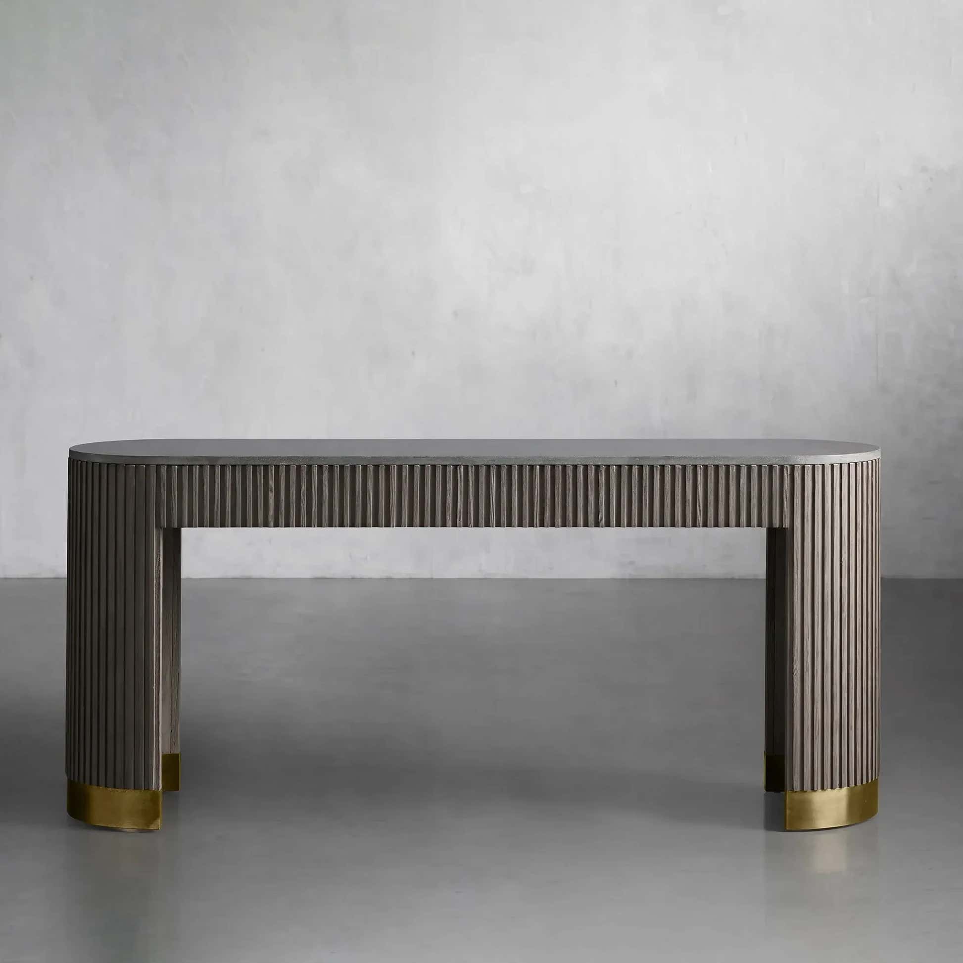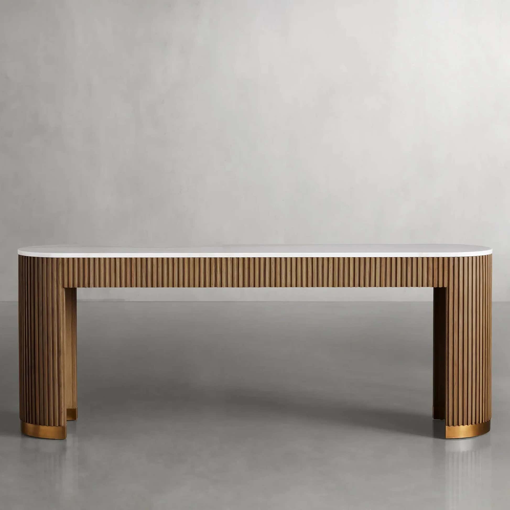 The Arden Console Table embodies the refined mixed-material aesthetic of the Arden Collection, offering a sleek profile with rich natural textures. Crafted from hand-finished Finnish pine or white oak, the streamlined frame is accented with reeded oak detailing and grounded by a brass-finished plinth base. A stone top—available in Carrara, Bluestone, or White Marble—adds a luxurious contrast. Perfect for entryways, living rooms, or behind a sofa, the Arden Console Table brings a sculptural elegance that feels both grounded and sophisticated.