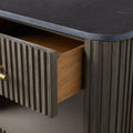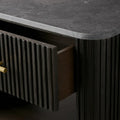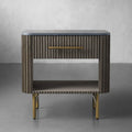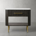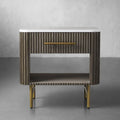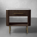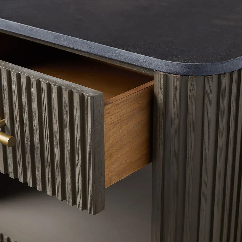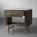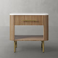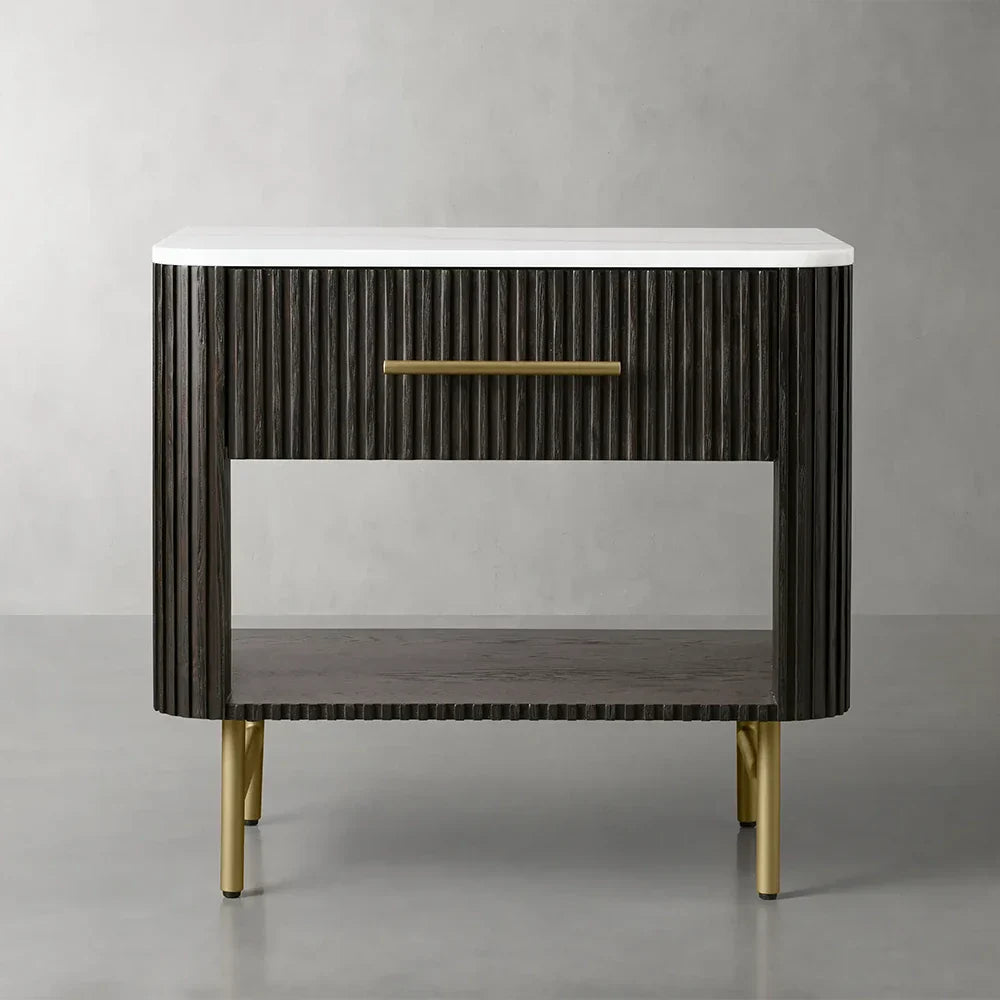 The Arden Open Nightstand blends natural materials and sculptural form in a compact, functional design. Crafted from hand-finished Finnish pine or white oak, it features the collection’s signature reeded oak detailing and rests on a brass-finished zinc-alloy plinth base. The open lower shelf offers easy-access storage for books, baskets, or bedside essentials, while the stone top—available in Carrara, White Marble, or Bluestone—adds a refined layer of texture and contrast. Thoughtfully proportioned and effortlessly versatile, the Arden Open Nightstand brings warmth and sophistication to any bedroom setting.
