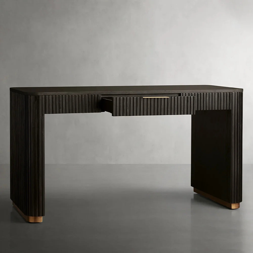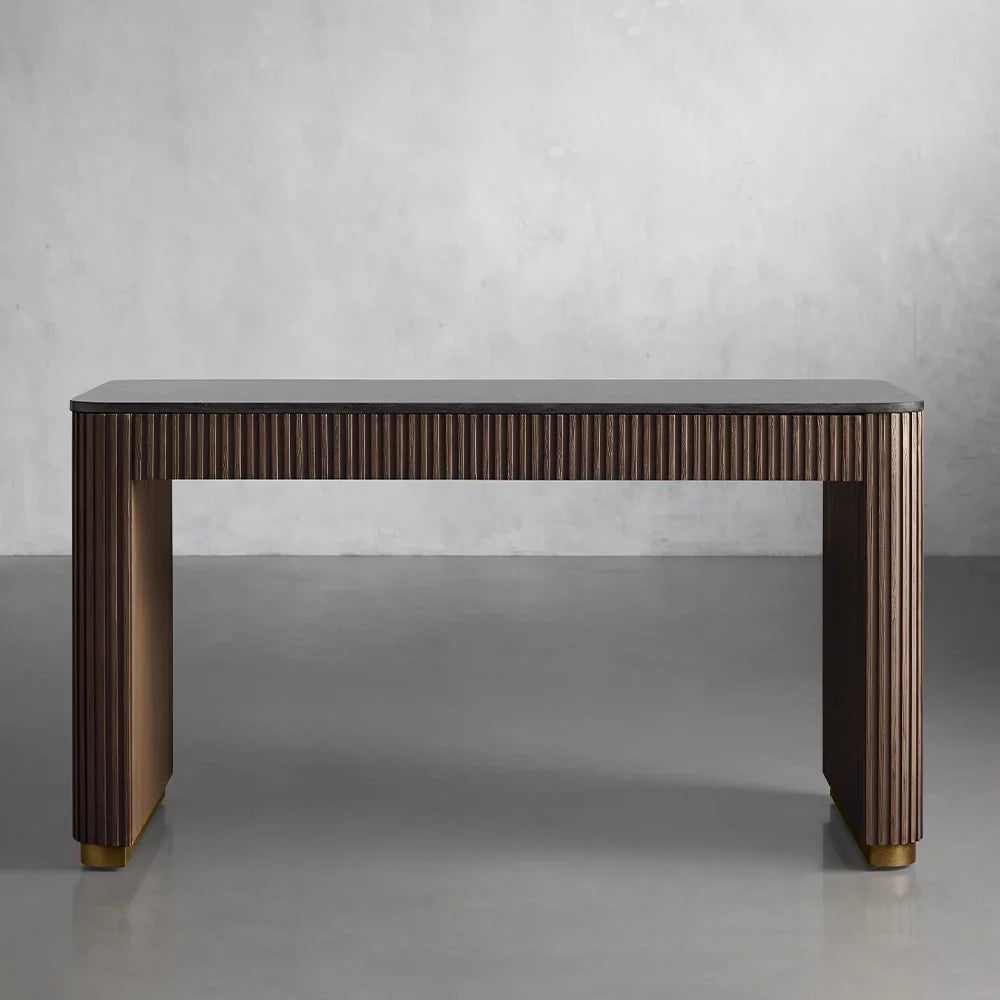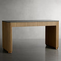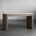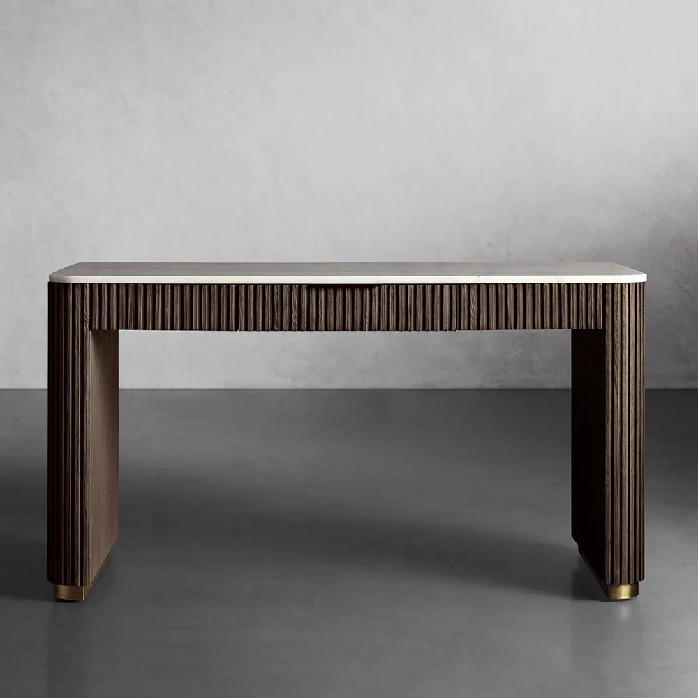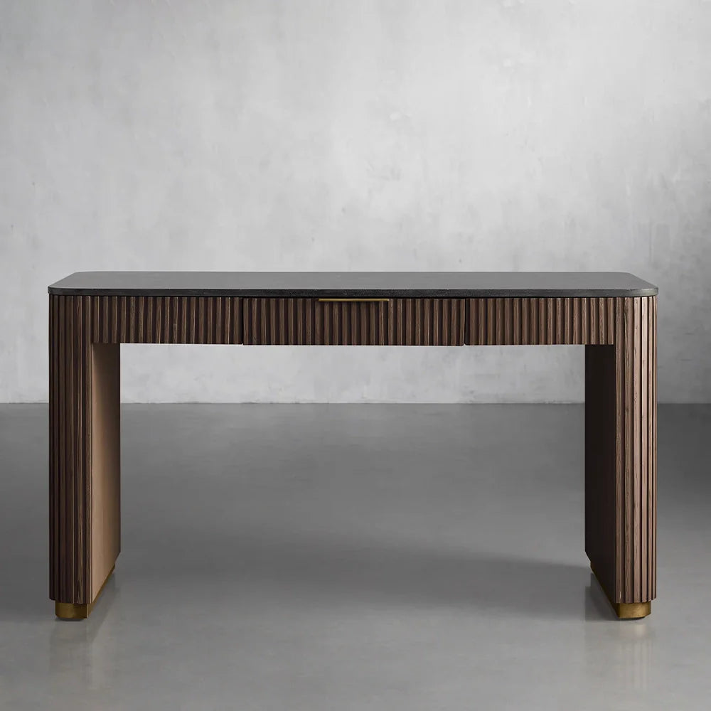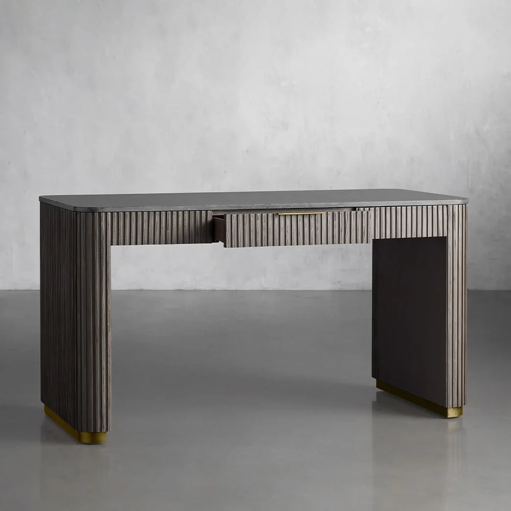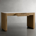 The Arden Writing Desk brings refined materiality and sculptural form to your workspace. Crafted from hand-finished Finnish pine or white oak, the desk is accented with reeded oak detailing and grounded by a zinc-alloy base with a light brass finish. A stone top—available in Carrara, White Marble, or Bluestone—adds a layer of natural elegance and durability. Whether placed in a home office or creative studio, the Arden Writing Desk blends timeless design with everyday function, making it a centerpiece for focus, clarity, and elevated style.