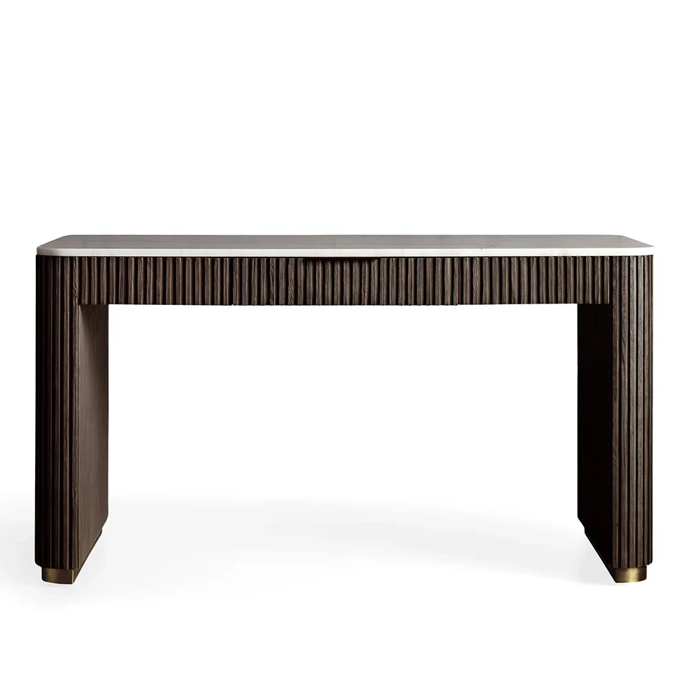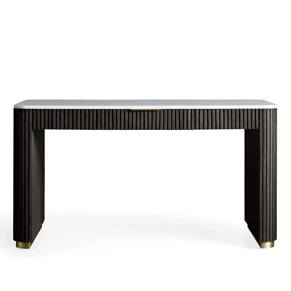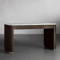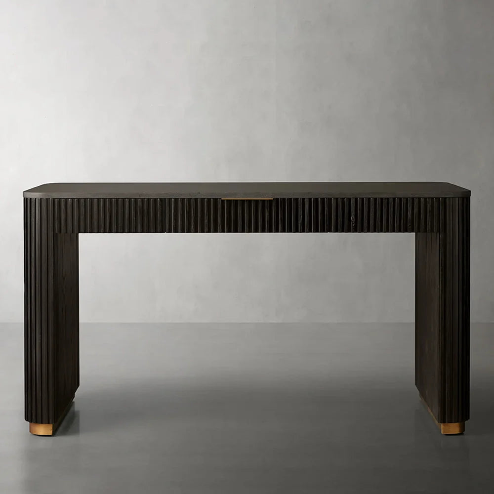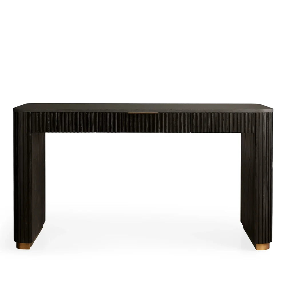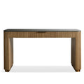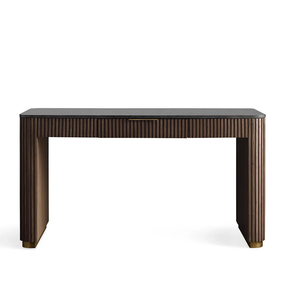 The Arden Writing Desk brings refined materiality and sculptural form to your workspace. Crafted from hand-finished Finnish pine or white oak, the desk is accented with reeded oak detailing and grounded by a zinc-alloy base with a light brass finish. A stone top—available in Carrara, White Marble, or Bluestone—adds a layer of natural elegance and durability. Whether placed in a home office or creative studio, the Arden Writing Desk blends timeless design with everyday function, making it a centerpiece for focus, clarity, and elevated style.