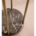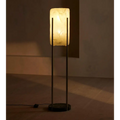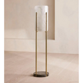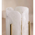 Sleek brass frame supports a sculptural alabaster shade, resting on a polished marble base. A refined lighting piece designed for contemporary interiors, casting a soft, diffused glow.
