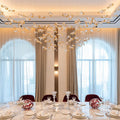 Crystal petals float to the ground like icy snowflakes. A centerpiece fit for snow queen‘s palace, where the delicate and fragile hand-blown pieces glide suspended from the ceiling in various dreamy formations. The delicate artisan crystal glass components embody the fragility of flowers touched by the first frost. The icy effect intensified by adding a color gradient and gilded edges state true luxury.