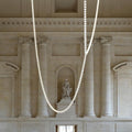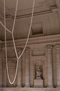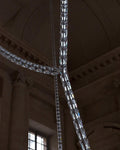 The award-winning designer created a majestic crystal chandelier whose elegance and modern lines blend harmoniously with the historic location. The piece hangs from the ceiling like a glowing transparent snake. It consists of three interlacing lines, each made of hundreds of crystals, illuminated by a glowing LED light source that emits a soft, continuous and surrounding light.