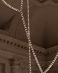 The award-winning designer created a majestic crystal chandelier whose elegance and modern lines blend harmoniously with the historic location. The piece hangs from the ceiling like a glowing transparent snake. It consists of three interlacing lines, each made of hundreds of crystals, illuminated by a glowing LED light source that emits a soft, continuous and surrounding light.