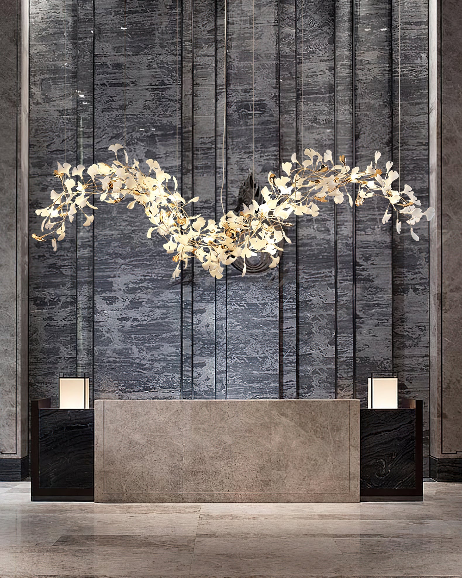 Gingko Chandeliers are impressive bespoke installations, composed of handcrafted porcelain leaves. The interplay between ceramic and light has the power to create a sense of well-being and warm atmosphere. The light sculpture goes much further than its functional purpose of lighting a space. By illuminating itself, it defines its own shape and presence, becoming a mesmerizing artwork. Like a living plant, it has a natural, dynamic energy that both calms and revitalizes us. The design of the installations goes hand in hand with the architectural space and with the ideas of the architects and interior designers.