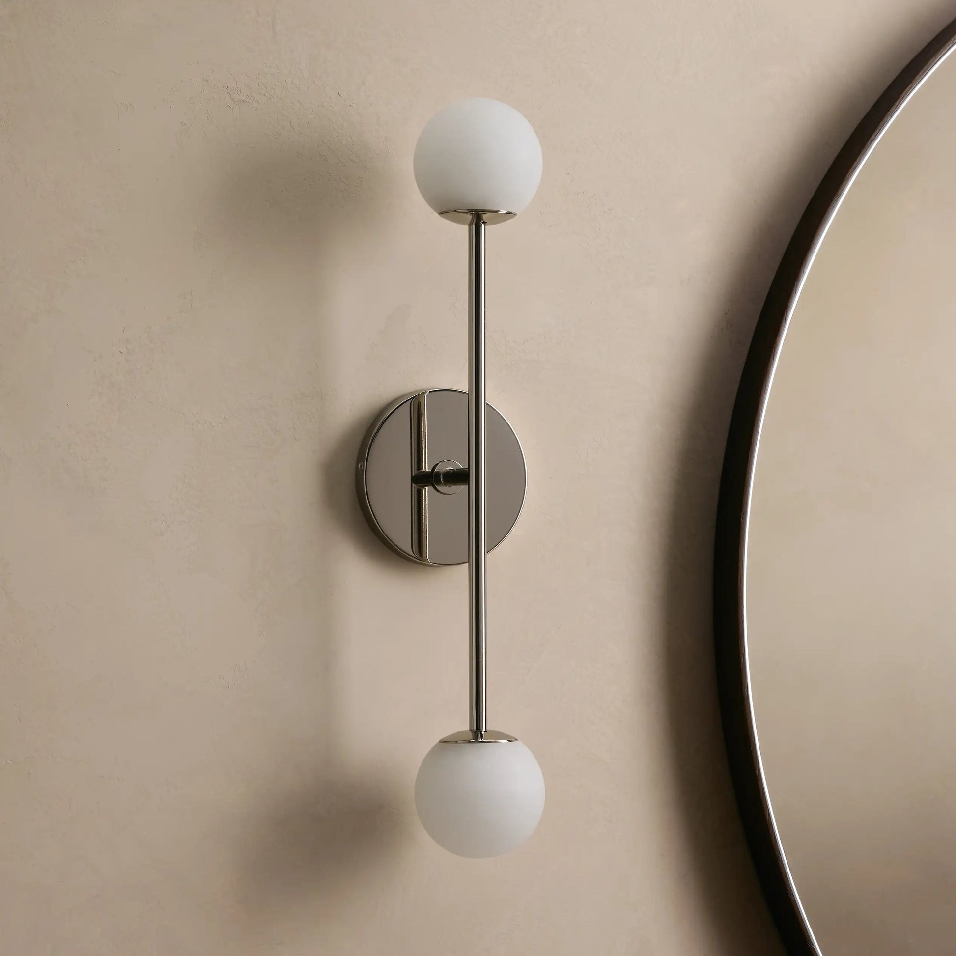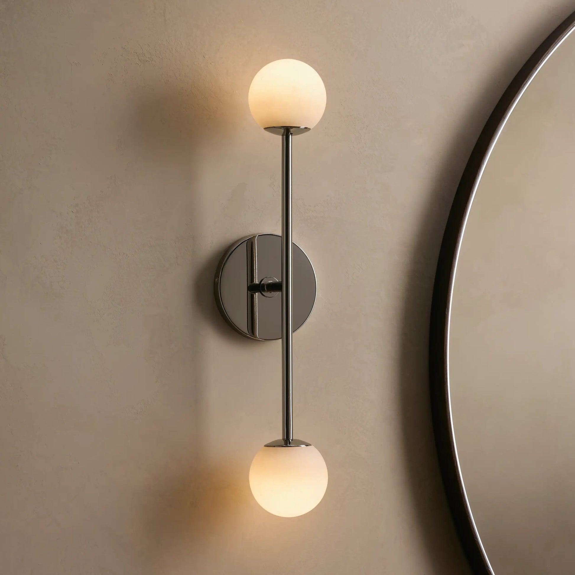 The Girouette Collection epitomizes modern geometric aesthetics, featuring fluid vertical lines that connect two luminous alabaster orbs. Whether you choose the classic Antique Brass or the sleek Polished Nickel finish, its slender silhouette blends seamlessly with a variety of contemporary bathroom styles. The soft, diffused LED light provides functional illumination without harsh glare, creating a vanity space that is both stylish and serene.