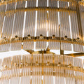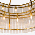 The perfect statement lighting piece, the Grande Double San Francisco features two tiers of ribbed glass panes in a drum formation, secured to a studded brass frame.