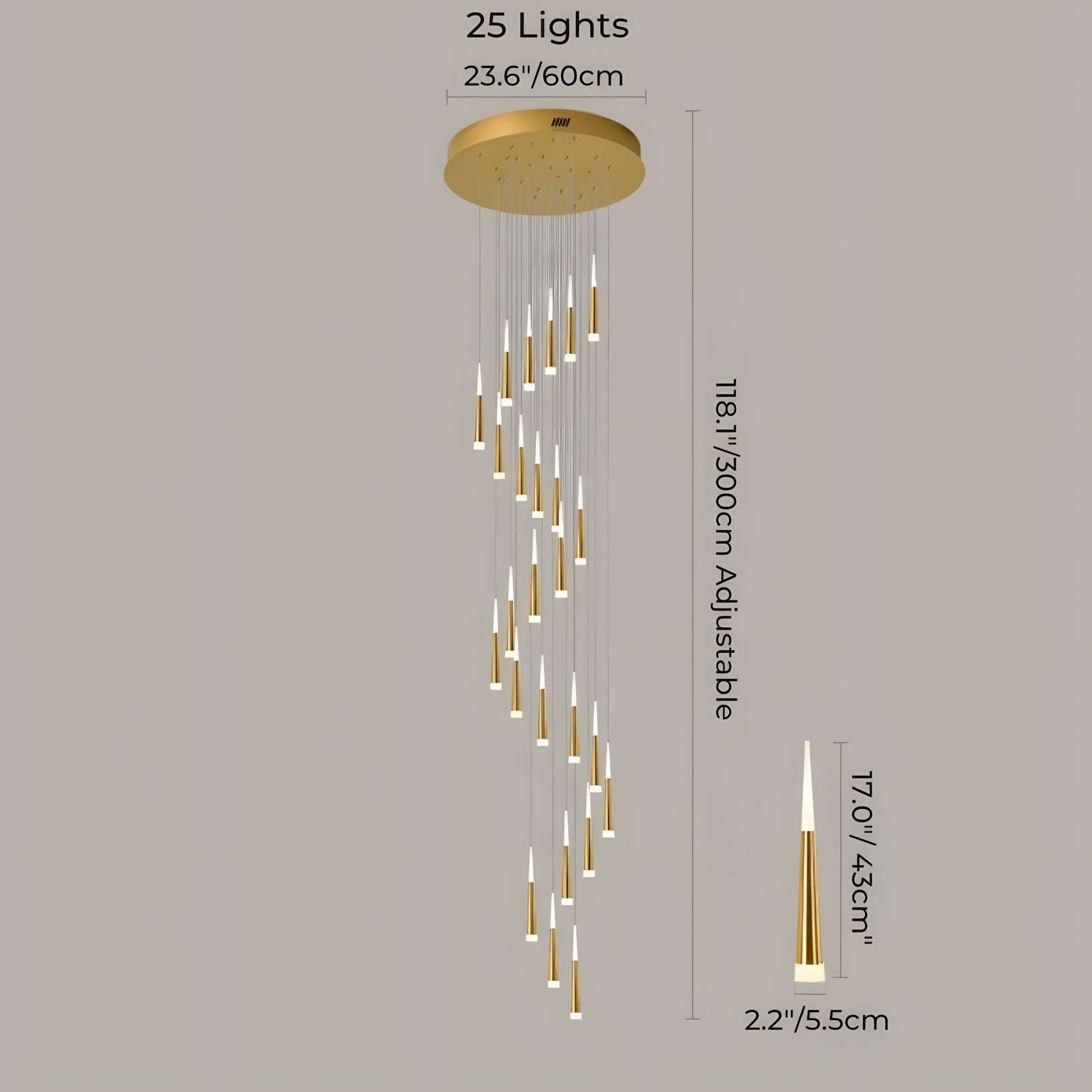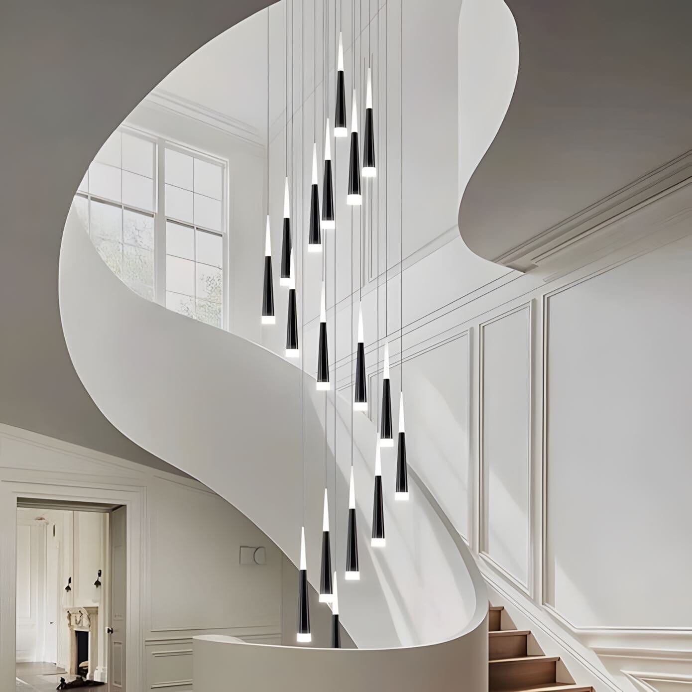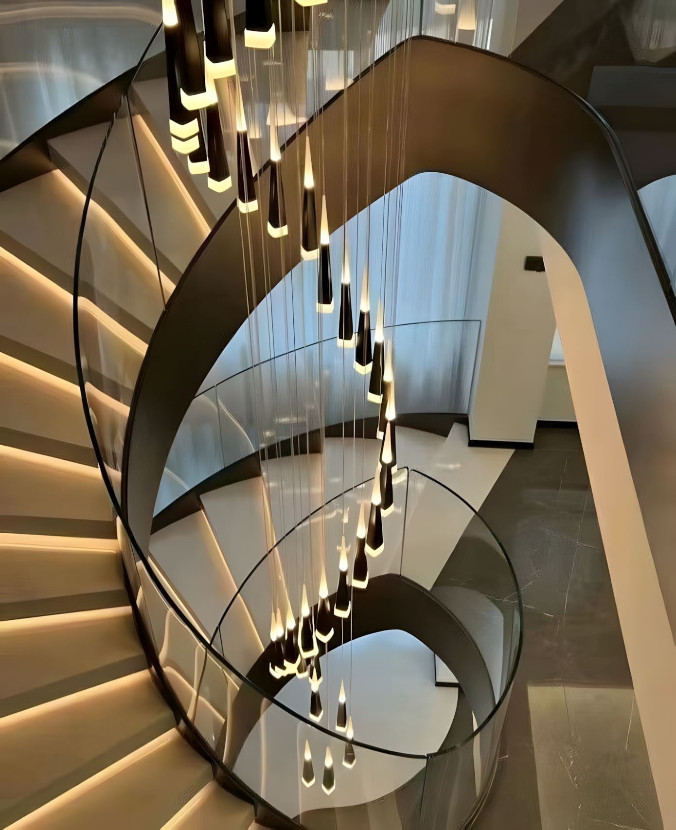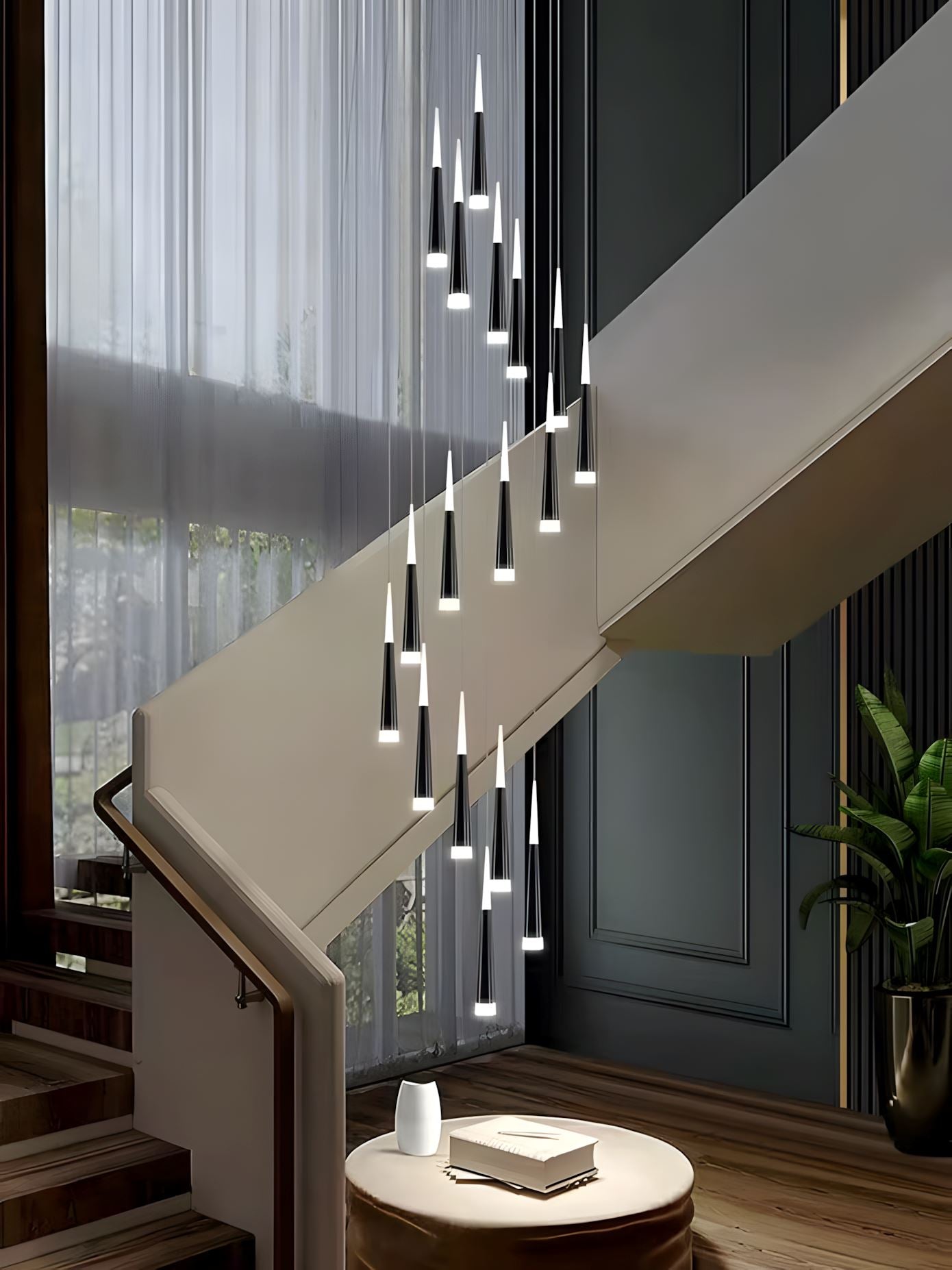 Contemporary in style and elegant in appearance, this masterpiece will catch anyone's eye with its striking contemporary design and captivating spiral staircase structure. The chain length is adjustable, with a weight of 6.9kg and a maximum compatible wattage of 120W.