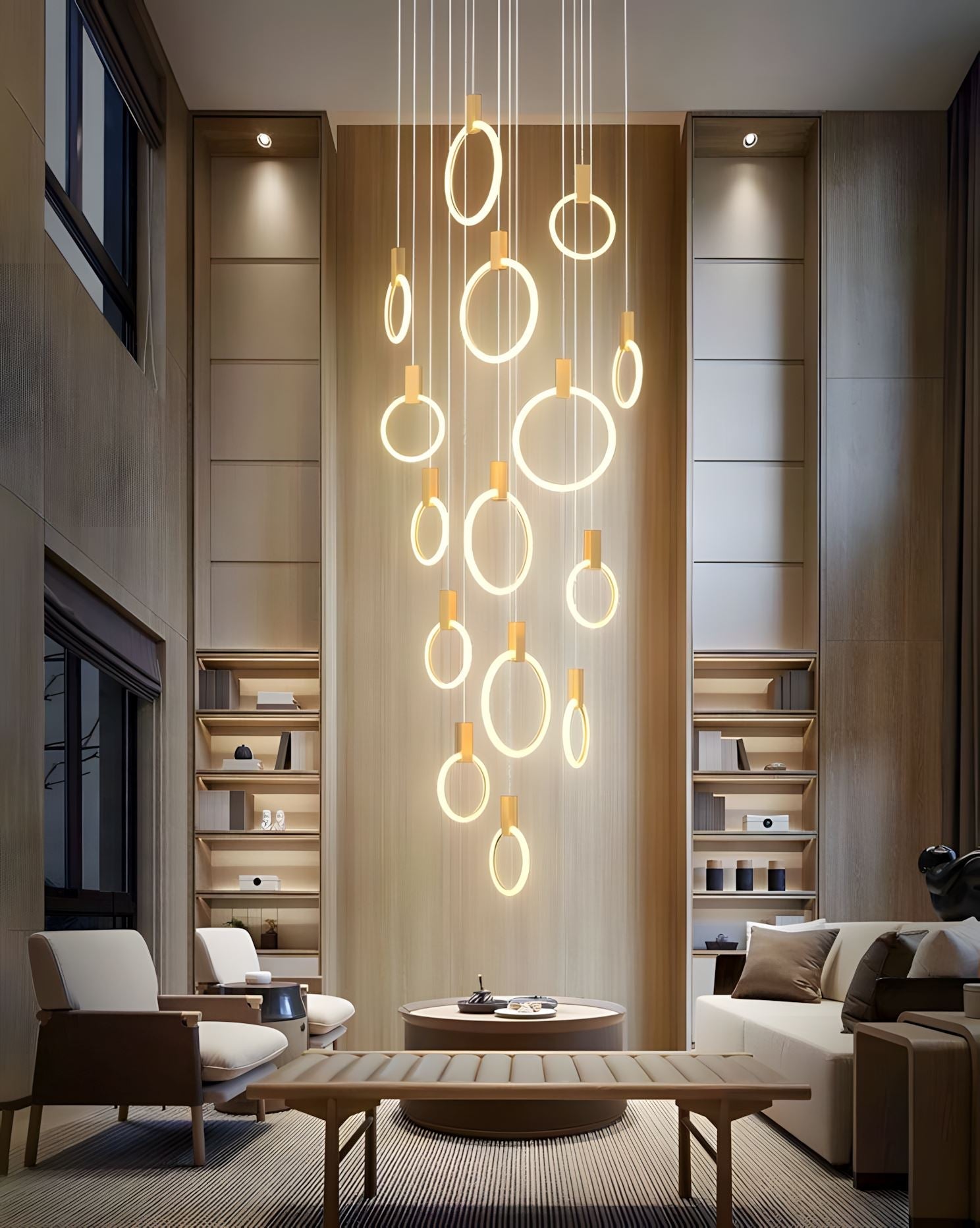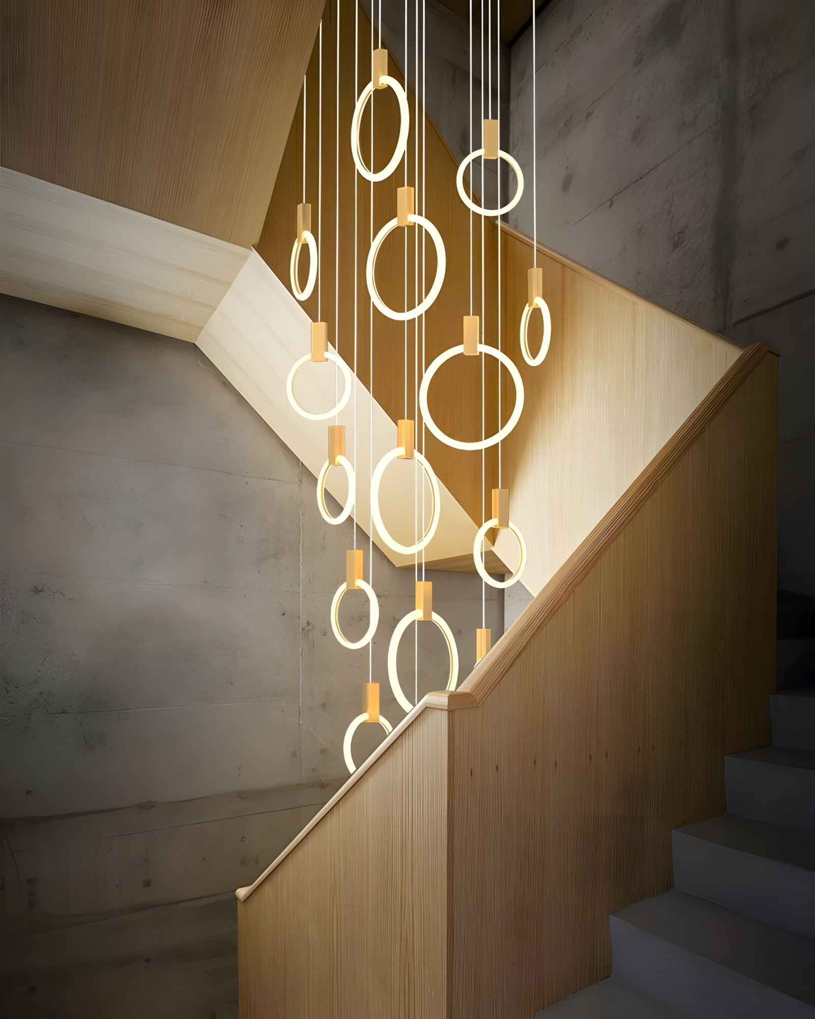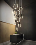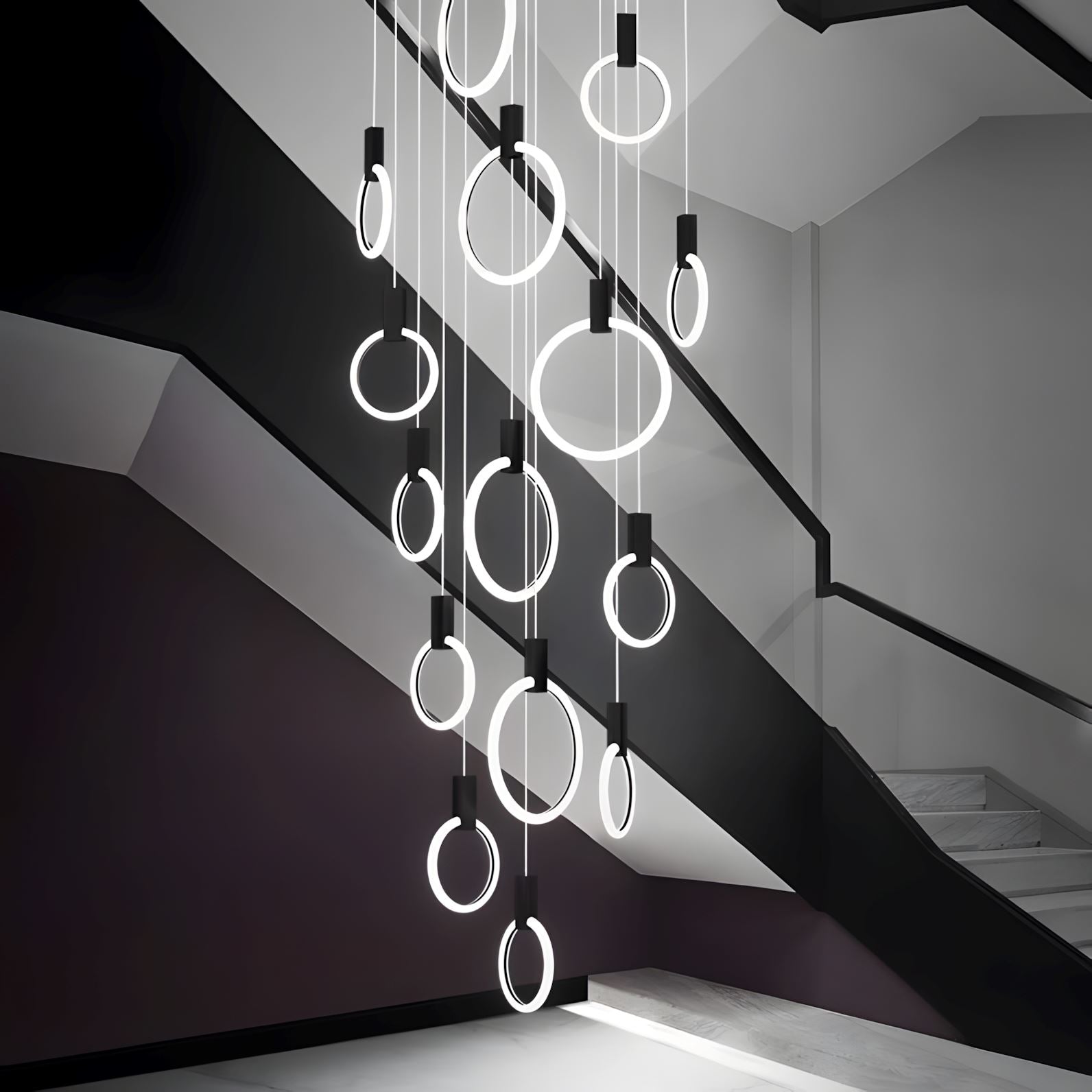 Suitable for any indoor space with high ceilings, these pendant lights work as decorative focal points in a room thanks to their eye-catching Acrylic Ring black accents.