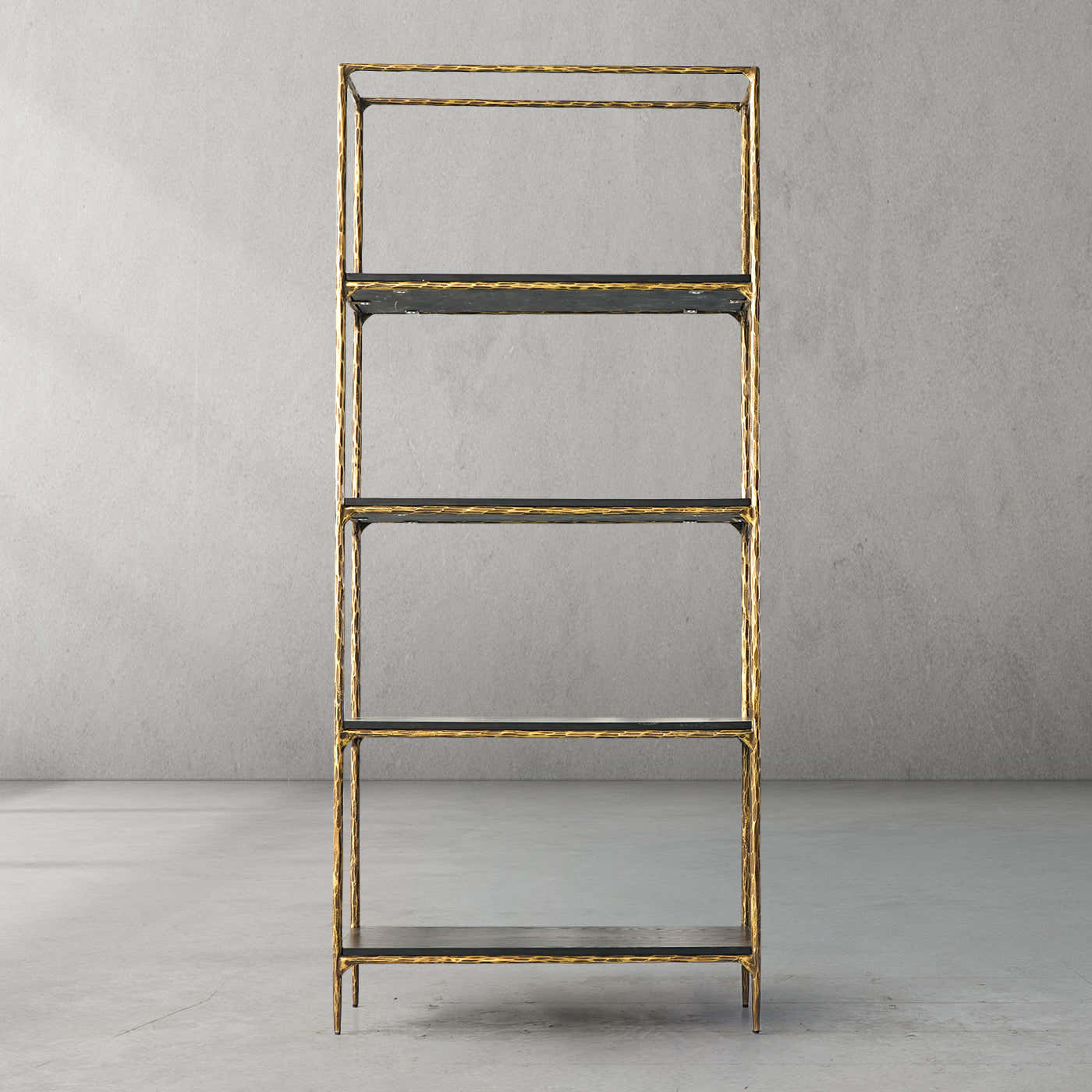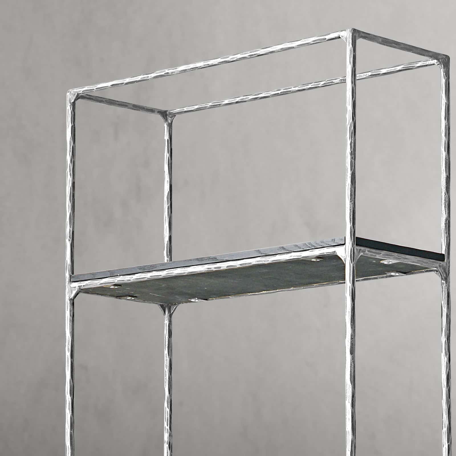 Our collection combines a hand-forged metal base with the rustic feel of marble shelving. Using an ancient crafting technique, artisans hand-hammer metal strips for a vibrant, imperfectly organic texture that complements the frame's slim, tapered silhouette.