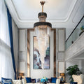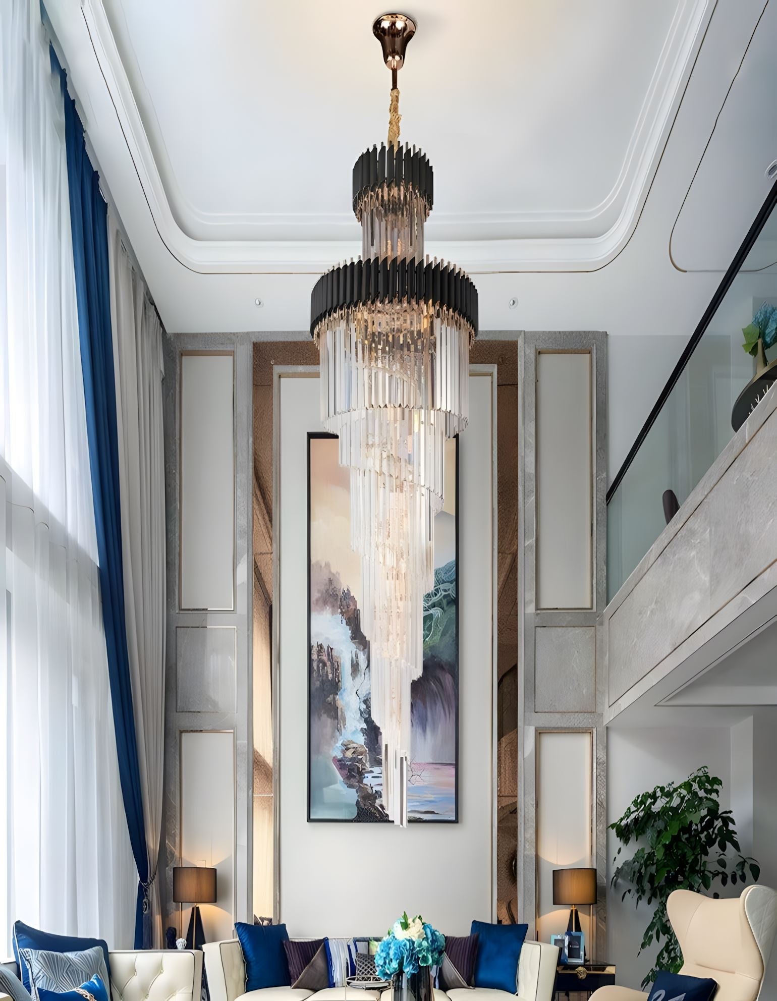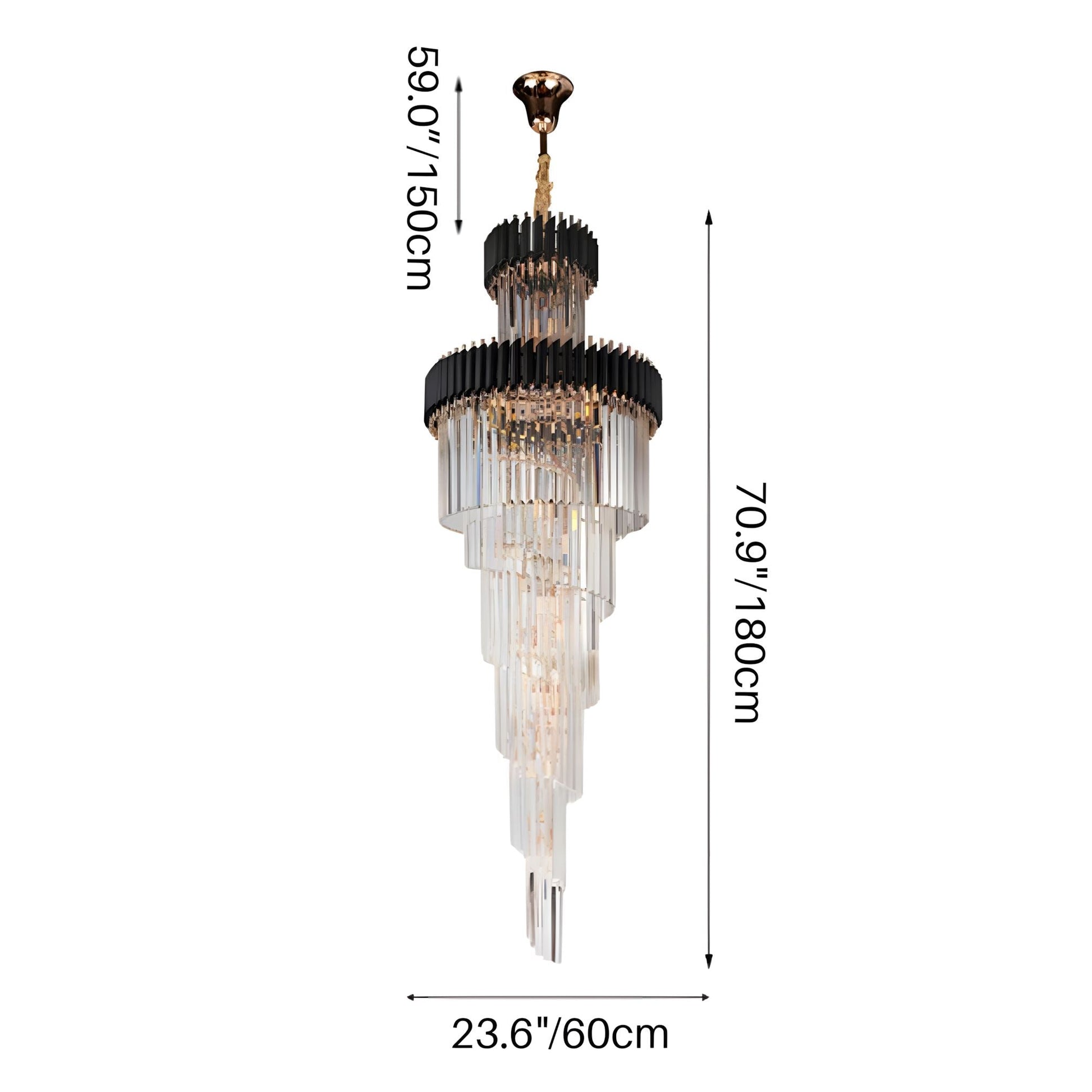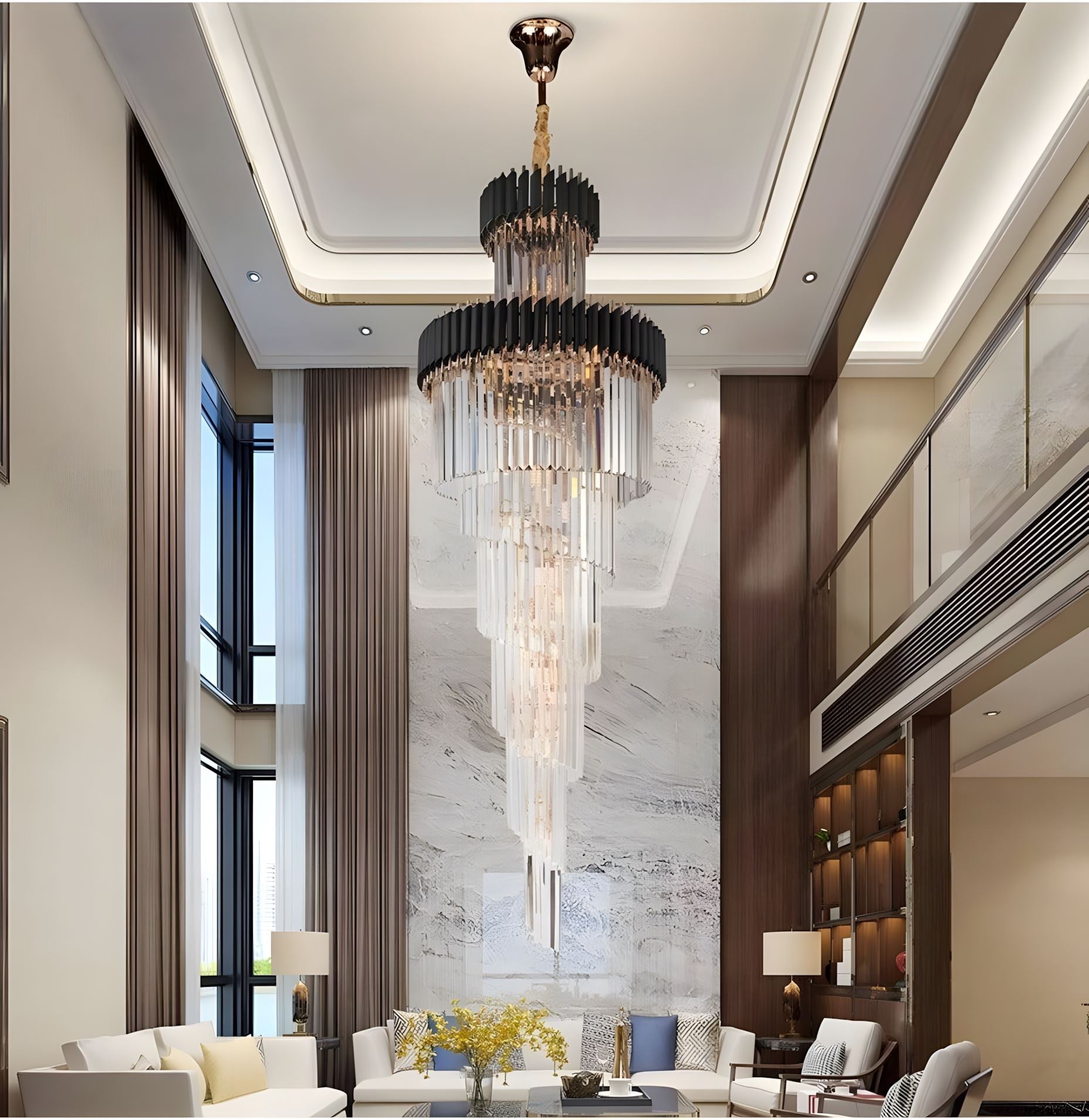 With its elegant design, the gold and crystal two-tier double-volume chandelier is the perfect addition to elevate any double-volume space into a breathtaking work of art. Indulge in the epitome of sophistication and indulge in the grandeur of this magnificent chandelier.The length of the wire is about 59.0" or about 1.5 meters. It's adjustable to fit your needs.