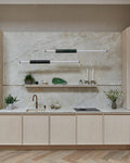 - Polished marble + frosted glass with solid brass/aluminum finishes.