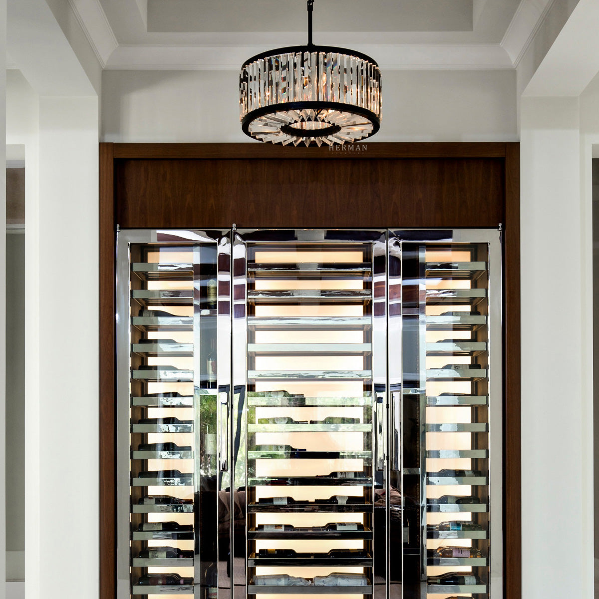 The Lita collection is handcrafted from a single iron frame, the entirety of which is covered by a dense array of rectangular prisms. Each prism is made of optical-grade glass, which is clearer and lighter than crystal, and reflects light in all directions, creating a stunning effect.