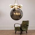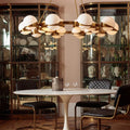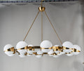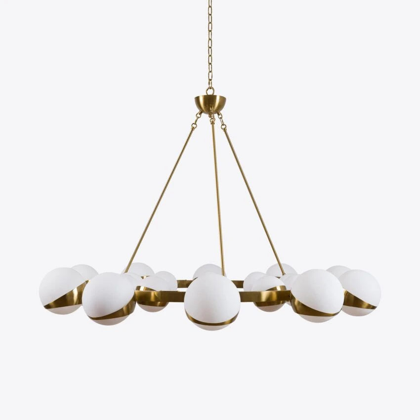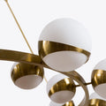 Introducing our new Lucca Sputnik chandelier, inspired by a 1970s Murano aesthetic. This elegant design comes in two sizes and showcases opaline glass globes adorning both the inner and outer edges of its brass-finished frame. The larger model boasts 20 globes, with 10 smaller shades clustered near the center and 10 accentuating the outer perimeter. The smaller variant features 12 globes, including 6 petite shades at the core and 6 along the outer rim.