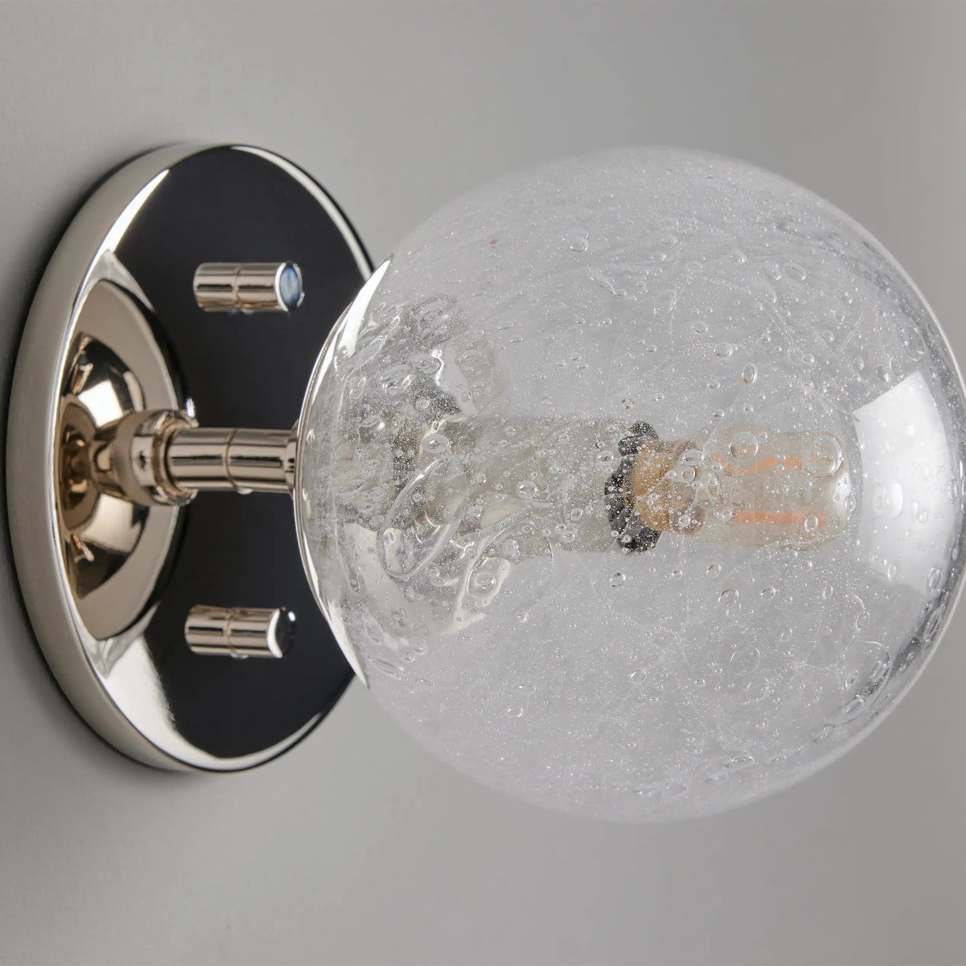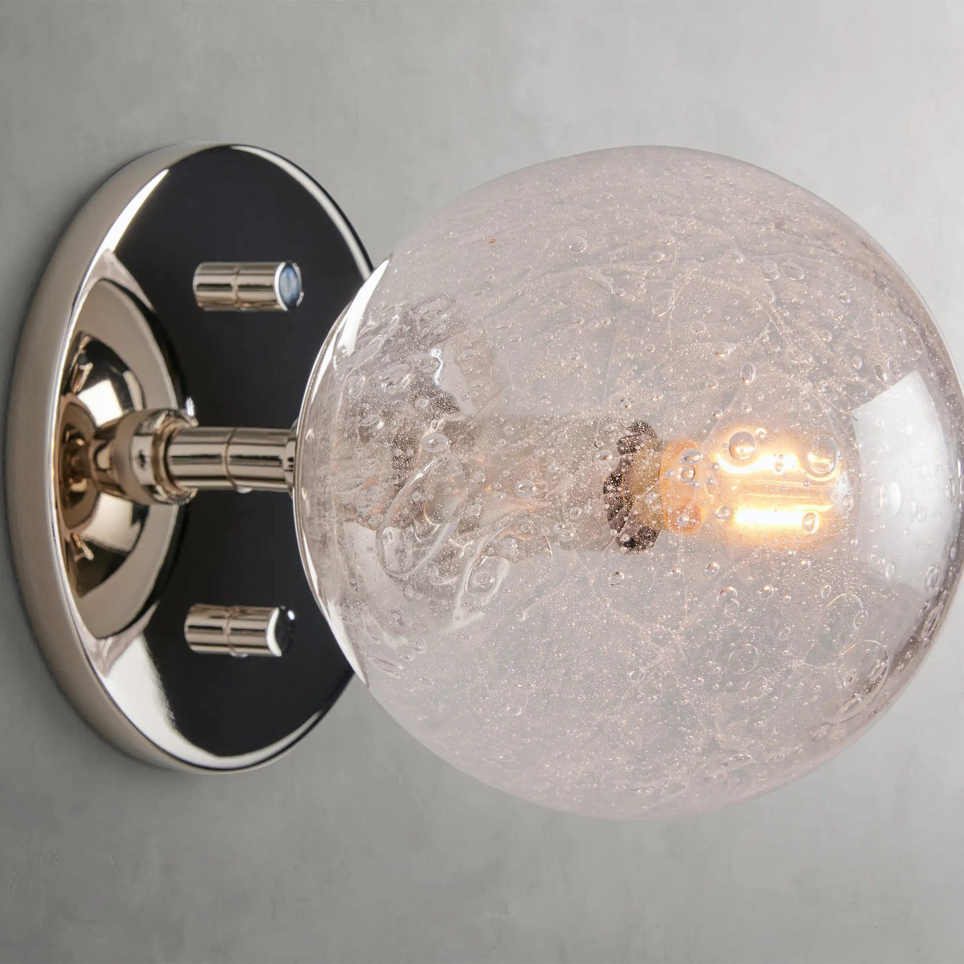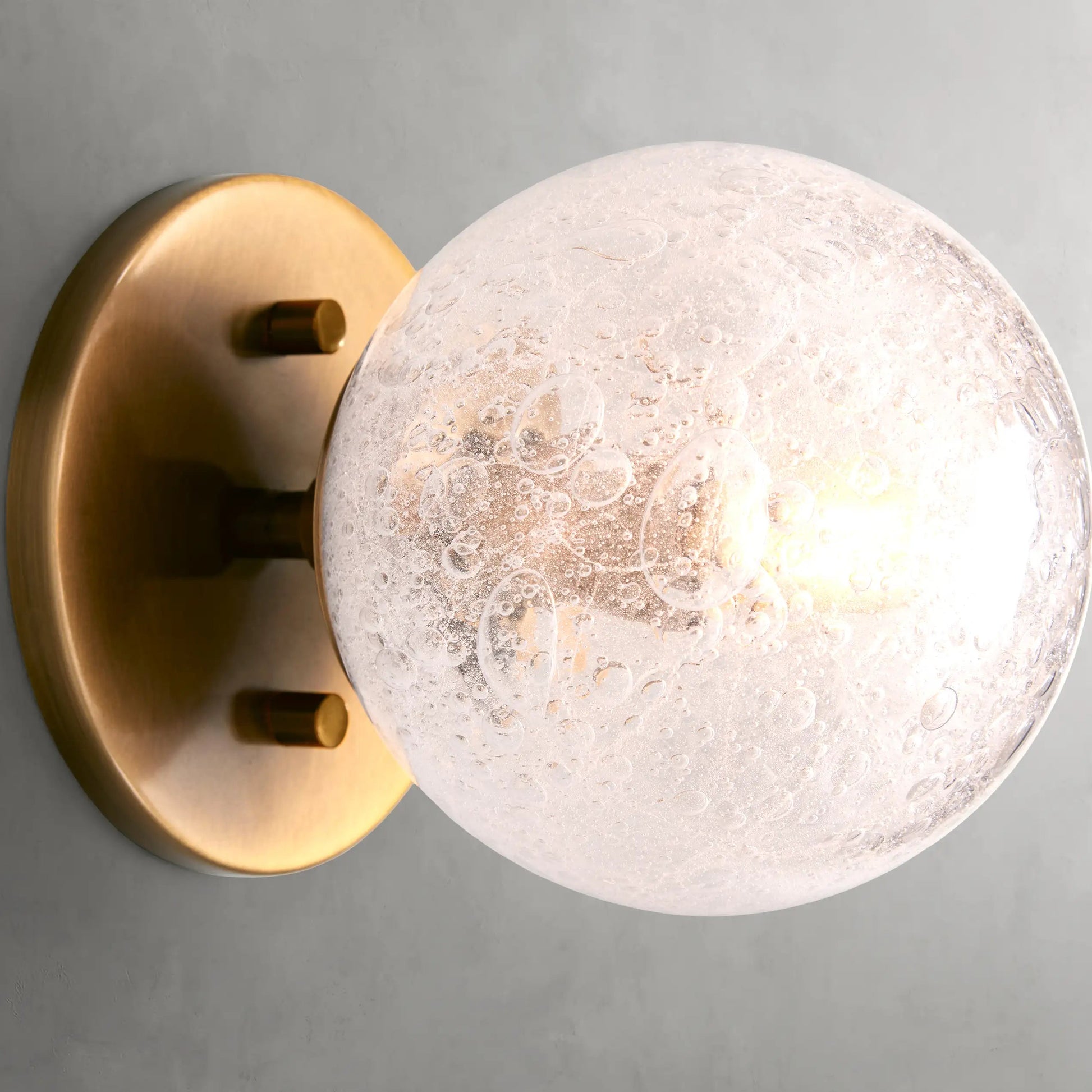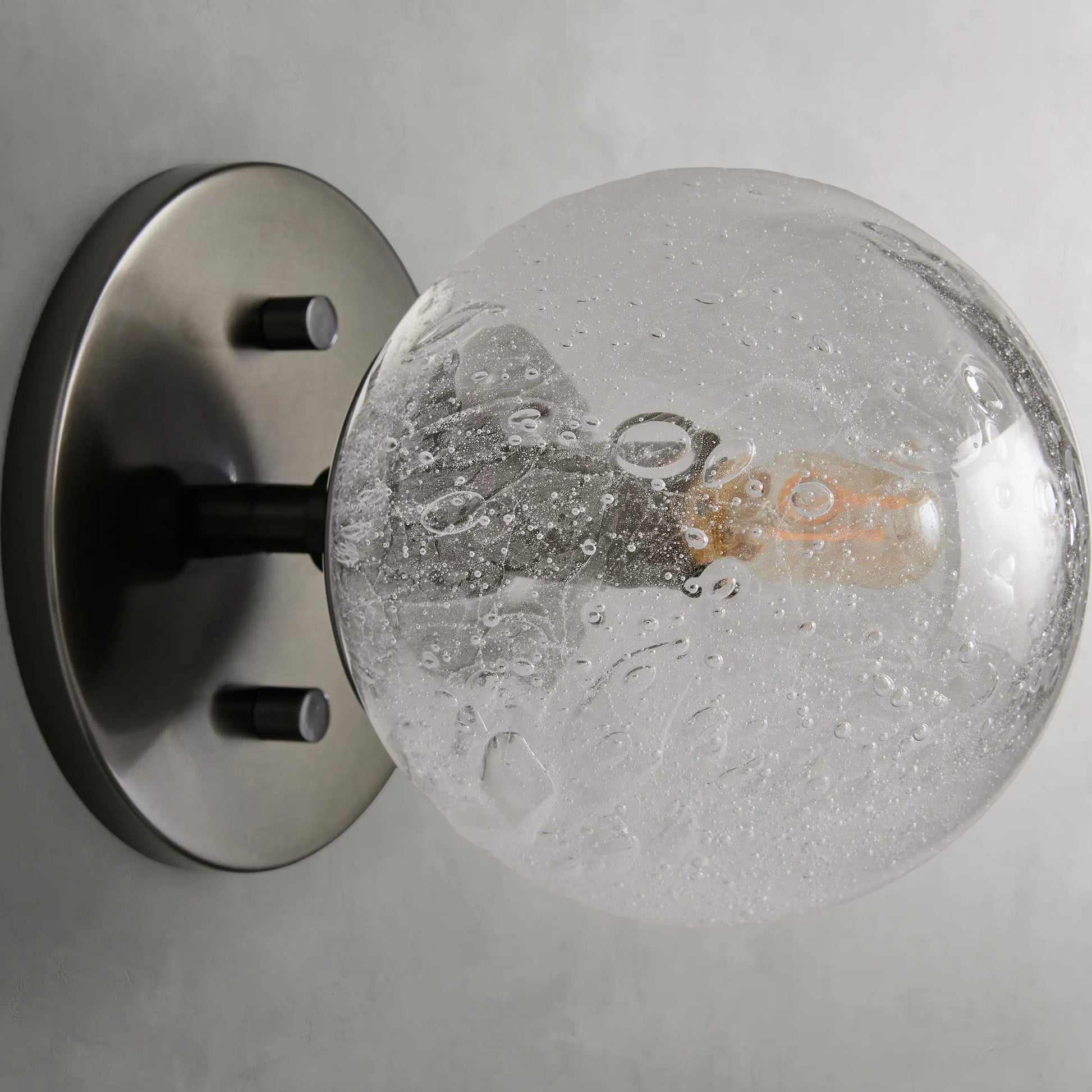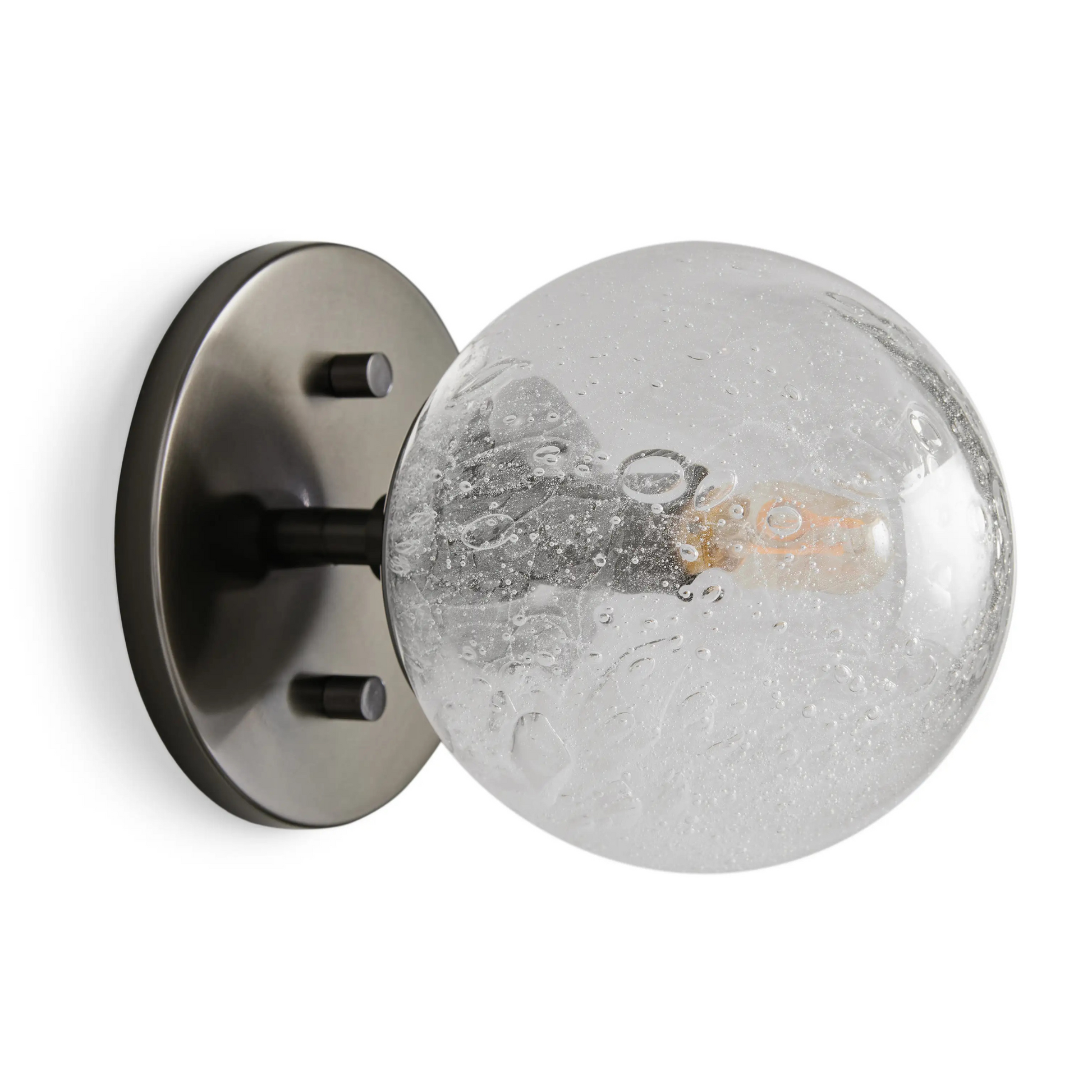 A fusion of rustic charm and industrial design, our Mandoza Collection features stunning silhouettes and mixed-material style. Each individual glass globe is hand-blown with a reactive technique, creating a dense network of bubbles under a thick layer of glass. The result has a striking effect when illuminated from within, casting light from every angle.