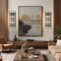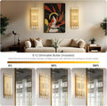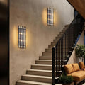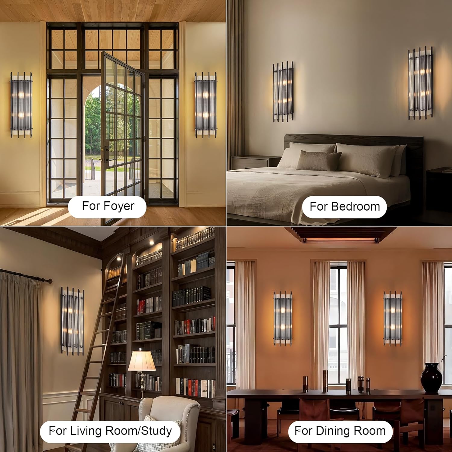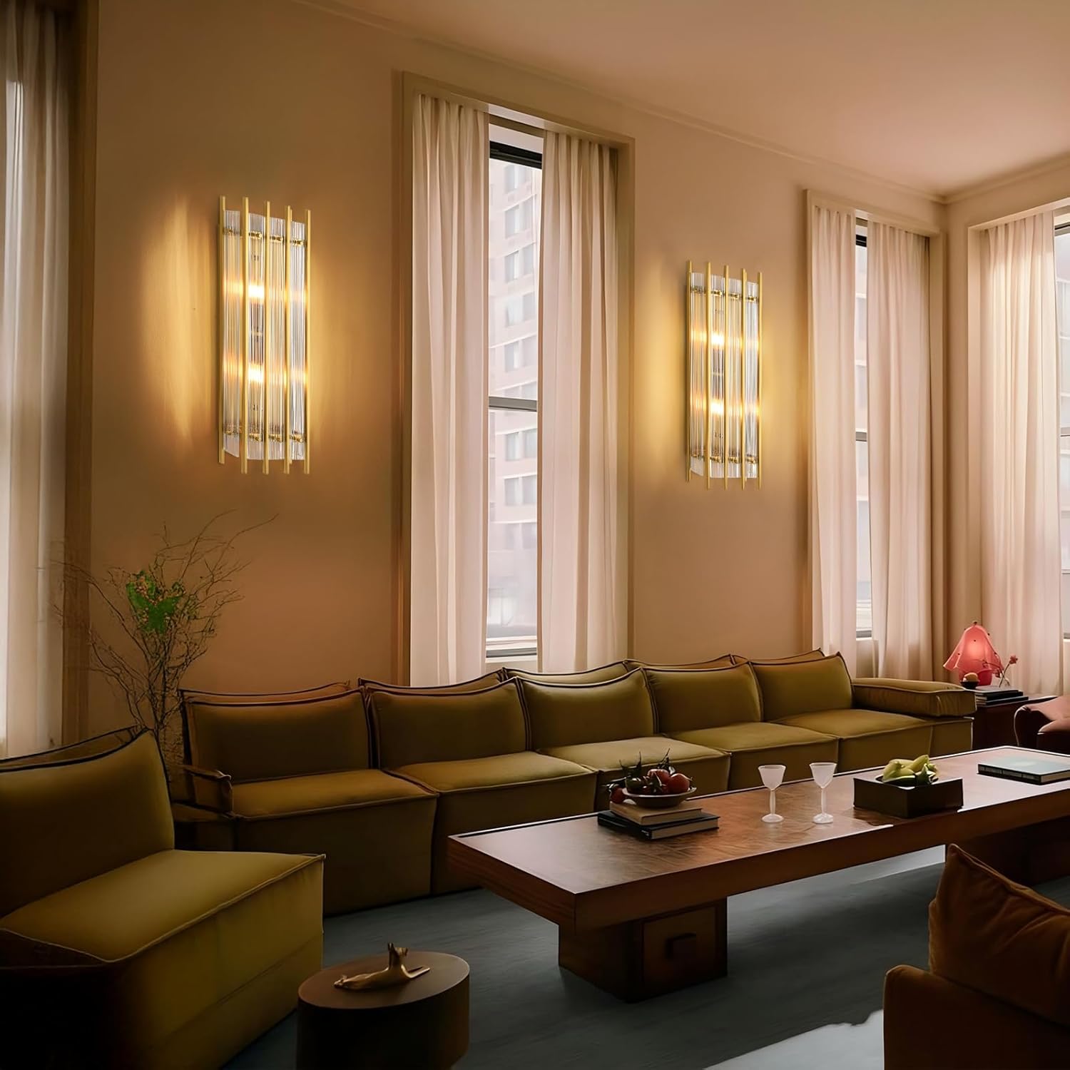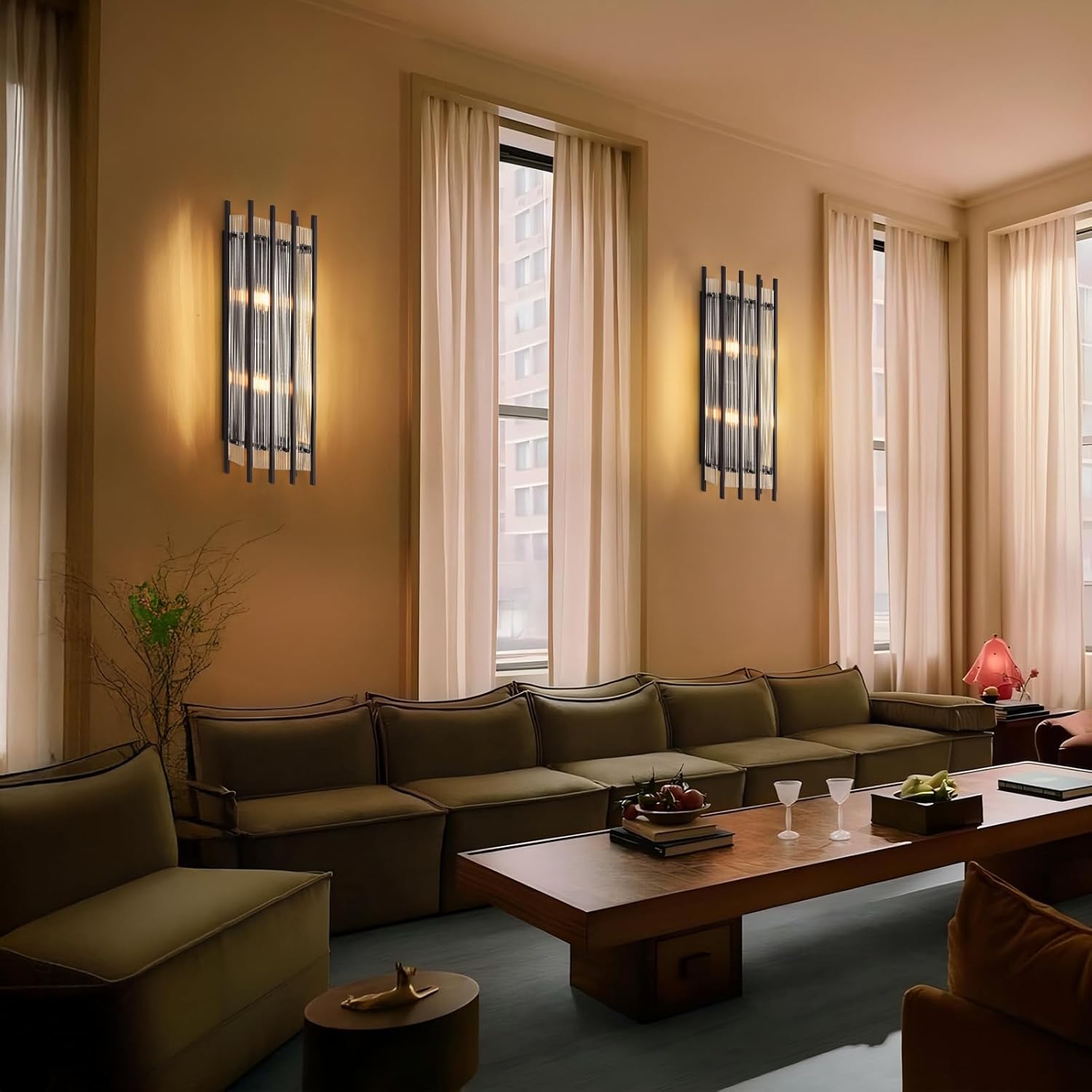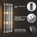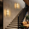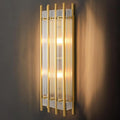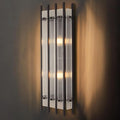 Features five long, solid transparent glass panels with hand-pressed grooved textures, creating a structured, linear pattern for a dramatic visual effect.