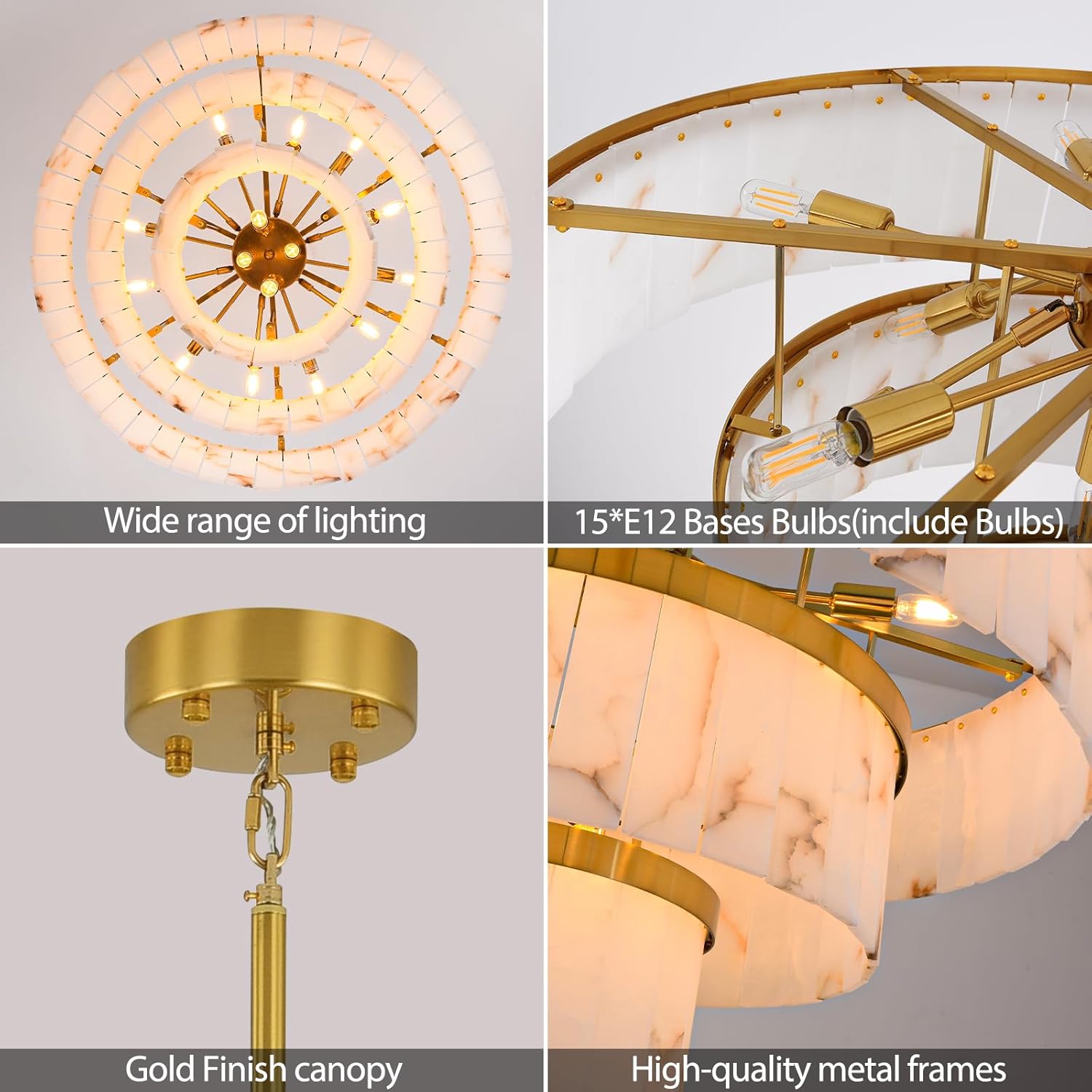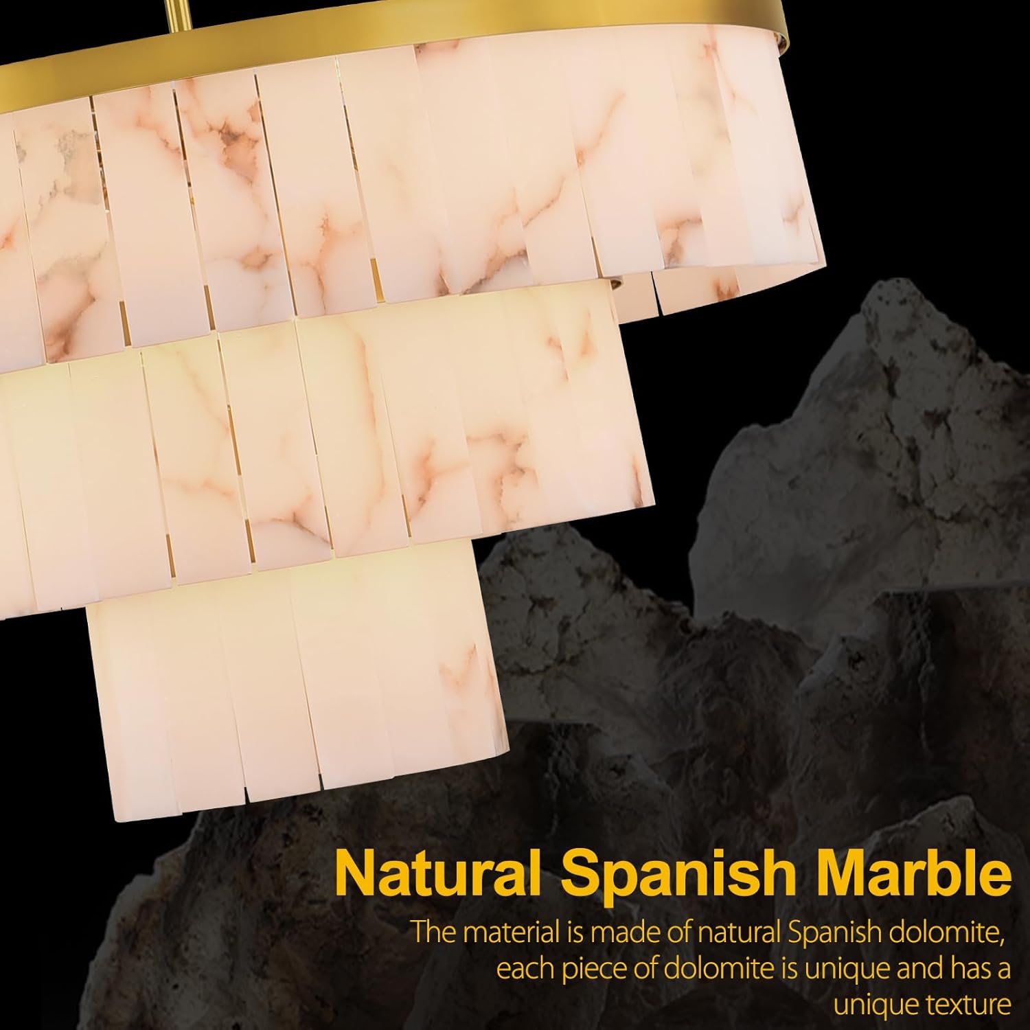 Gold Alabaster chandelier is made of natural marble from Spain, each piece of marble is imported from Spain.3 tiers Alabaster Chandelier adopts 100 pieces of marble, 3 tier round design from the inside to the outside, simple and exquisite. The modern marble chandelier is a one-of-a-kind work of art, whether the light is on or off, you can see the unique and distinctive texture of each piece of marble.
