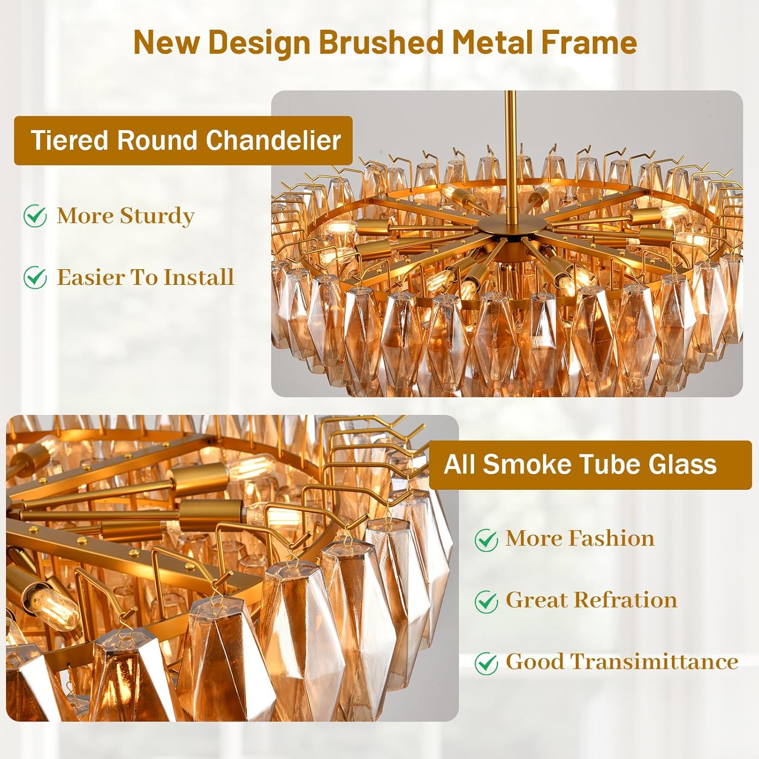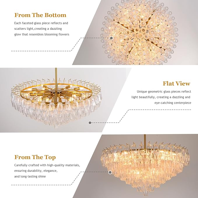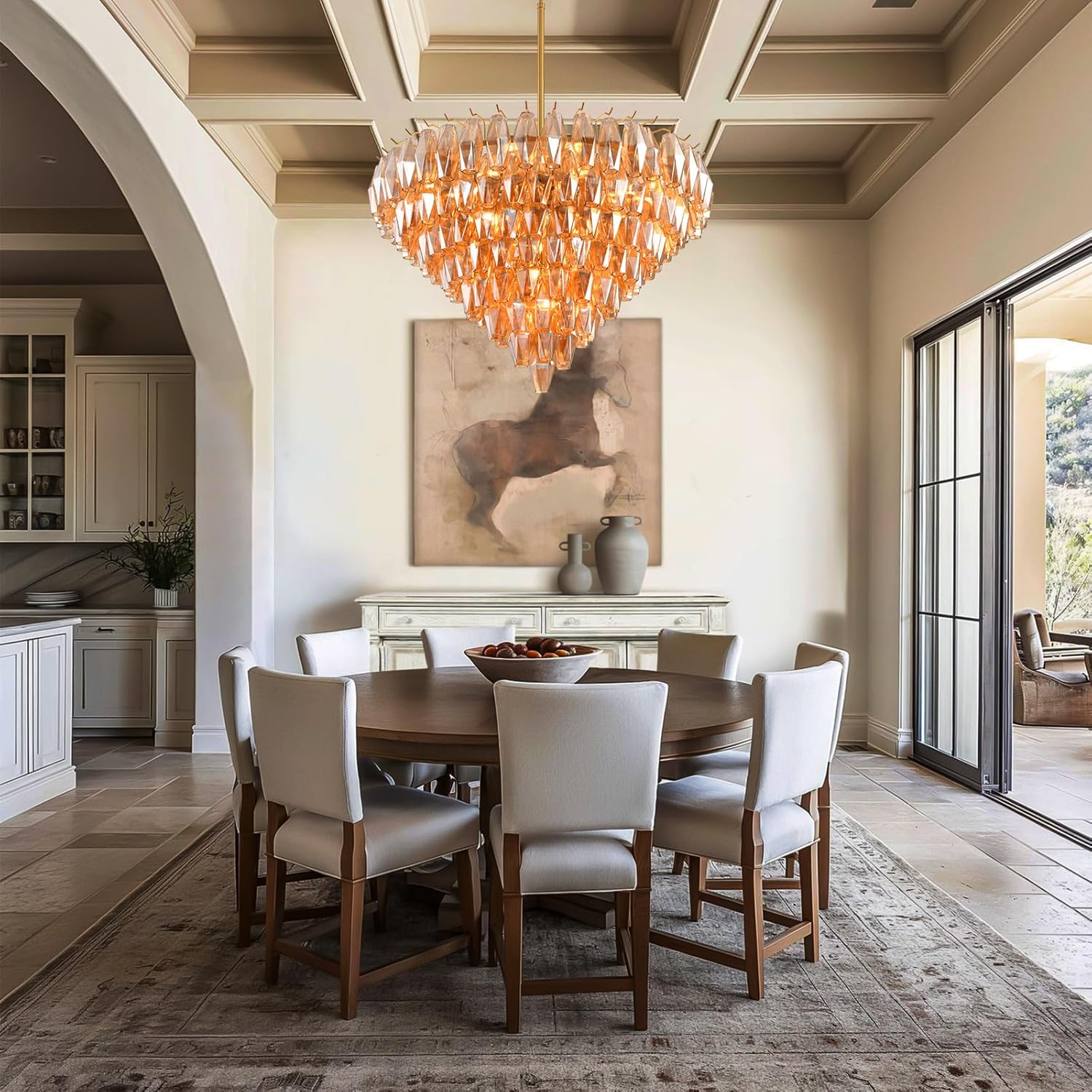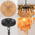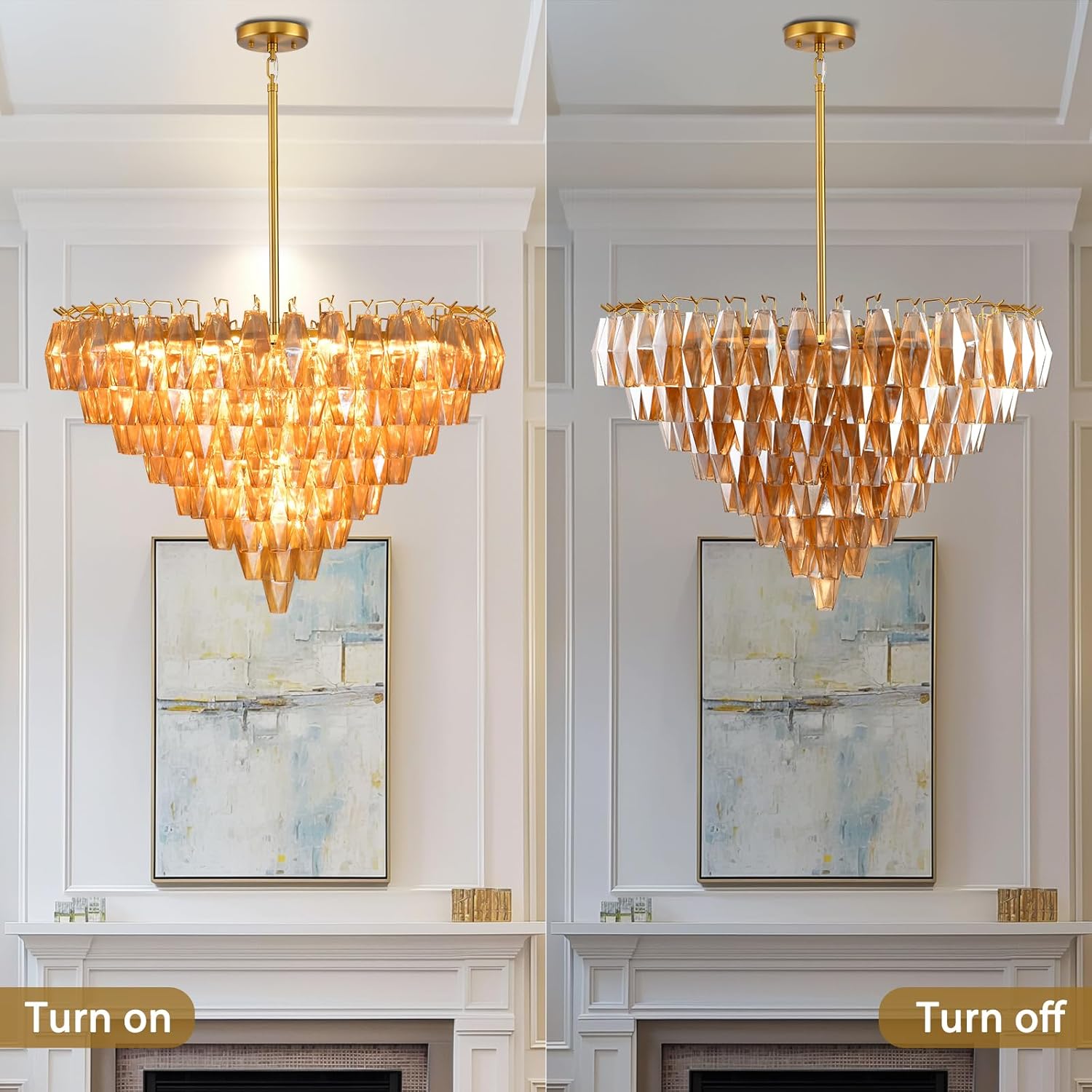 This 36" Amber Glass Round Chandelier features a distinctive amber glass design. The lampshade is made of amber glass polyhedron, suspending on a sleek metal frame, which creates a stunning blend of timeless elegance and classic luxury. The faceted glass pieces refract light at different angles, casting a warm, inviting glow. Whether your style is modern, farmhouse, or vintage, this Gold Chandelier For Living Room makes a striking centerpiece.