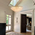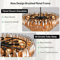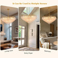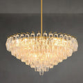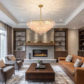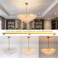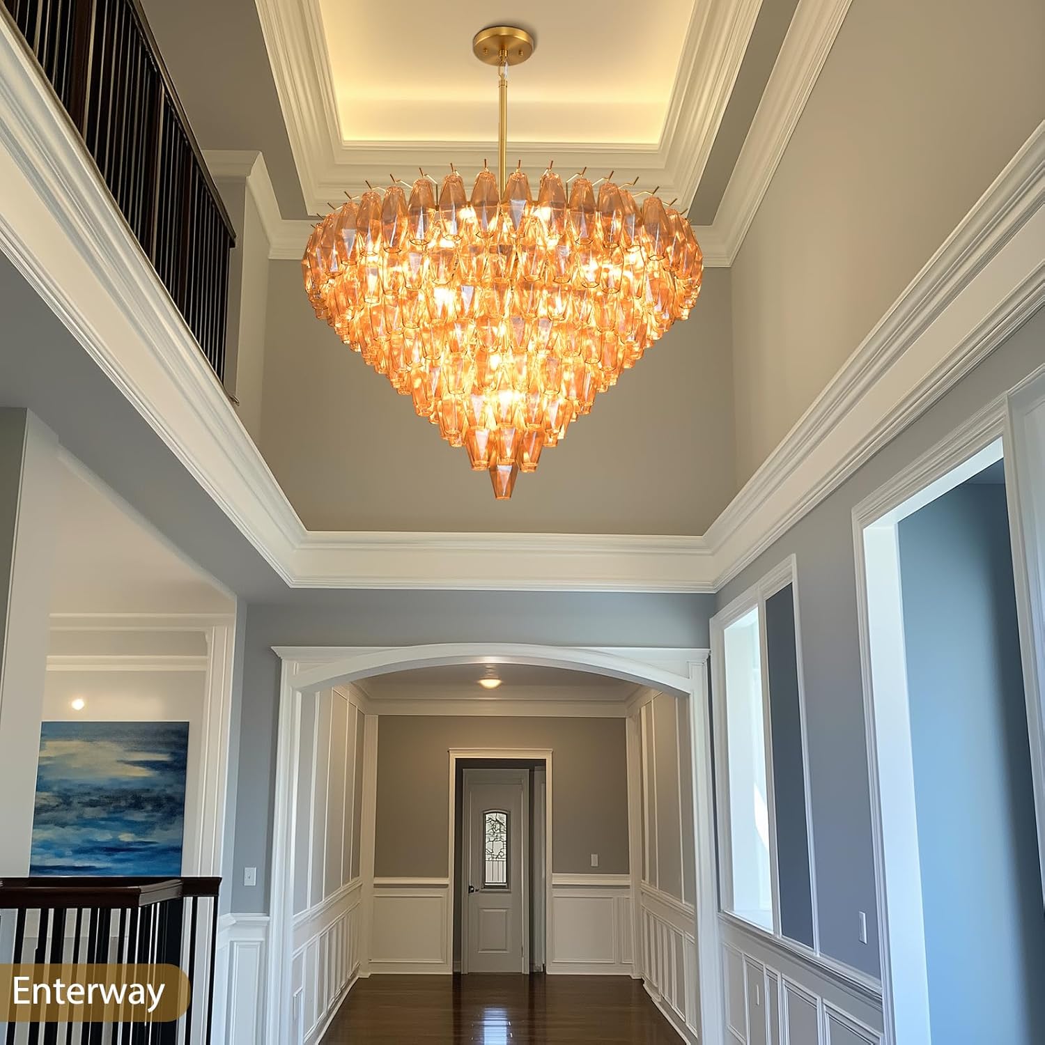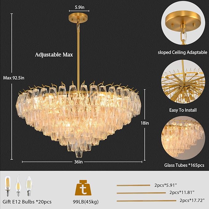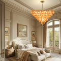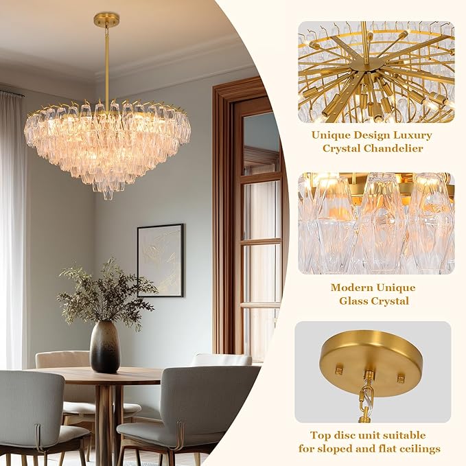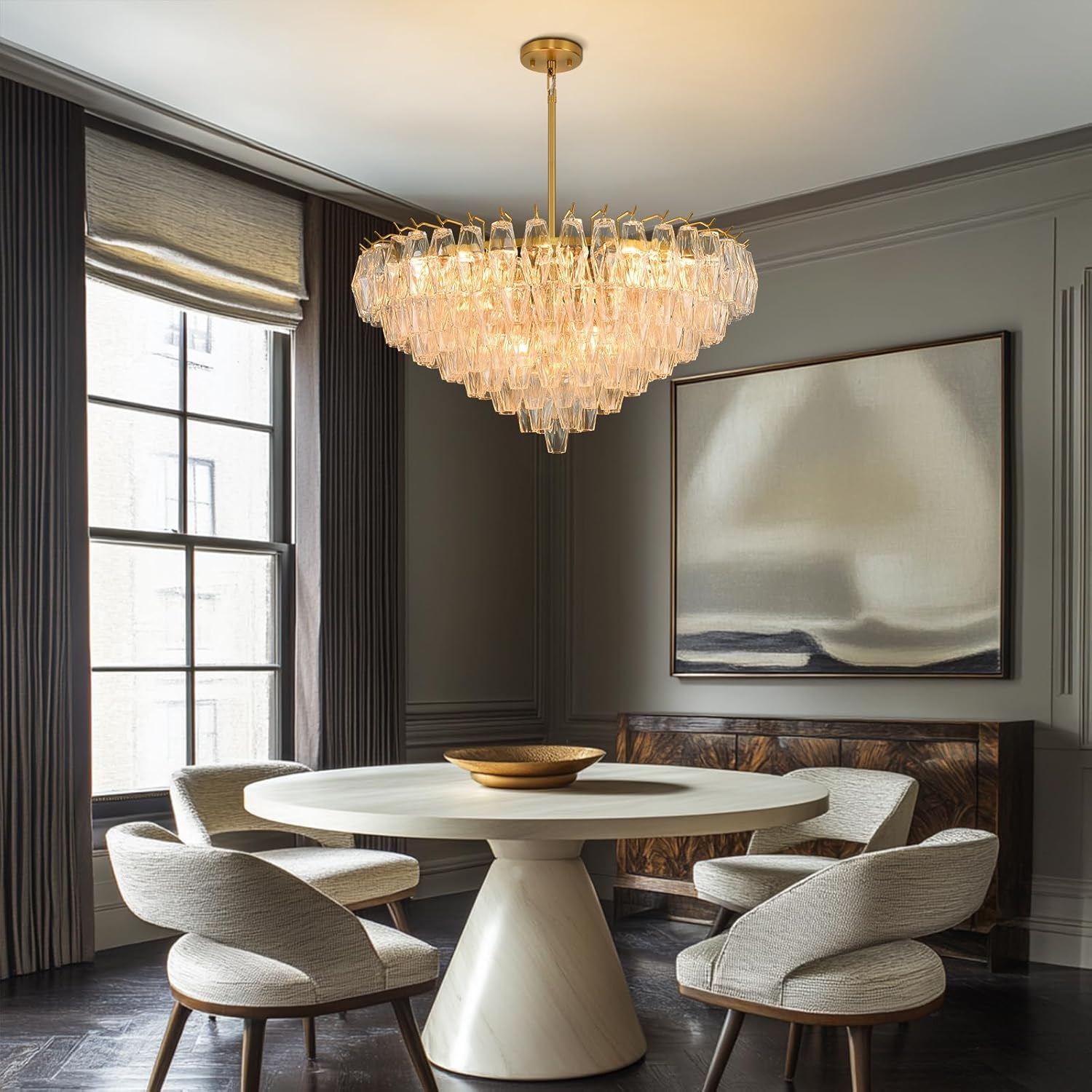 This 36" Amber Glass Round Chandelier features a distinctive amber glass design. The lampshade is made of amber glass polyhedron, suspending on a sleek metal frame, which creates a stunning blend of timeless elegance and classic luxury. The faceted glass pieces refract light at different angles, casting a warm, inviting glow. Whether your style is modern, farmhouse, or vintage, this Gold Chandelier For Living Room makes a striking centerpiece.