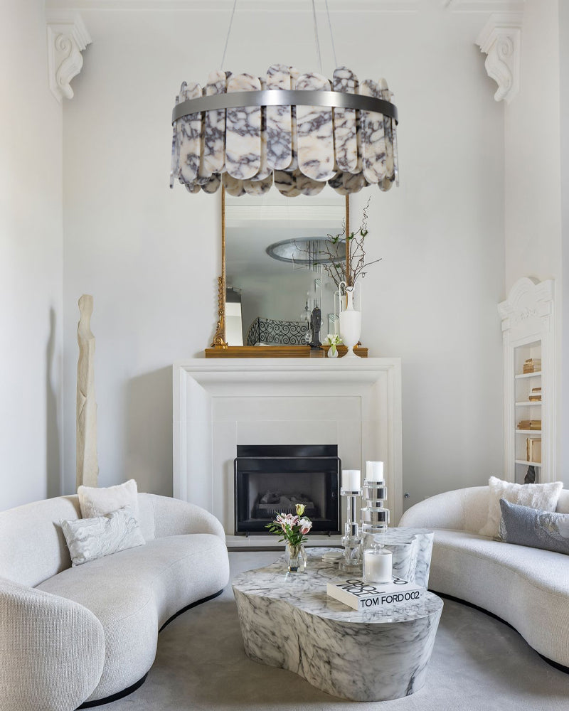 - Natural Spanish alabaster tiles set in luminous brushed Silver/Gold/Black.