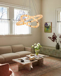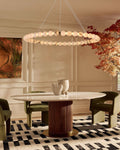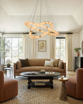 - Meticulously hand-strung with natural Spanish Alabaster on a gleaming metallic frame with organic texture.