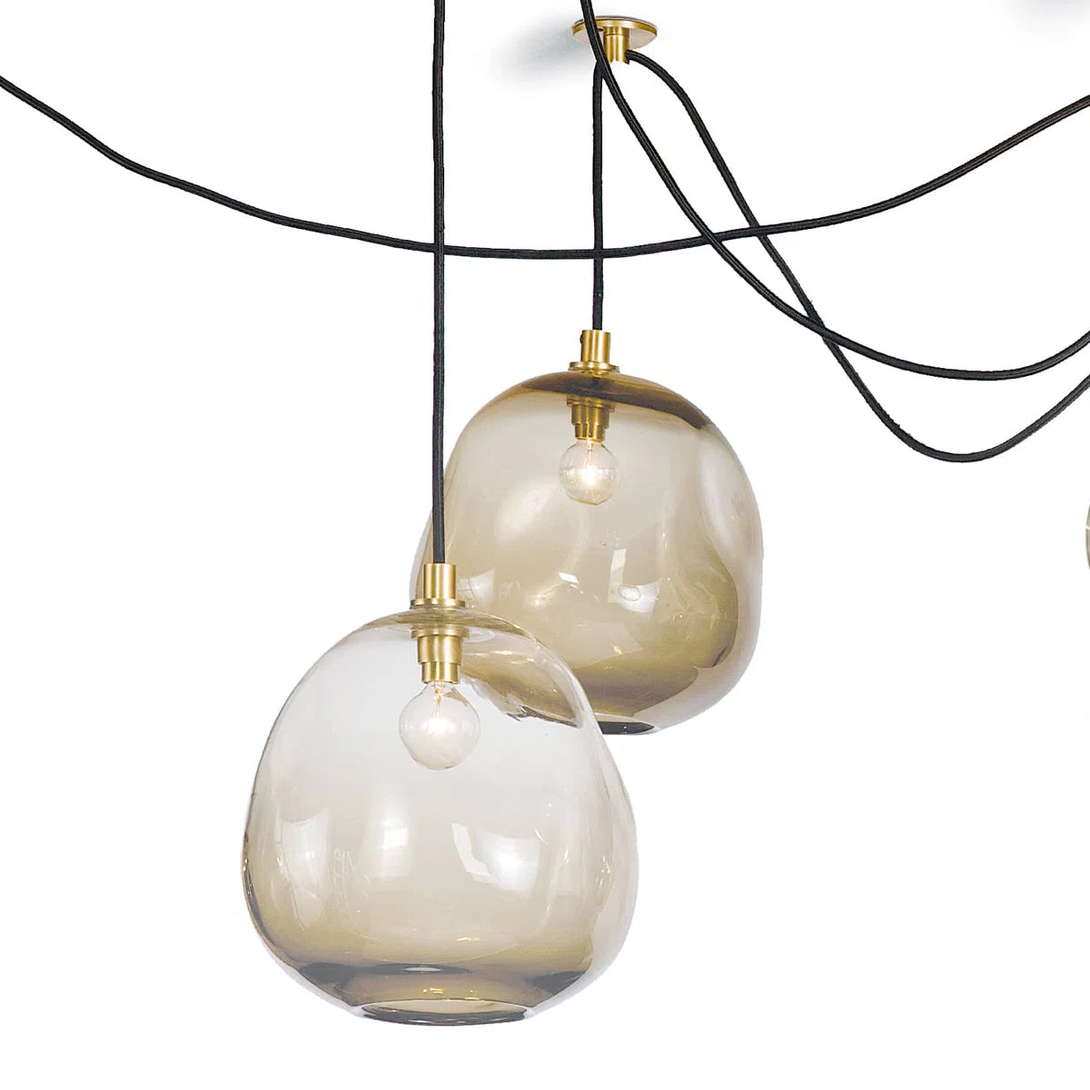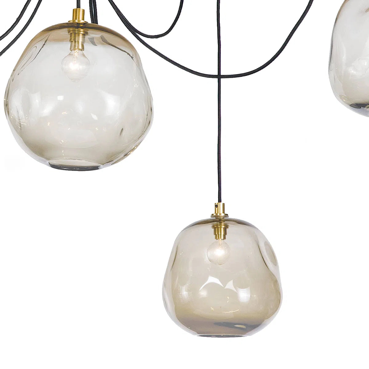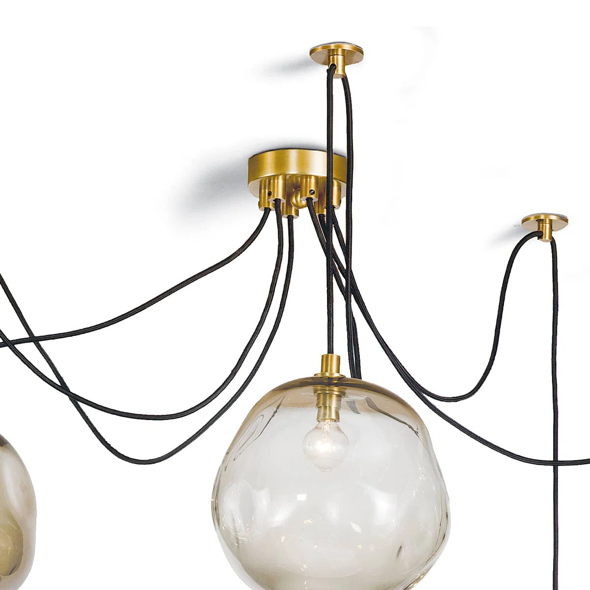 Molten glass has an inherent beauty because of its artisan-crafted, organic form. The natural glass shade variation creates dramatic light play and contrast, especially when combined with the modern appeal of its freeform black fabric cords and natural brass canopies. A true modern beauty, the Molten Spider chandelier is stunning in various configurations that suit your unique needs. Please place it in a kitchen, dining room, over a bed, or down a hallway for a dramatic lighting statement.