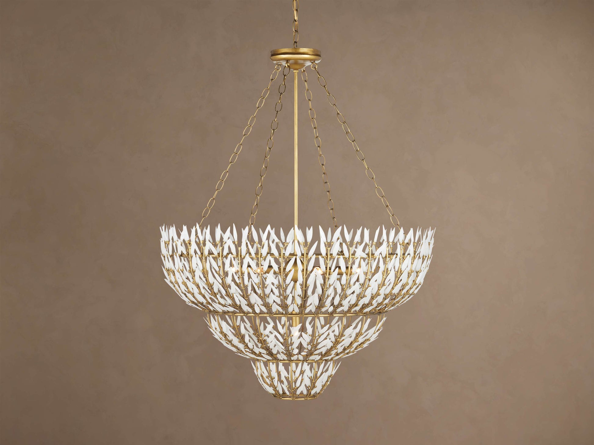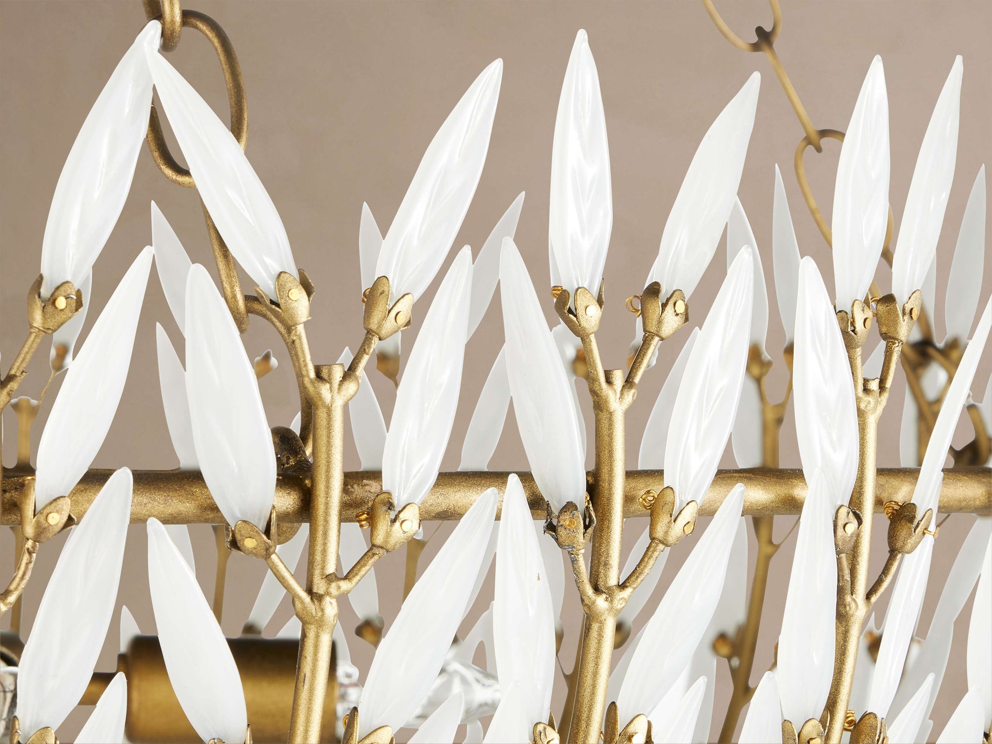 Our Morrigan Lighting Collection features vintage inspiration in three tiers of white glass leaves that fan across brass arcs—creating movement and subtle texture in an elevated, sculptural light.
