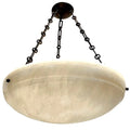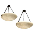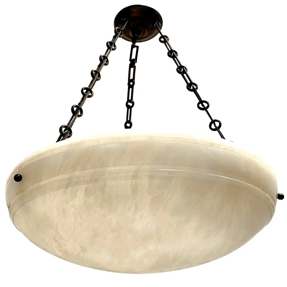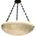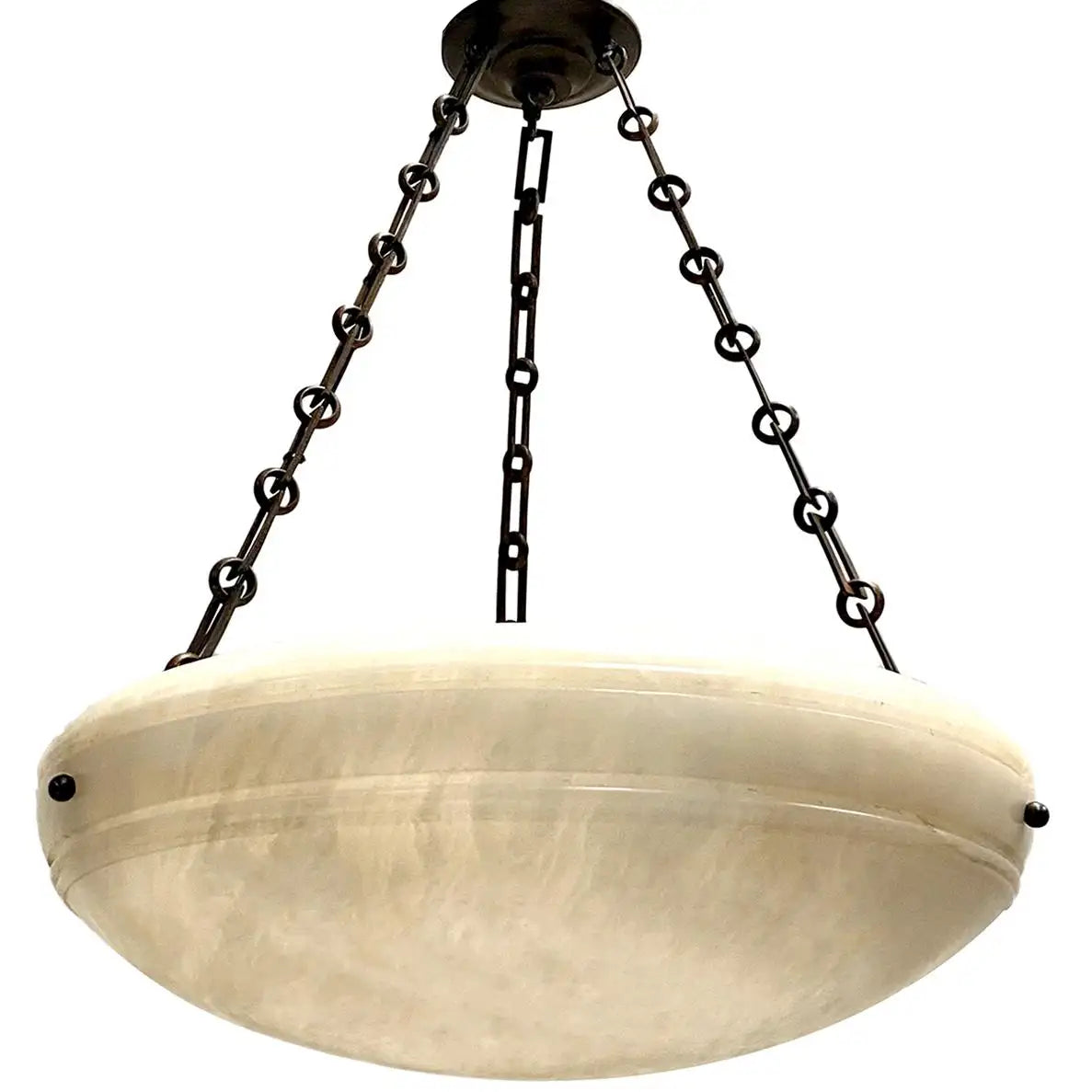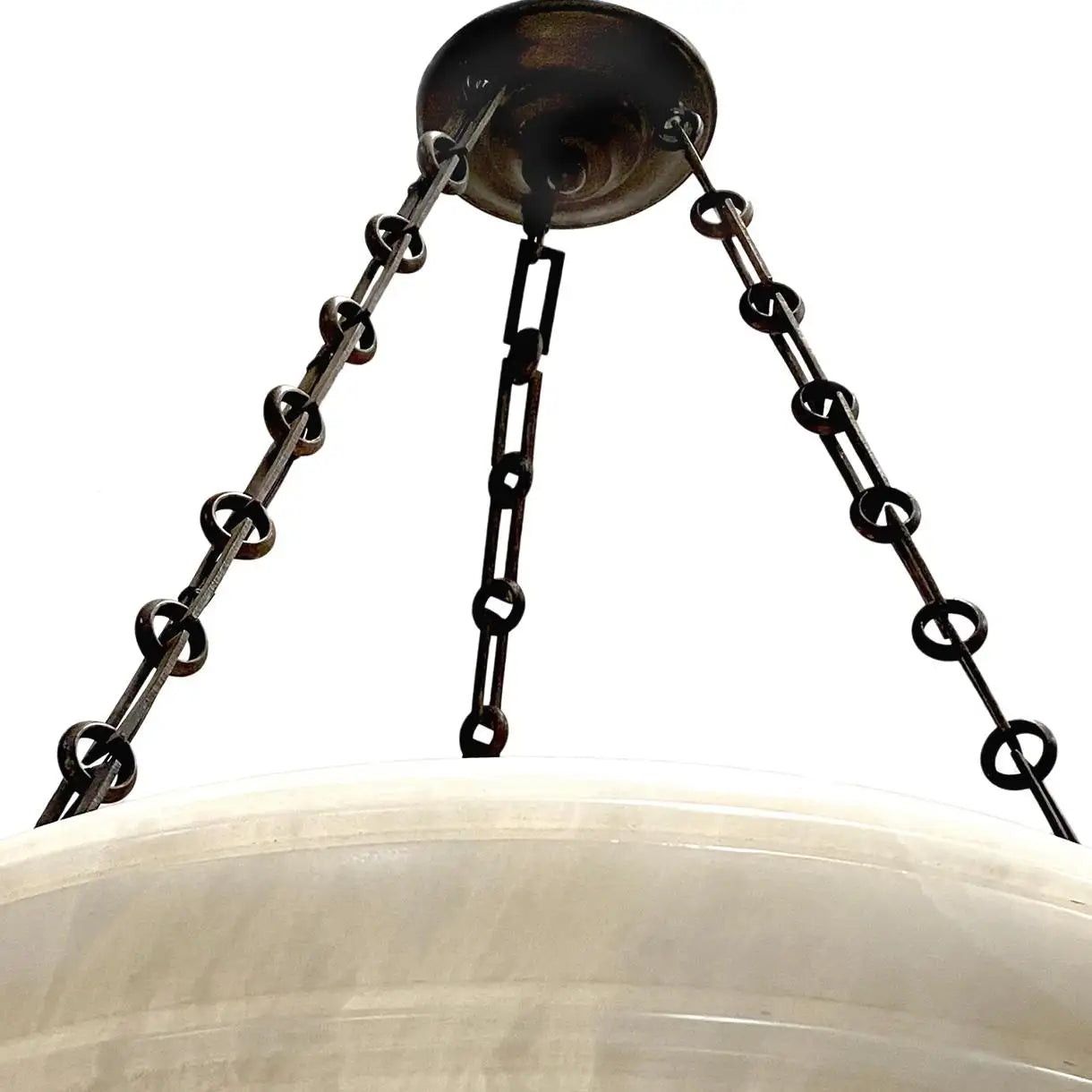 Pair of circa 1950's French carved alabaster light fixtures with 3 Edison interior lights and patinated bronze chain and canopy. Sold individually.