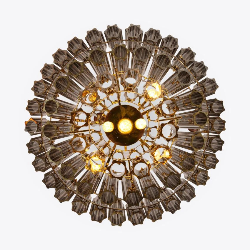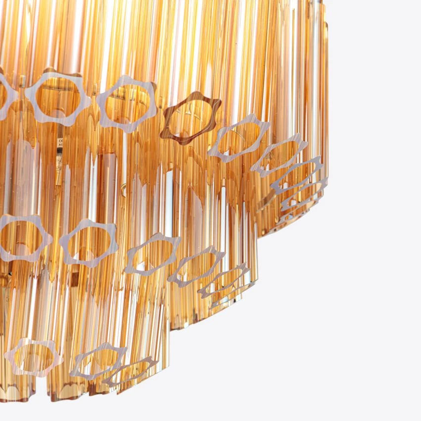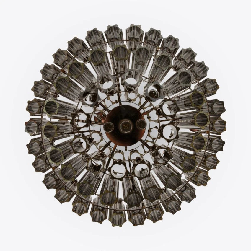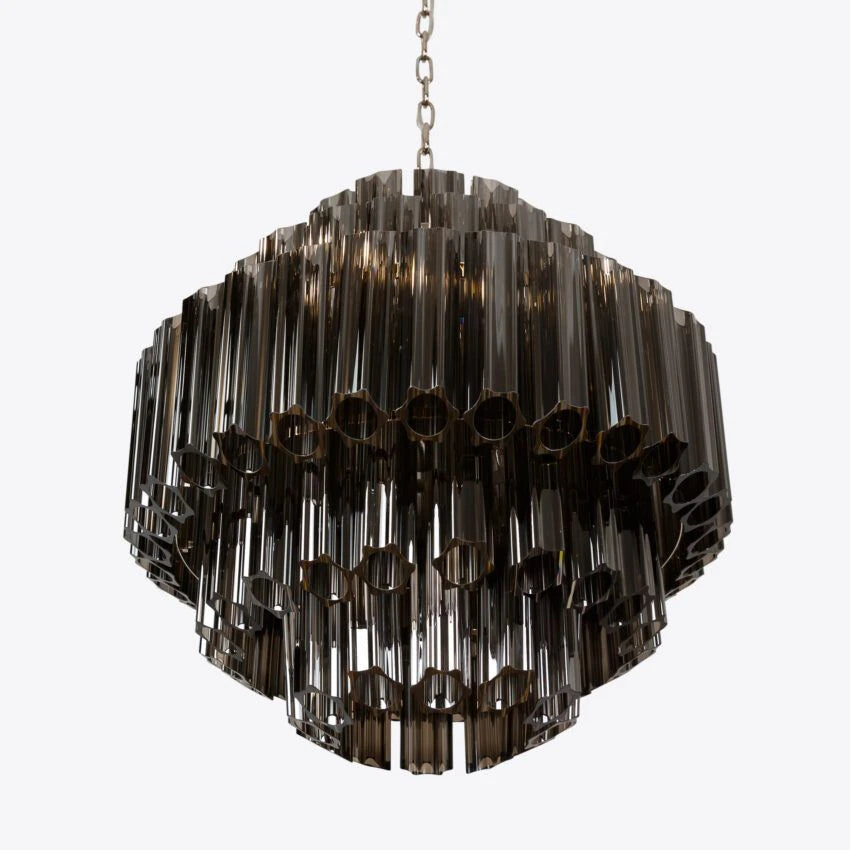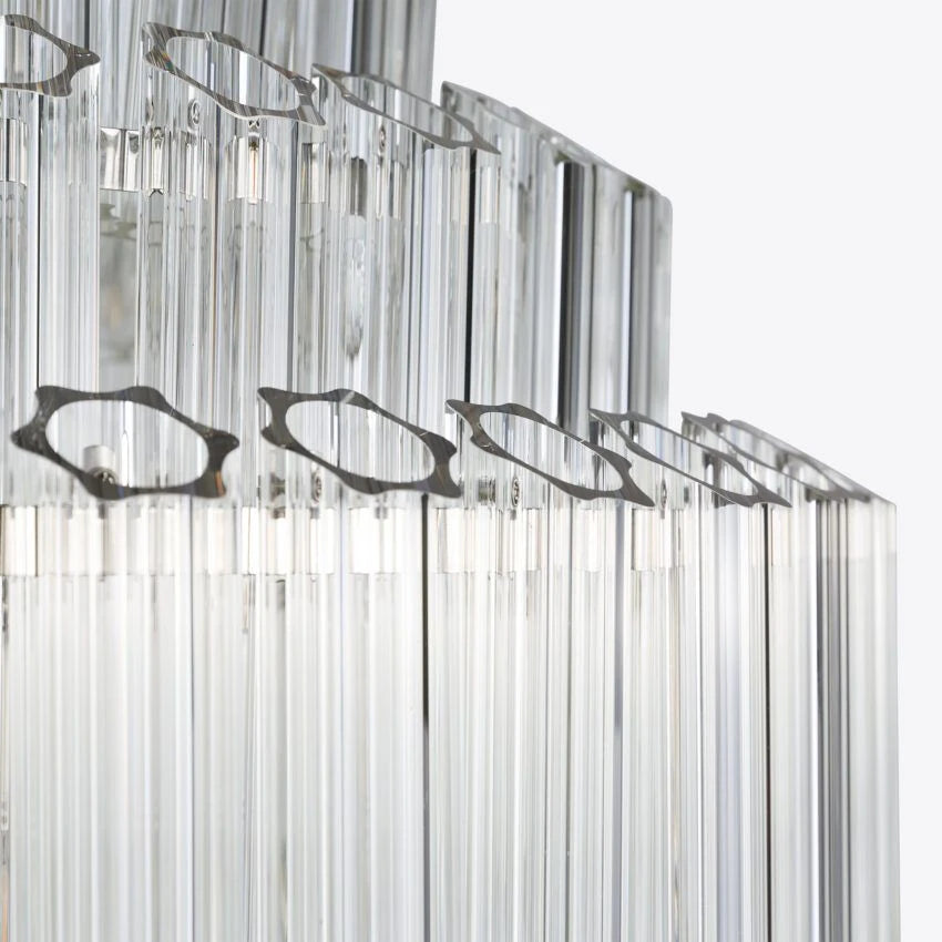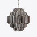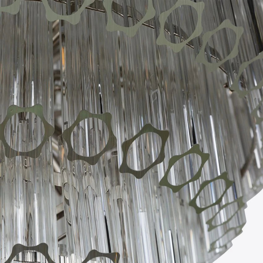The stunning 1970s-inspired glass Palermo Chandelier features a chrome-plated iron frame, with hexagonal glass tubes elegantly suspended at each level in a diamond formation.