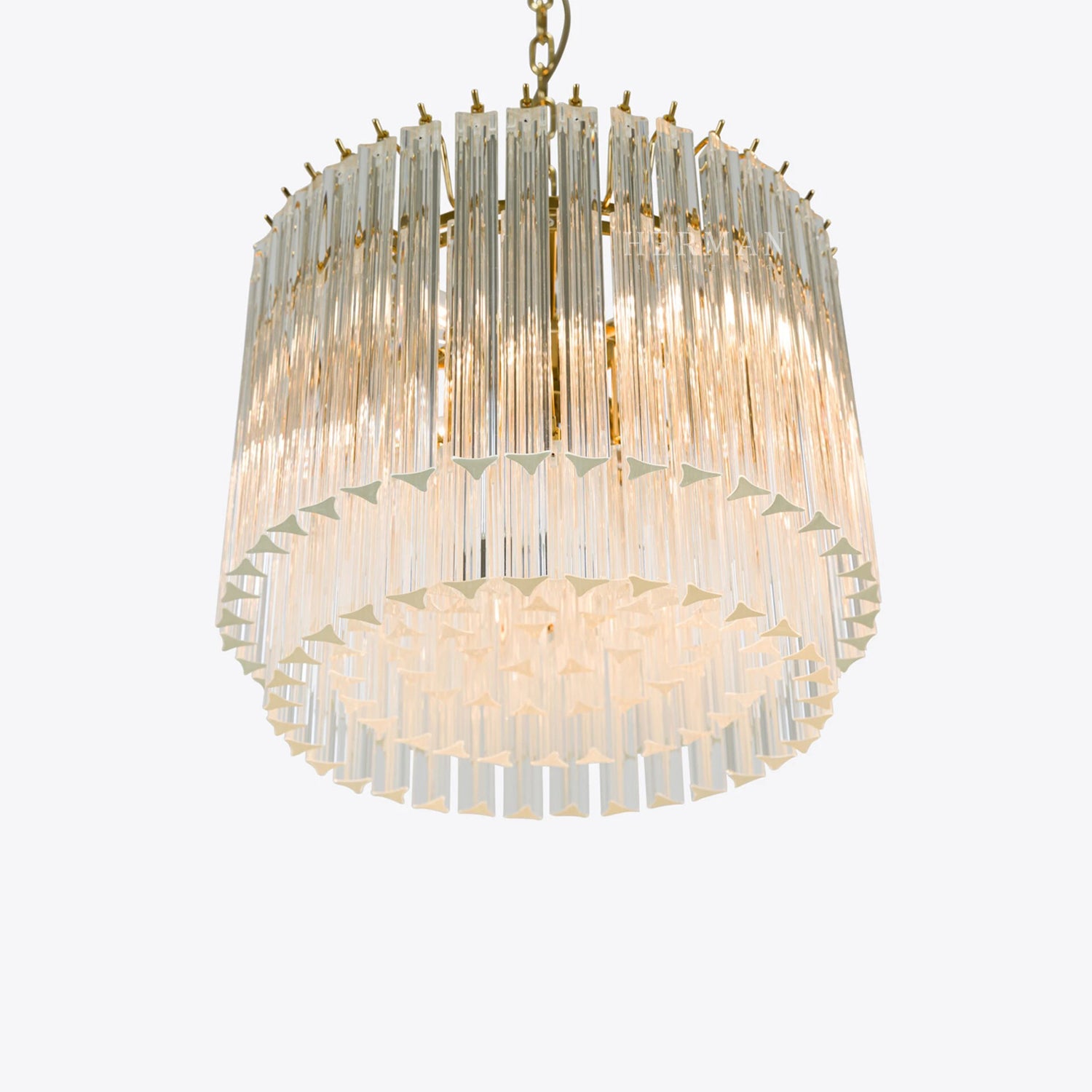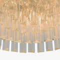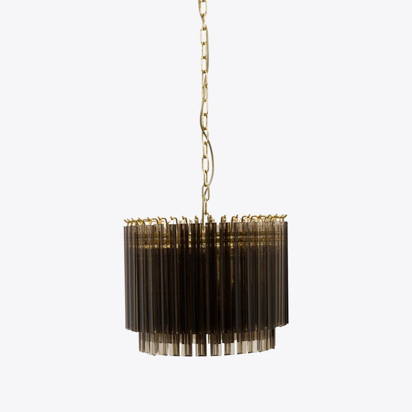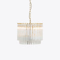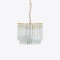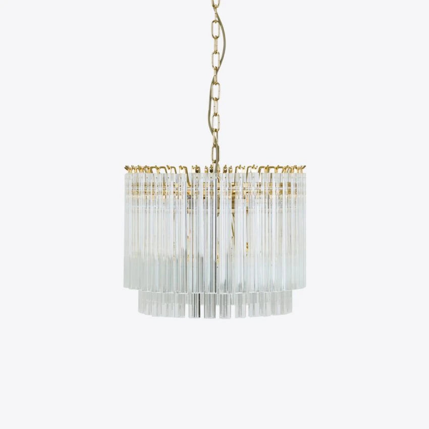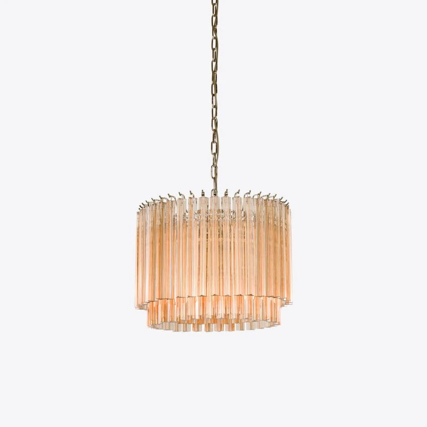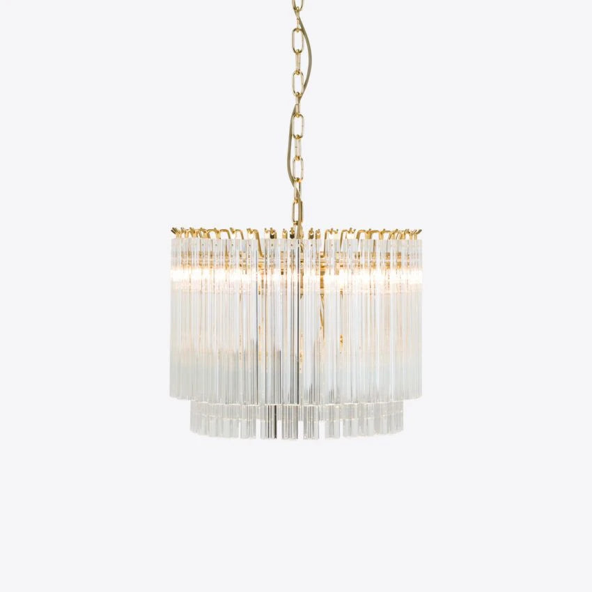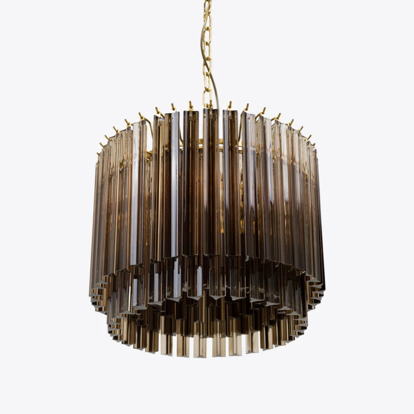 The Amaro chandeliers feature layers of mid-century inspired tri-style glass prisms, making them the ideal centerpiece for smaller spaces like living rooms, dining areas, or lobbies.